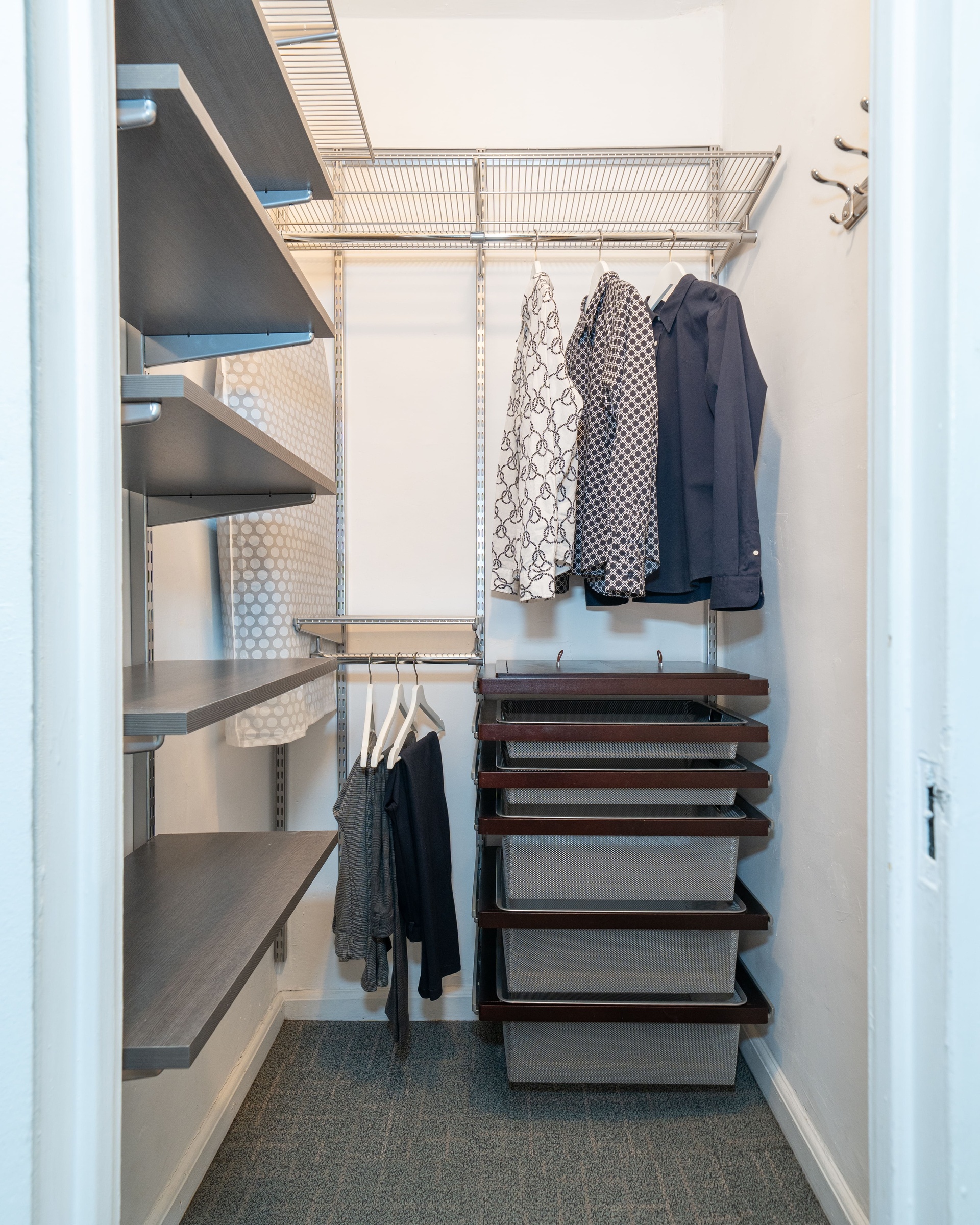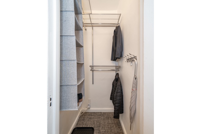 Inside, an expansive entry foyer boasts a huge coat closet and stunning art-deco archways, plus a charming built-in shelf. Beyond the foyer, a second closet cleverly houses a soundproofed work area, perfect for a home office, recording studio, or reading nook.