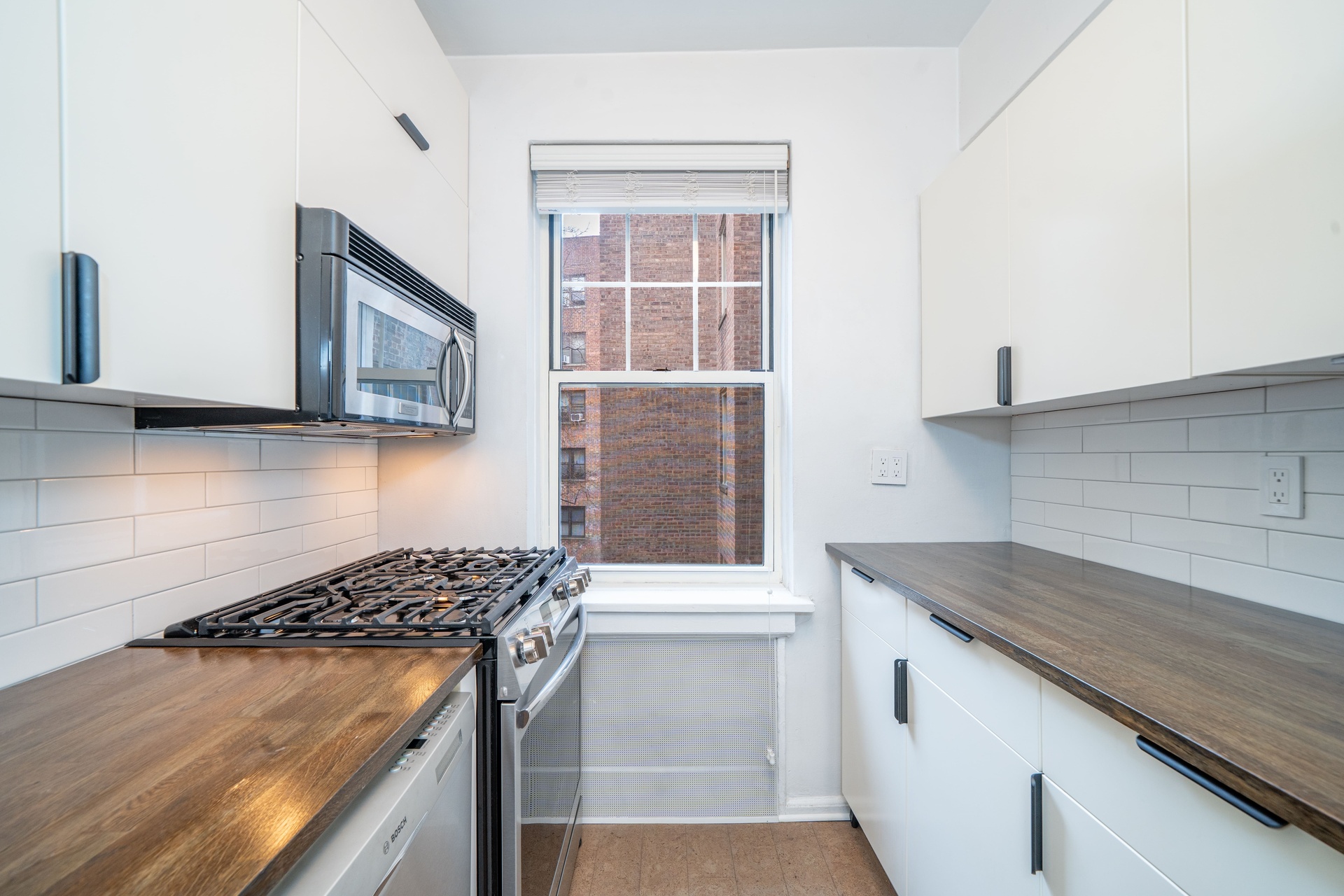 The main living area seamlessly extends into the formal dining room, making it ideal for entertaining. This space then flows into a modern, fully renovated kitchen. The kitchen boasts classic white subway tiles, food-safe butcher-block countertops, and a deep farmhouse sink, complemented by white double-stacked cabinets and stainless steel appliances, including an extra-quiet Bosch dishwasher.