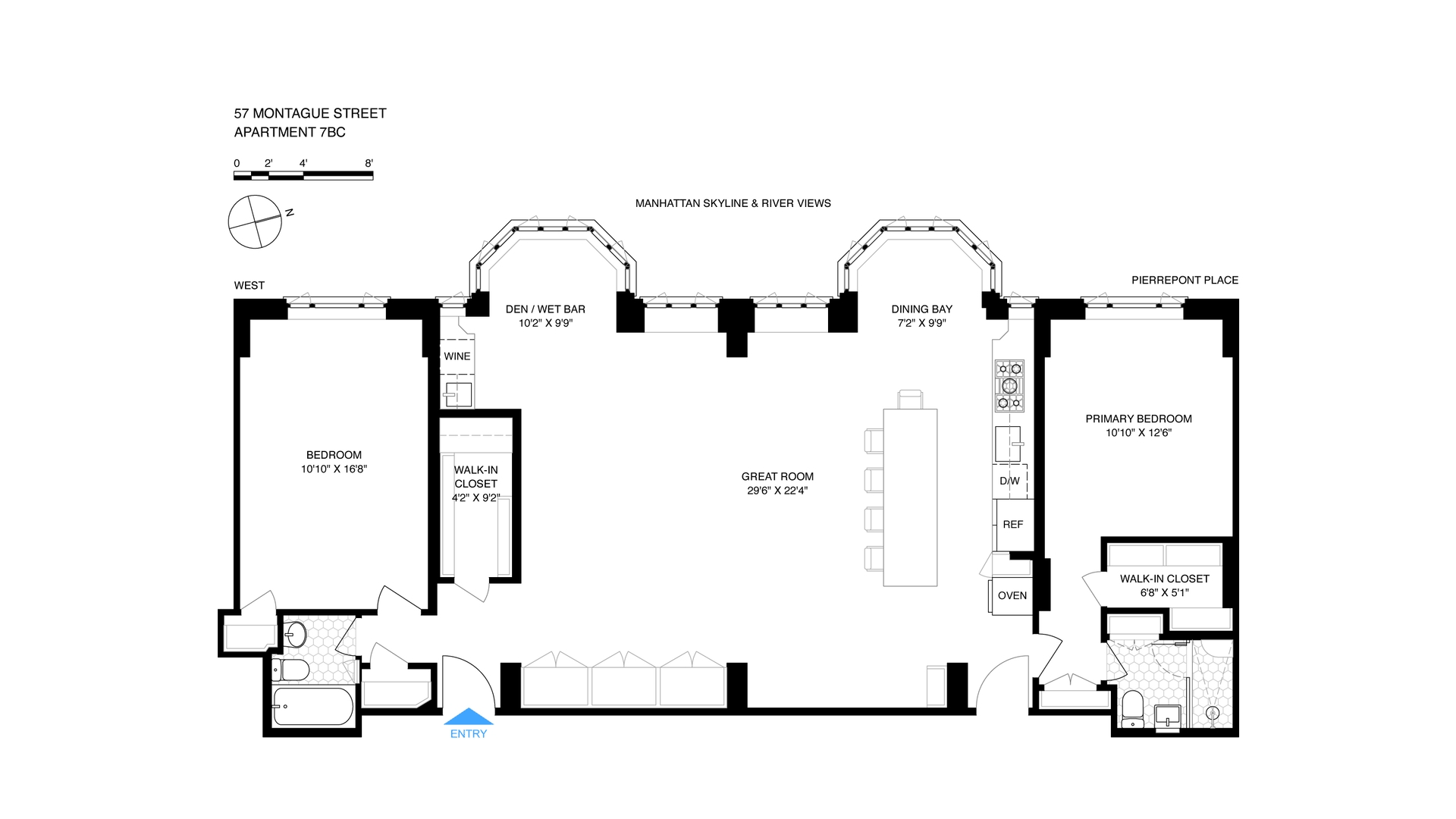 Indulge in the epitome of Brooklyn Heights living with this grand two-bedroom gem nestled in the prestigious Breukelen building on Montague Street. Offering views of the iconic Manhattan skyline, the Brooklyn Promenade, and the Statue of Liberty, this unique residence invites you to experience tranquility in the heart of the city. Step into the apartment through an inviting entry foyer, leading you into the majestic living room (29'6" by 22'4"). Bathed in natural light streaming through casement windows, this space boasts charm and elegance. The custom kitchen, featuring a large bespoke island with Quartz countertops, sets the stage for hosting unforgettable gatherings. Whether you're throwing parties, enjoying dinners in the bay alcove, or conducting wine tastings from your personal wet bar, the panoramic views of Pierrepont Place and the Manhattan skyline provide a breathtaking backdrop. This meticulously designed home offers an abundance of storage, beautiful parquet floors, and a thoughtfully crafted open kitchen. When it's time to unwind, retreat to one of the two split bedrooms. The primary suite, complete with a spacious walk-in closet and en-suite bathroom adorned in marble tiles and Toto fixtures, offers a luxurious sanctuary. The oversized second bedroom with its own bathroom can easily accommodate a King-sized bed and an office area. Additional features include a spacious pantry, built-in closets, bookshelves.