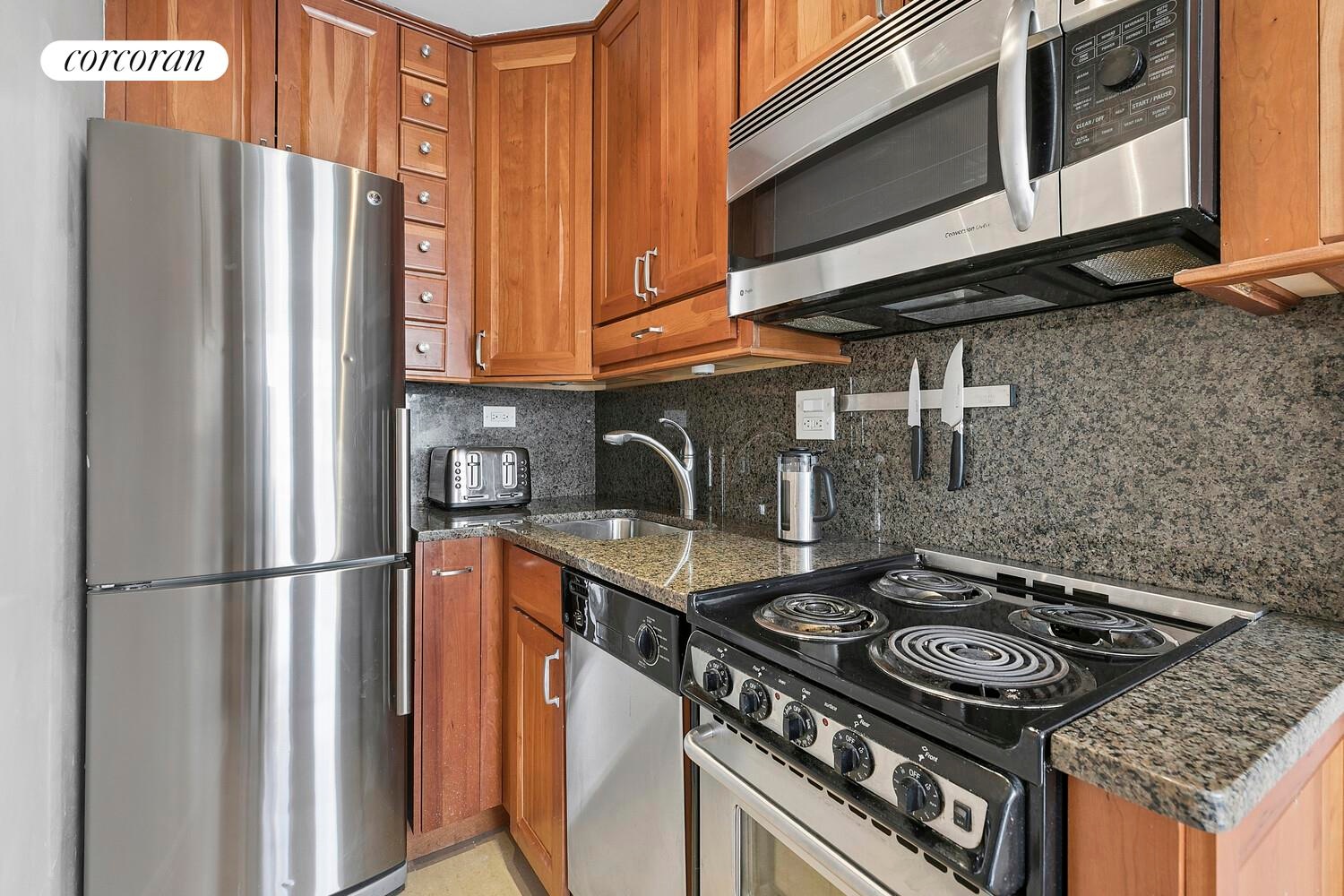 Ready for immediate move-in, this charming turn-of-the-century brownstone apartment has been freshly painted and thoughtfully updated throughout. The kitchen features granite countertops and backsplash, cherry wood cabinetry, and GE stainless steel appliances, including a refrigerator, dishwasher, electric range, and microwave.