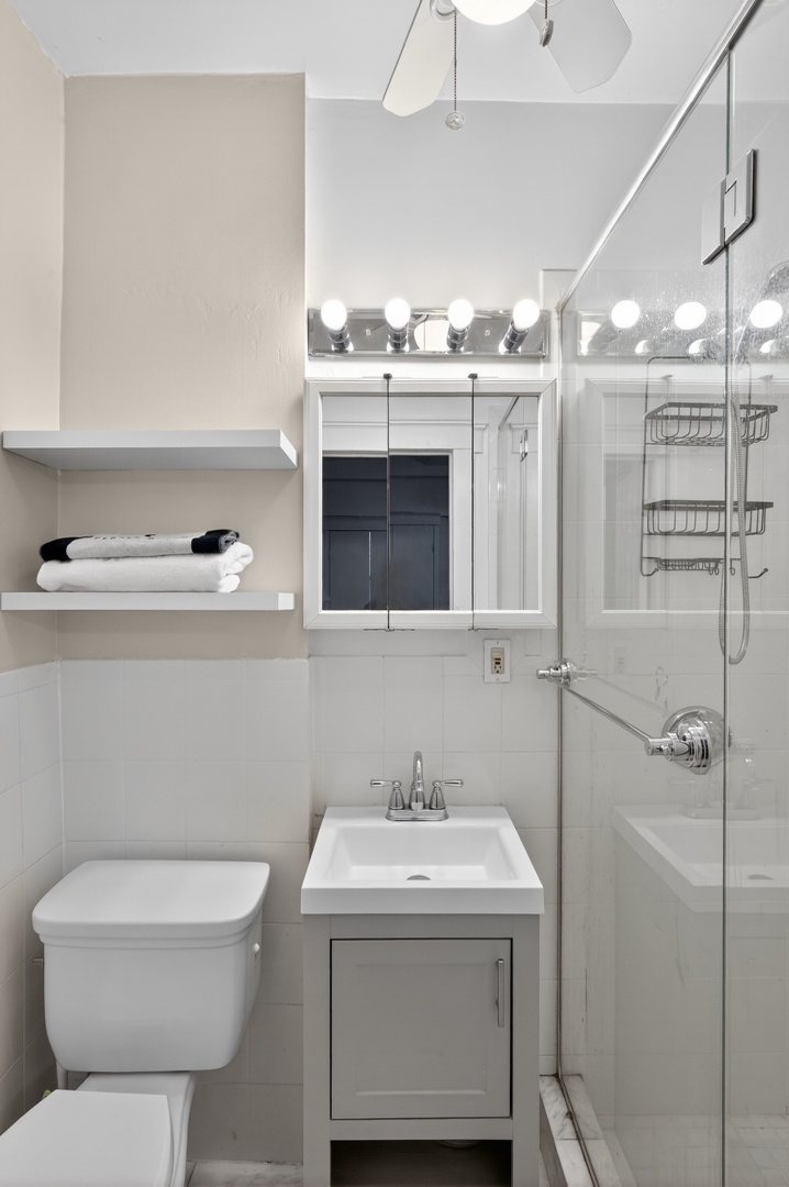 The thoughtfully arranged layout includes a separate alcove sleeping area with a door, offering privacy and the feel of a true one-bedroom. The kitchen is outfitted with contemporary appliances, including a dishwasher and convection oven, making it both efficient and convenient for everyday use. The renovated bathroom features a sleek stand-up shower and clean, modern finishes.