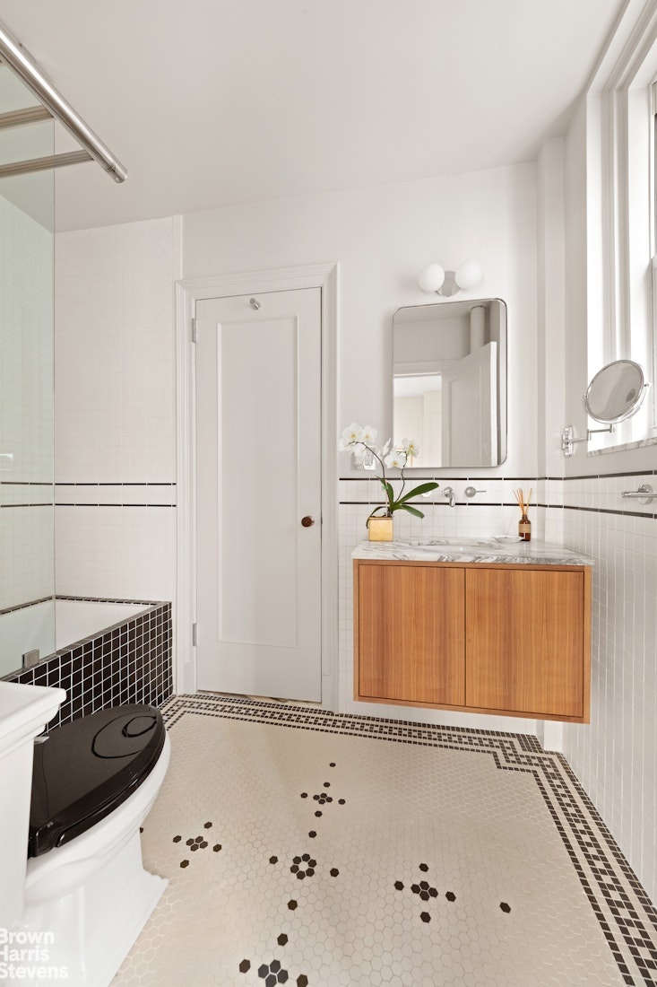 The primary suite is a quiet retreat with excellent light, generous proportions, custom molding, and two walk-in closets. The corner second bedroom offers dual exposures, open city views, and equally generous proportions. Both bedrooms share a beautifully finished bathroom with mosaic tilework, a walnut vanity, Grohe fixtures, and a deep soaking tub with glass enclosure. A powder room serves the entertaining spaces with equal care.