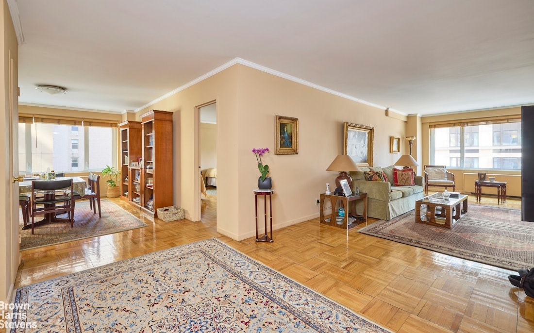 to what is currently a Formal Dining Room with lovely East city views and North to the building's courtyard. This large space can easily be converted into a 3rd Bedroom or a Den.