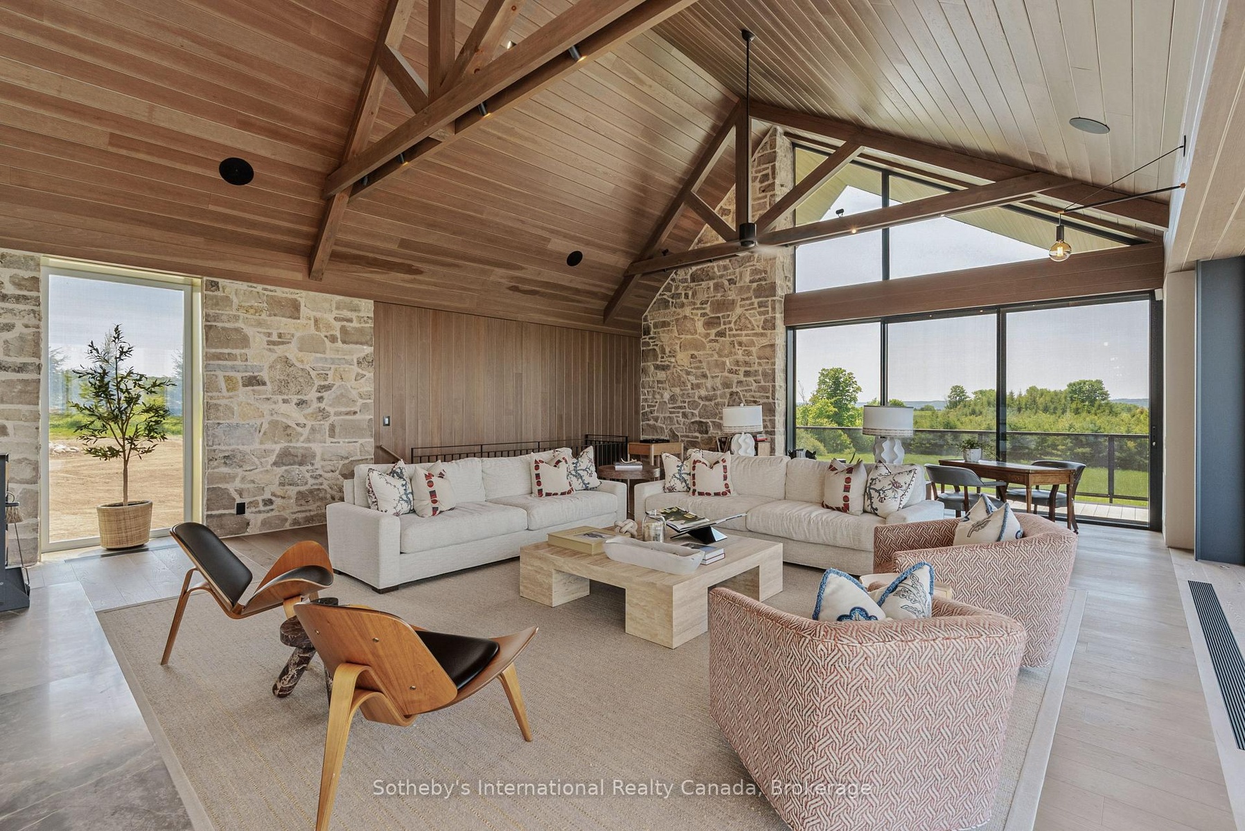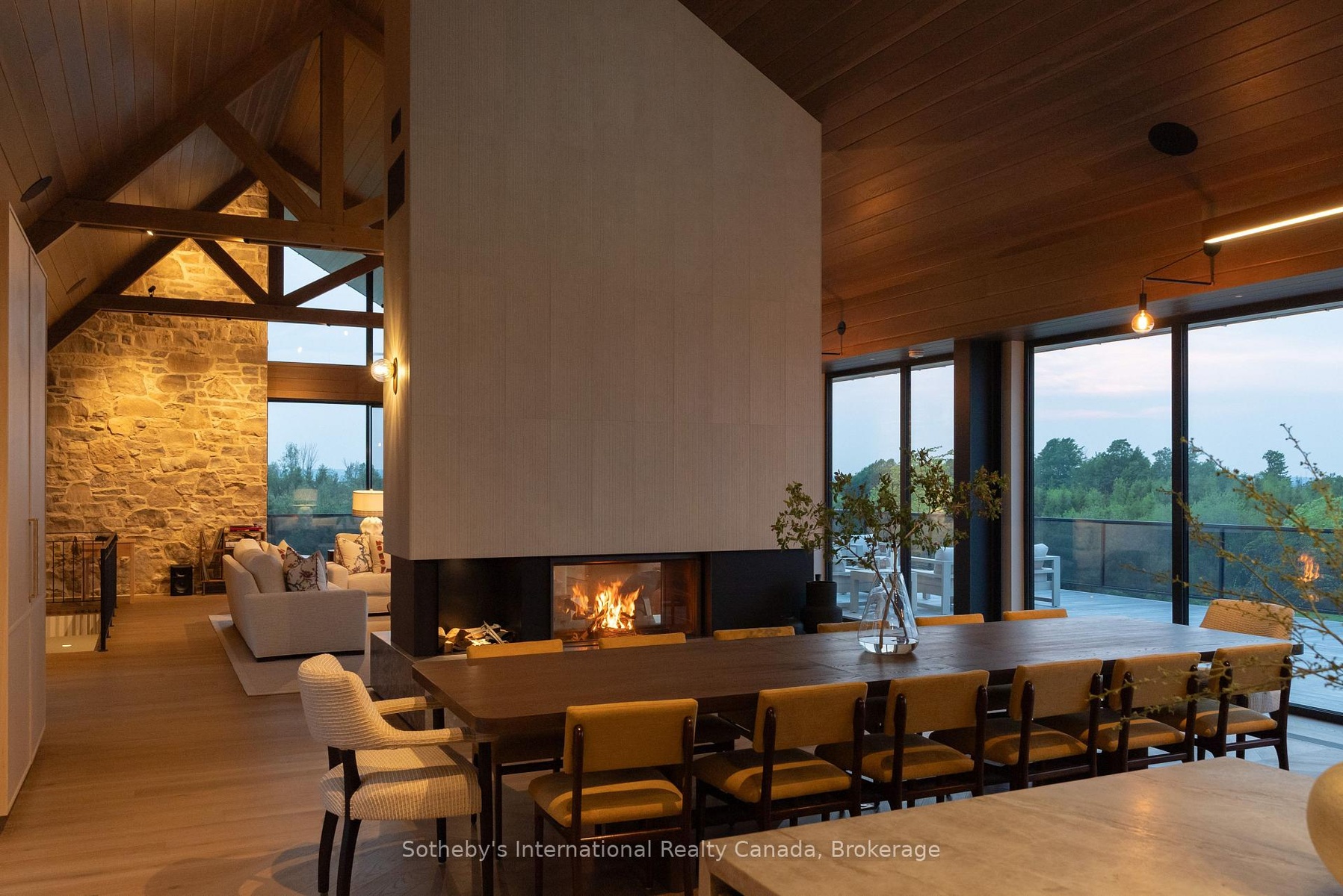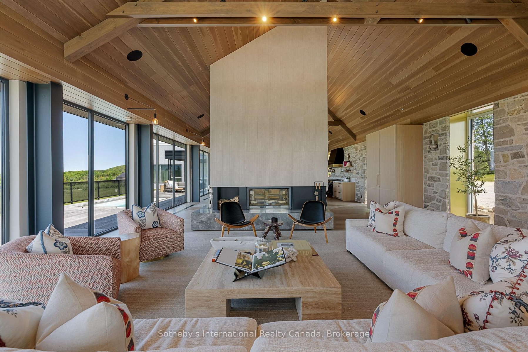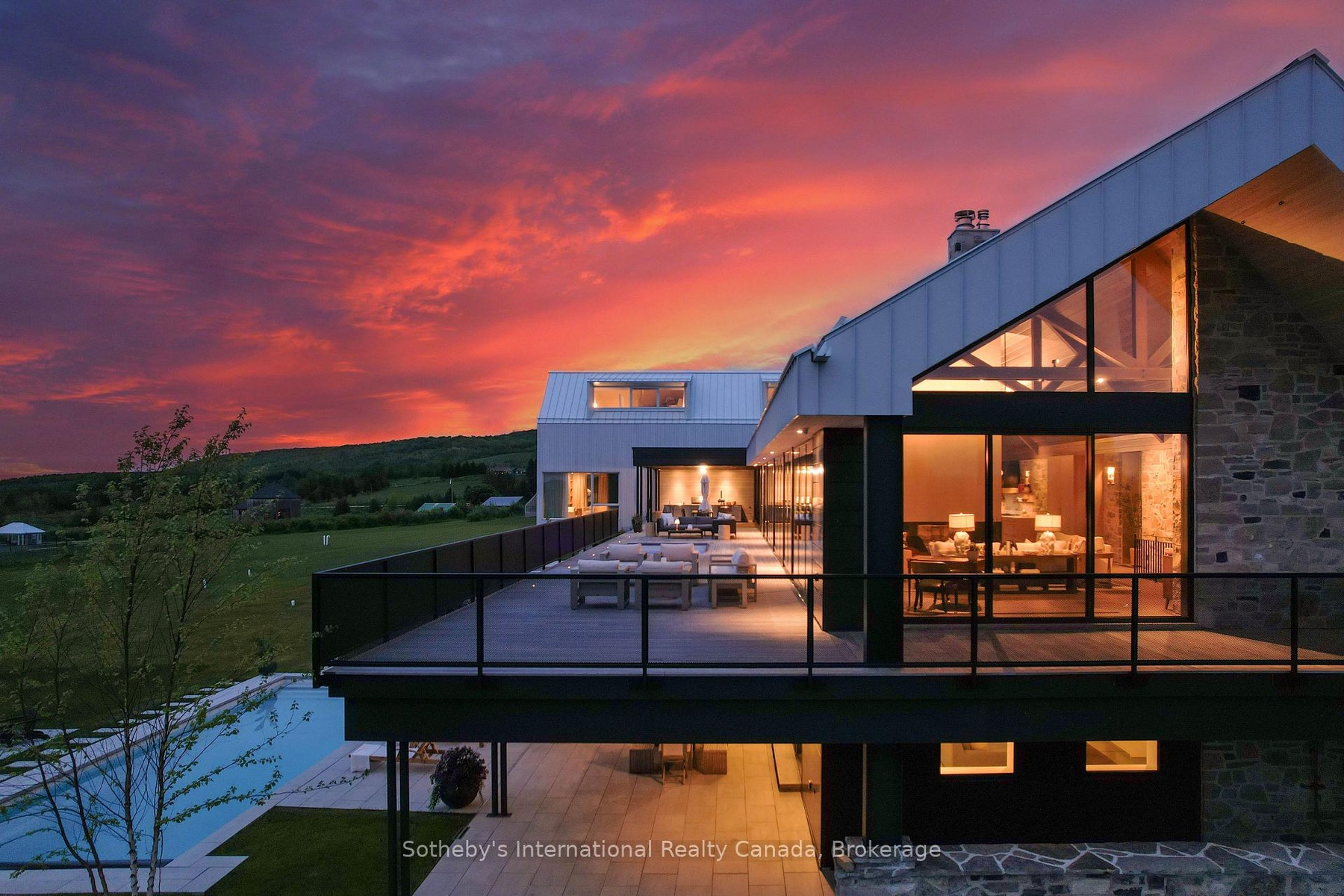 Never has there been an offering quite like this in the Blue Mountains. Welcome to Georgian Valley Farm, where world-class design meets the unspoiled beauty of nature and breathtaking sunsets. Set on 37 spectacular acres, this one-of-a-kind estate is anchored by an extraordinary 11,000 sq ft custom residence - a design landmark by Post Architecture Inc. and built by renowned builder David Eaton, Baylyn Construction. This property defines luxury recreational living, w/saltwater pool, Har Tru clay tennis court, orchard, pond, a Hartley Botanic Greenhouse - 'Grand Manor' imported from the UK and an incredible restored barn, ideal for entertaining. Perched high on 7th Line, the home presents commanding, panoramic views of the Niagara Escarpment and Georgian Bay from nearly every room. Scandinavian-inspired minimalism blends with refined country elegance, w/ Moncer European oak floors, soaring wood-clad ceilings, and a wall of floor to ceiling windows by Atek that frame the landscape. Chef's kitchen features a 12-ft marble island, appliances by Miele, Sub-Zero, and Lacanche, custom Barlow millwork, exquisite stonework and full butler's pantry. The dining room for 14 includes a concealed Barlow bar and a striking 2-way woodburning STUV fireplace shared with the living room. Thoughtful details are found throughout w/ designer lighting, imported tiles and hand-painted De Gournay wallpaper in the adult lounge, library, and powder room. A main floor primary sits behind double Egyptian doors and features a gas fireplace, luxurious ensuite, WIC, and sitting area. 4 upper bedrooms, all uniquely designed, feature beautifully curated ensuites with extensive tile/marble finishes, custom millwork and WIC. The lower level offers a golf simulator, gym, sauna, rec room, refreshment area, 200+ bottle Rosehill Wine Cellar, and w/o to the covered terrace and pool. Exceptional outdoor living offers a 2,520 sq ft deck, with a full Crown Verity kitchen, dining & lounge areas, and a hot tub.