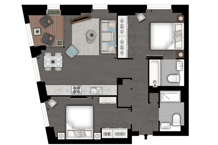 The sleek, fully fitted kitchen is equipped with high-spec integrated AEG appliances, seamlessly blending with the reception space. The apartment further comprises two well-proportioned double bedrooms, including a principal bedroom with en-suite bathroom, alongside a second contemporary bathroom and ample built-in storage throughout.