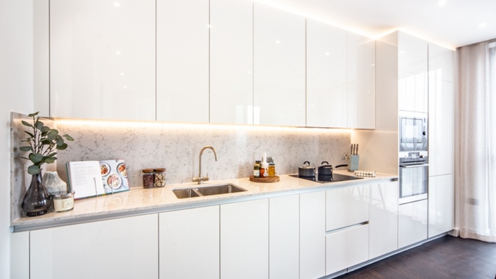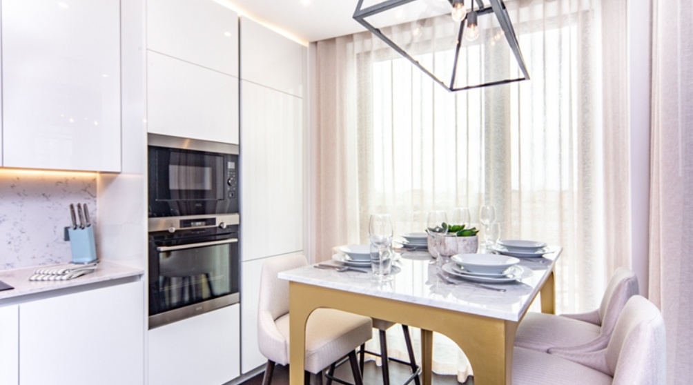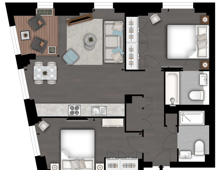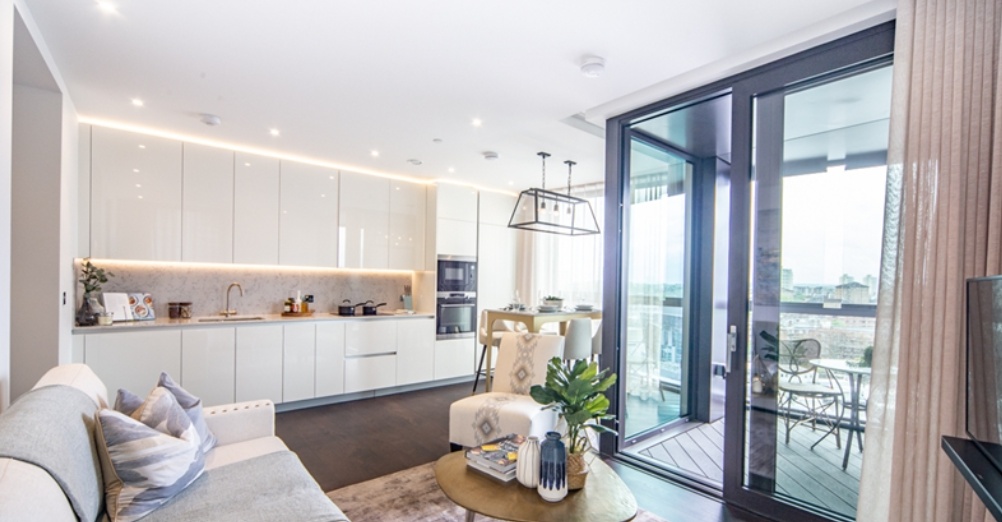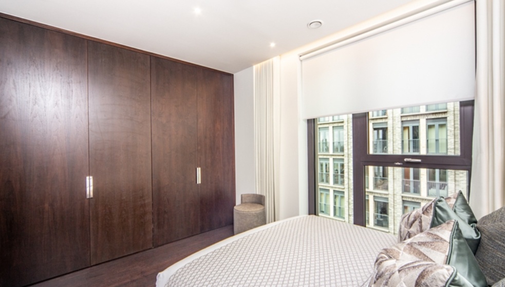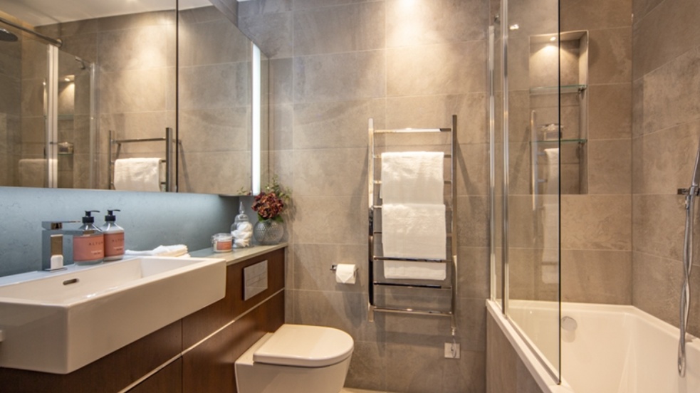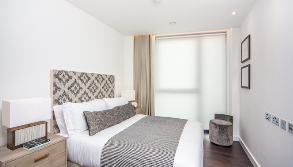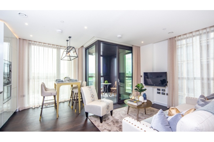 The sleek, fully fitted kitchen is equipped with integrated AEG appliances and flows seamlessly into the reception room. The apartment comprises two well-proportioned double bedrooms, including a principal bedroom with en-suite bathroom, alongside a second modern bathroom. Ample storage is thoughtfully incorporated throughout.