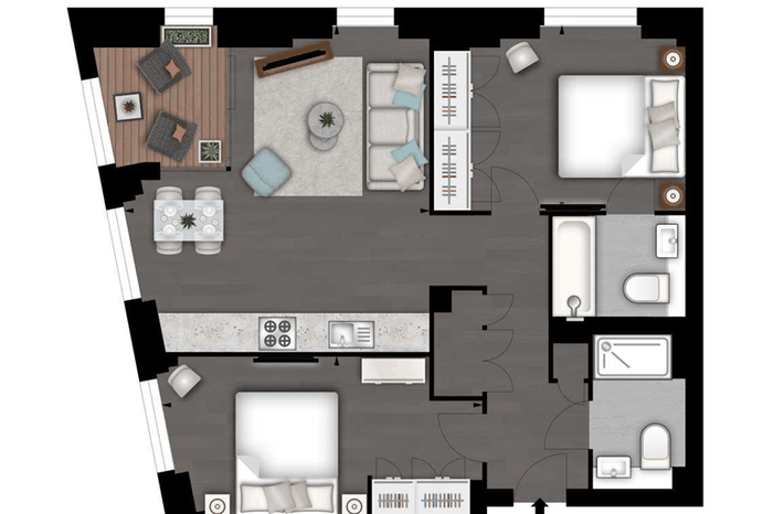 - Seventh floor two-bedroom apartment