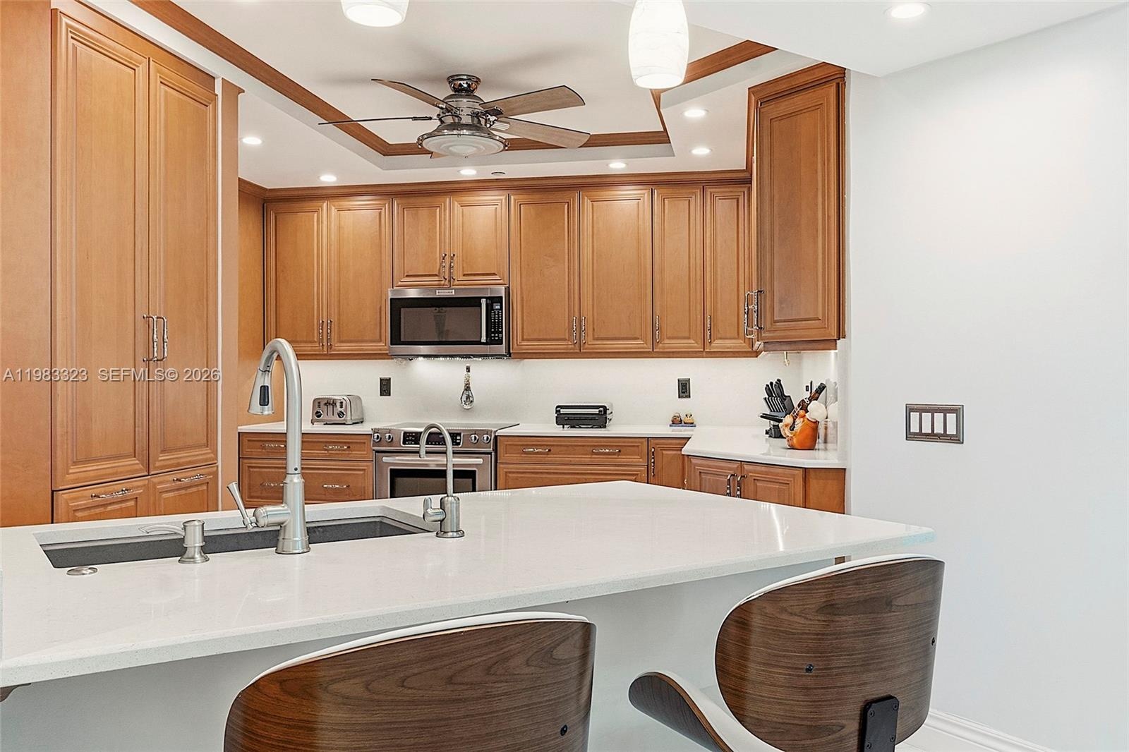 Meticulously maintained with a spacious open layout and private ocean-view balcony. Kitchen features Quarts counters, custom soft-close cabinetry, stainless steel appliances, and floor-to-ceiling pantry.