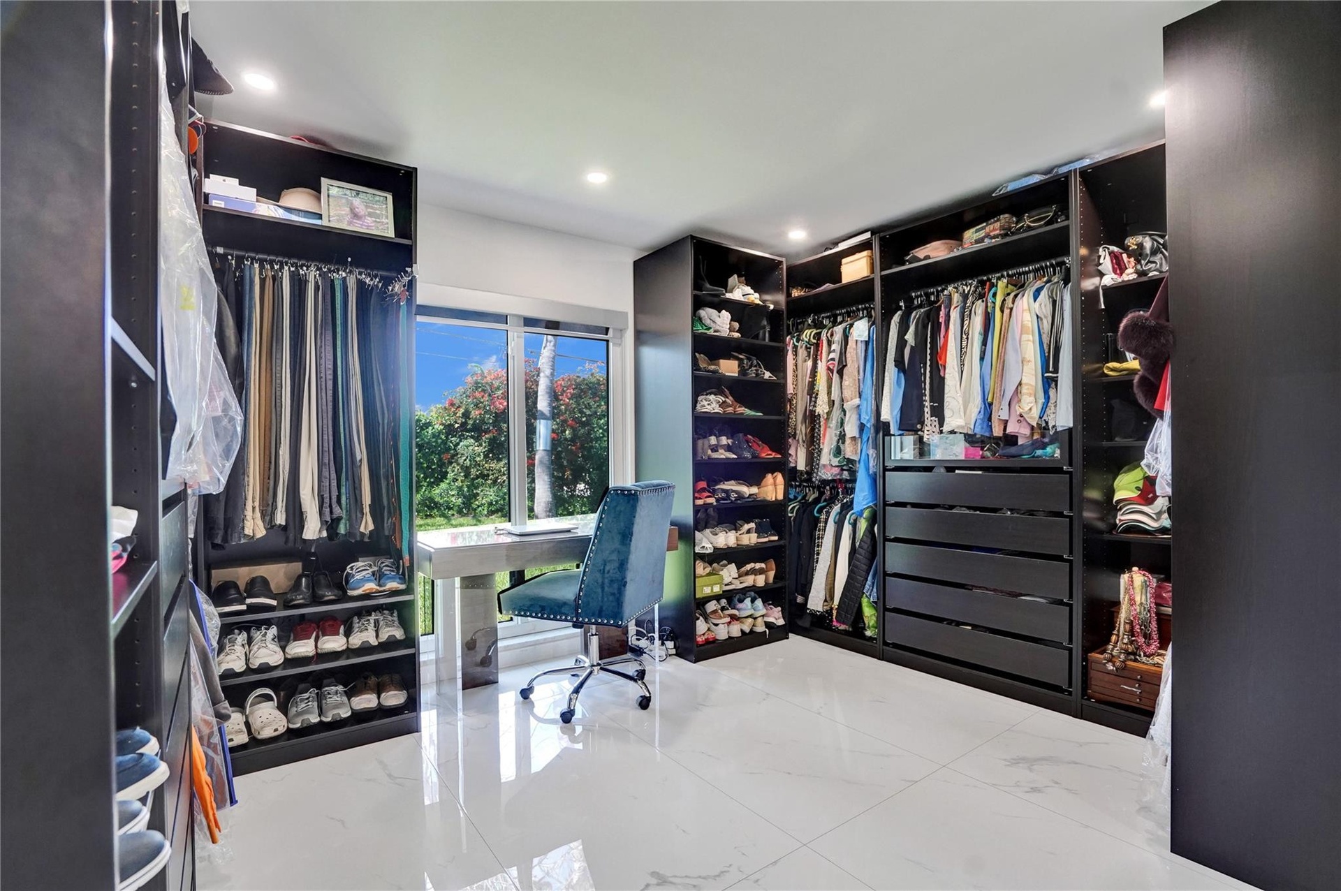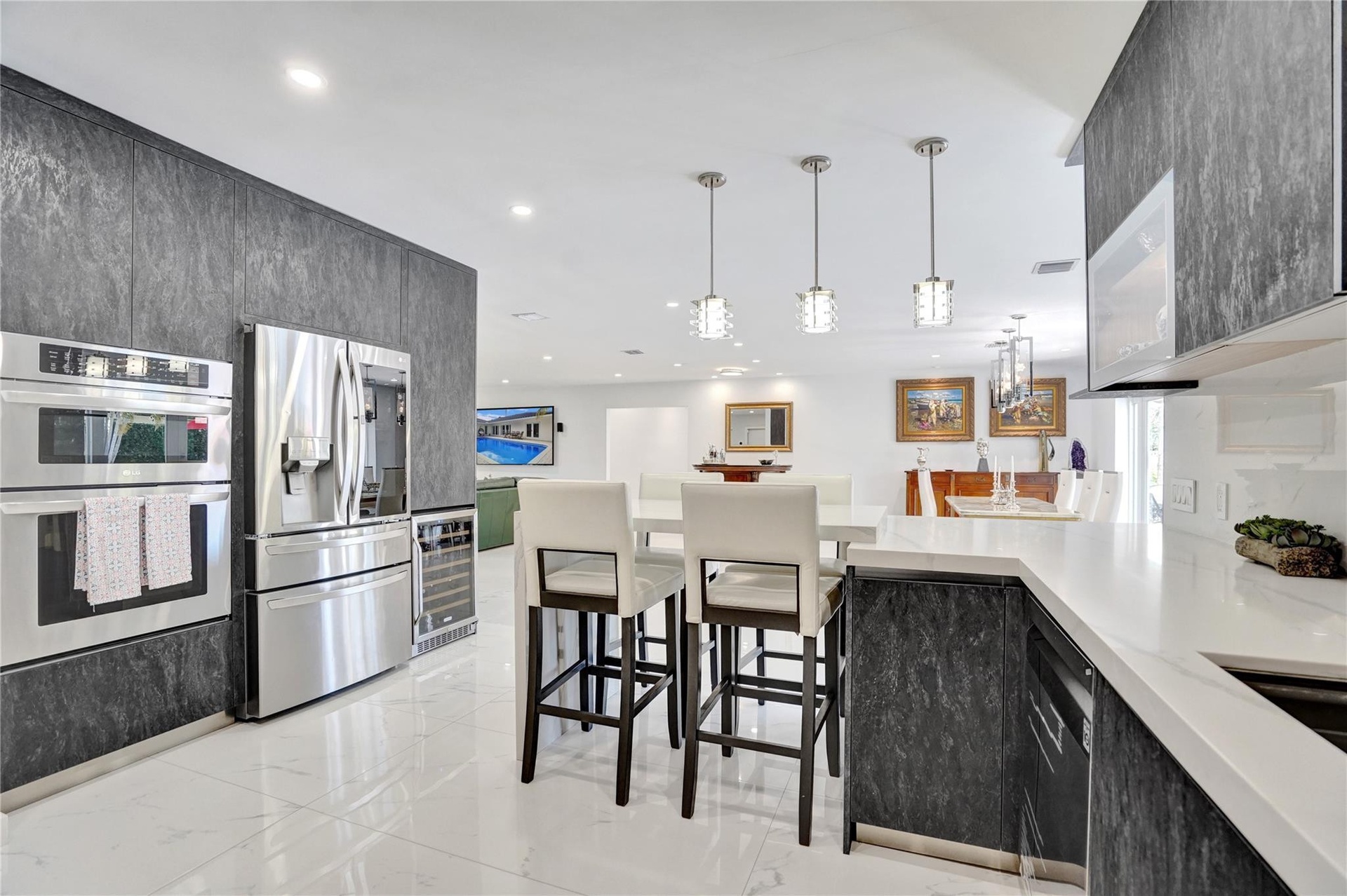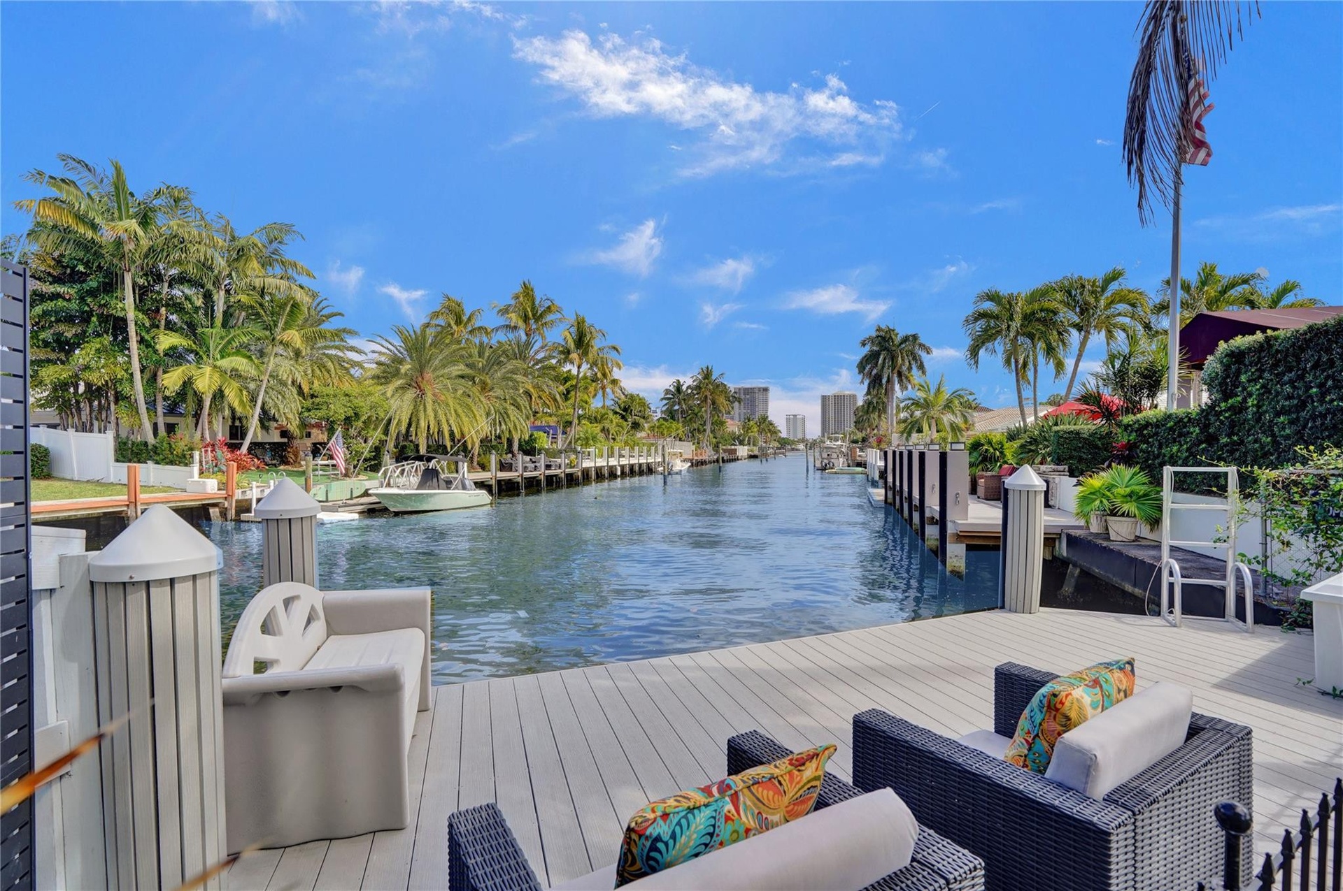 Beautifully renovated deep water residence situated on an oversized corner lot offering ultimate privacy with a "park-like" atmosphere. Bring your small boat, or jet skis & enjoy spectacular water views down the canal to the Intracoastal from the newly built dock. This Spacious home showcases a sleek modern design w/ a seamless open floor plan & luxurious, large-format, Porcelain tiles throughout. Impact glass windows & doors. The chef inspired kitchen is a showstopper with Quartz counters, breakfast bar & stylish European style cabinetry. This popular split bedroom layout offers a luxurious primary bedroom suite with views of the water & pool area complete with spa-like bath, 5th bedroom converted to a huge walk-in closet. Paver circular driveway is situated on NE 40th Ct for easy access. This property is enviably located in sought-after Coral Ridge Country Club neighborhood with very close proximity to Bayview Park and the Country Club.