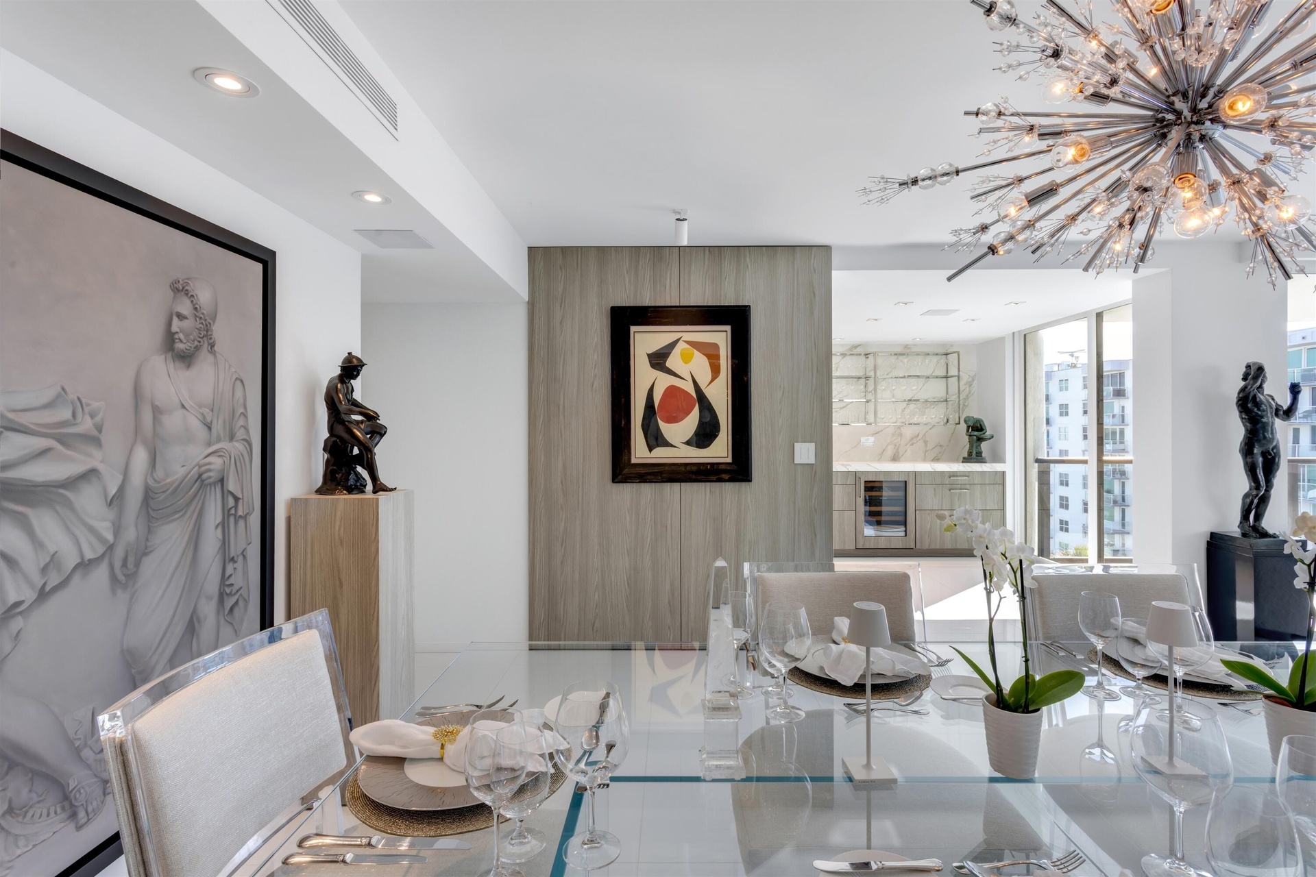 Fully furnished and equipped, this penthouse oceanfront residence offers rare east-to-west exposure with direct water views from both sides, featuring unobstructed sunrise views over the Atlantic and breathtaking sunset views over the Intracoastal—no buildings across the street, just water and sky from every angle. The 2-bedroom, 2-bathroom home spans 1,886 square feet under air (2,450 total) and features expansive balconies on both sides, each over 50 feet long and up to 8.5 feet deep, creating seamless indoor-outdoor living directly on the beach. • Sub-Zero Refrigeration and Freezer Towers, Wine Refrigerator... • Custom Polished Nickel Dining Room Built-in Cabinet by SieMatic • Custom paneling throughout by SieMatic • White Glass Top Porcelain Floors Throughout • Polished nickel faucets and fixtures throughout by Franz Viegener • Master Bedroom Custom Sconces and Guest Bedroom Chandelier and Sconces all by Lobmeyr, Vienna...collector quality • Sonos soundbars mounted under credenzas in bedrooms • Entire Bespoke Dressing Room is fully glazed (glass front cabinetry) • Floating Beds both by Daniele Lago, Italy...underlit by SieMatic • Primary Bath has Two-Person Walk-in Shower with Starphire Glass Panels And A Soaking Tub • Guest Bath has Sonneman lighting and Starphire Glass Shower Enclosure Fully Furnished and Equipped Includes: • 2 restored curved sofas by Vladimir Kagan in Metaphores Paris White Boucle • Custom KravetCouture Pillows • Custom Starphire Glass Dining Table Seats 10 • Custom Lucite Upholstered Dining Chairs, Set 8 • Custom Starphire Glass Cocktail Table • Custom Lucite Floating Poufs, 2 • Haviland Fine China, Custom Order, Set for 8 • Christofle Acier Flatware, Set for 10 • All-Clad Chefs Selection of Cookware • Top Quality Kitchen Accessories • Full Bar: Stemware by Spiegelau, wine accessories • New Dyson Vacuum Cleaner • Tabletop: placemats, linens • Bed: Linens by Frette, Primary Bed Mattress by Duxiana • Bath: Towels, Bath Mats by Pottery Barn • Master Bedroom Lamps Signed Romeo Rega, Skyscraper, Rare pair in polished nickel, 1970's, collector quality • Guest Bedroom Lamps Signed Romeo Rega, Halston Era, Rare pair in Lucite, Polished Nickel and Stainless All artwork and pedestals are available for sale.