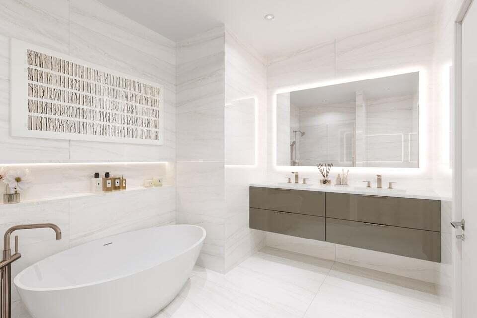 - PRIMARY SUITE WITH FLOOR TO CEILING QUARTS & LUXURIOUS BRUSH BRONZE FIXTURES, CHOICE OF HIGH GLOSS FLOATING VANITY & COMPLETE WITH A SOAKING TUB AND G