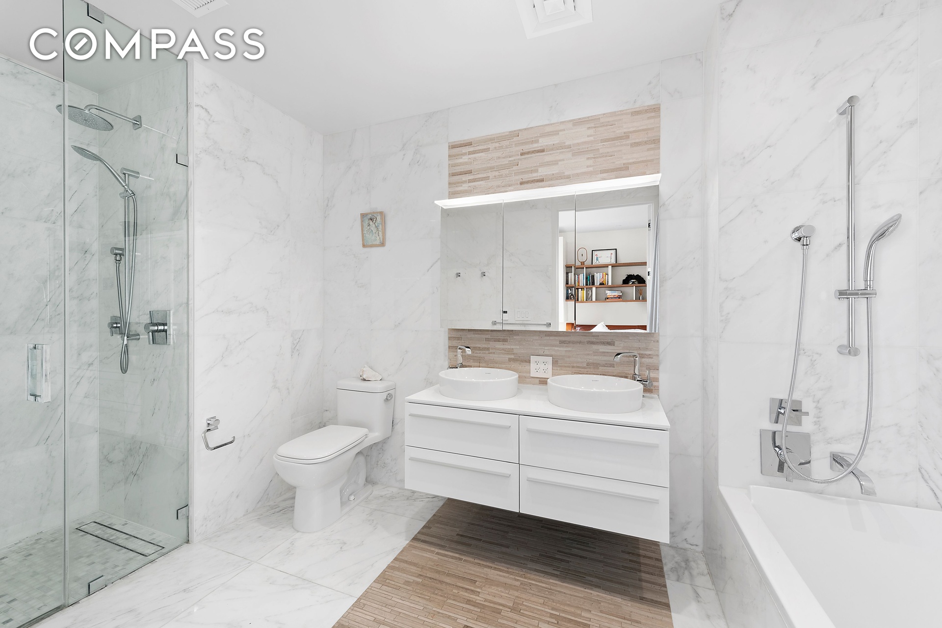 Thoughtfully laid out for privacy, the home’s bedroom wing is both serene and versatile. A spacious north-facing bedroom near the entry offers a large custom closet and access to a windowed full bath, perfectly suited as a guest suite or home office. The primary suite is a true sanctuary, featuring stunning southern exposures over Central Park, a bespoke walk-in closet, and a spa-inspired en-suite bath complete with radiant heated floors, a deep soaking tub, separate glass-enclosed shower, and dual-sink vanity. Two additional bedrooms enjoy open northern exposures with iconic City views, custom built-ins, and ample storage.