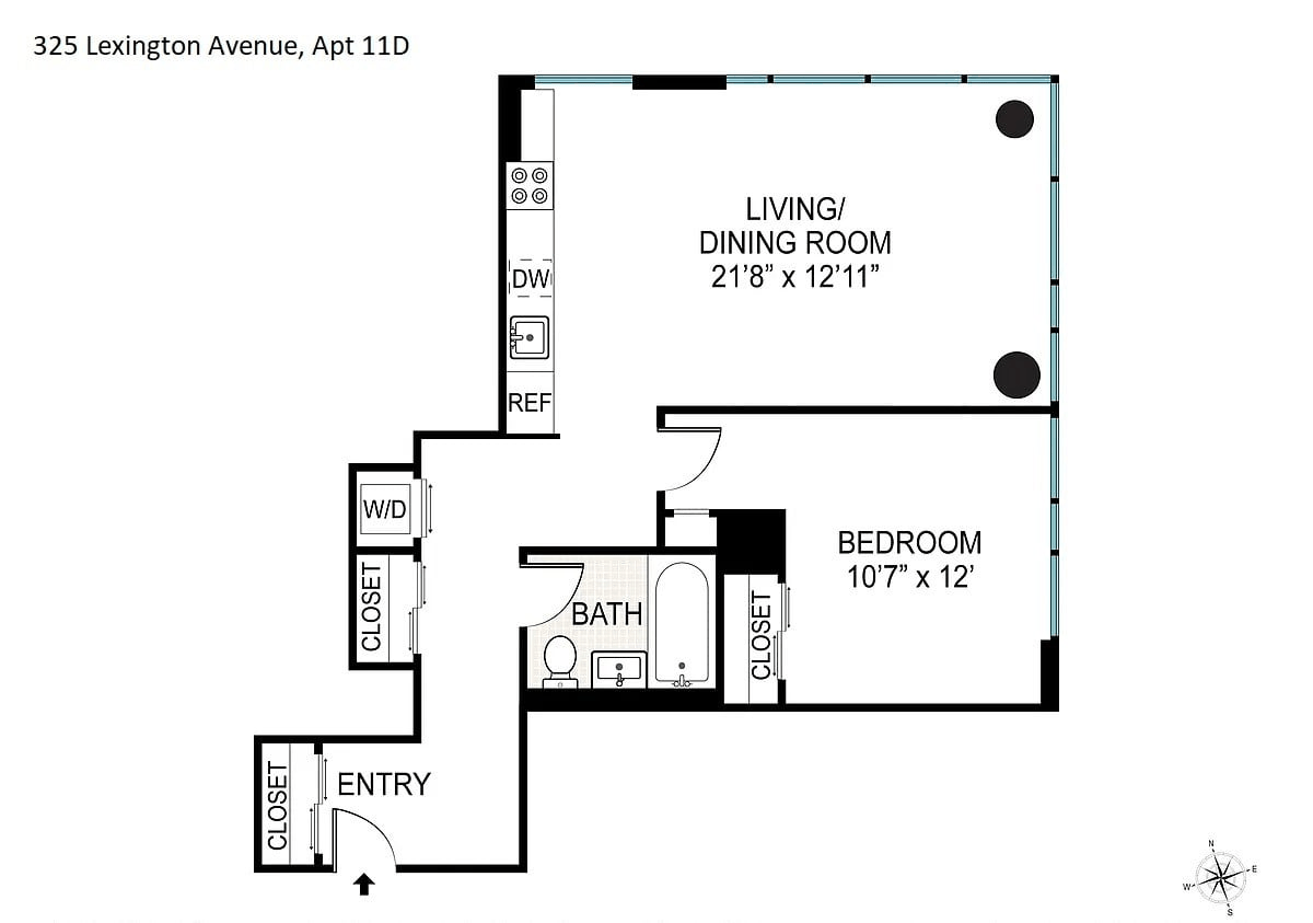 A spacious 753 SF sunfilled corner onebedroom with east, west, and north exposures.