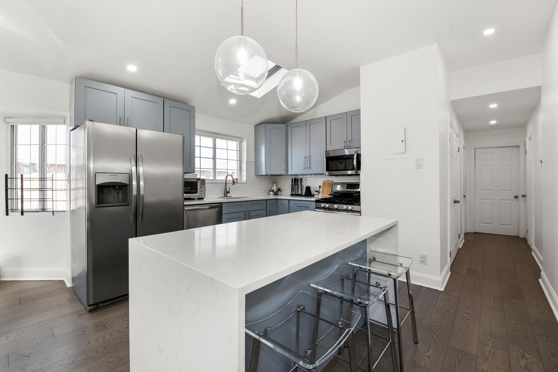 This fantastic fully renovated top-floor condominium offers 3 bedrooms, 2 full bathrooms, front and rear balconies, and 2 skylights. Beautifully maintained, this bright and airy home features approximately 1,063 square feet of living space on the third floor of a well-kept condominium building. The unit includes 3 spacious bedrooms, including a primary bedroom with its own full bath and direct access to a private rear balcony overlooking the beautiful swimming pool. The open-concept layout offers a spacious living room and kitchen with a waterfall island, creating the perfect space for both everyday living and entertaining. The kitchen is equipped with quartz countertops, stainless steel appliances, and ample cabinet space. The sun-filled living room features large windows, 2 skylights, and access to the front balcony, where you can enjoy spectacular views of the Freedom Tower and the Manhattan skyline. Additional features include a video intercom system, 4 air-conditioning units with heat, and a smart washer/dryer. The condominium also offers great amenities, including a swimming pool, gym, and recreation center. Located in the heart of Canarsie, this home offers convenient access to city life, with nearby bodegas, eateries, delis, and shops.