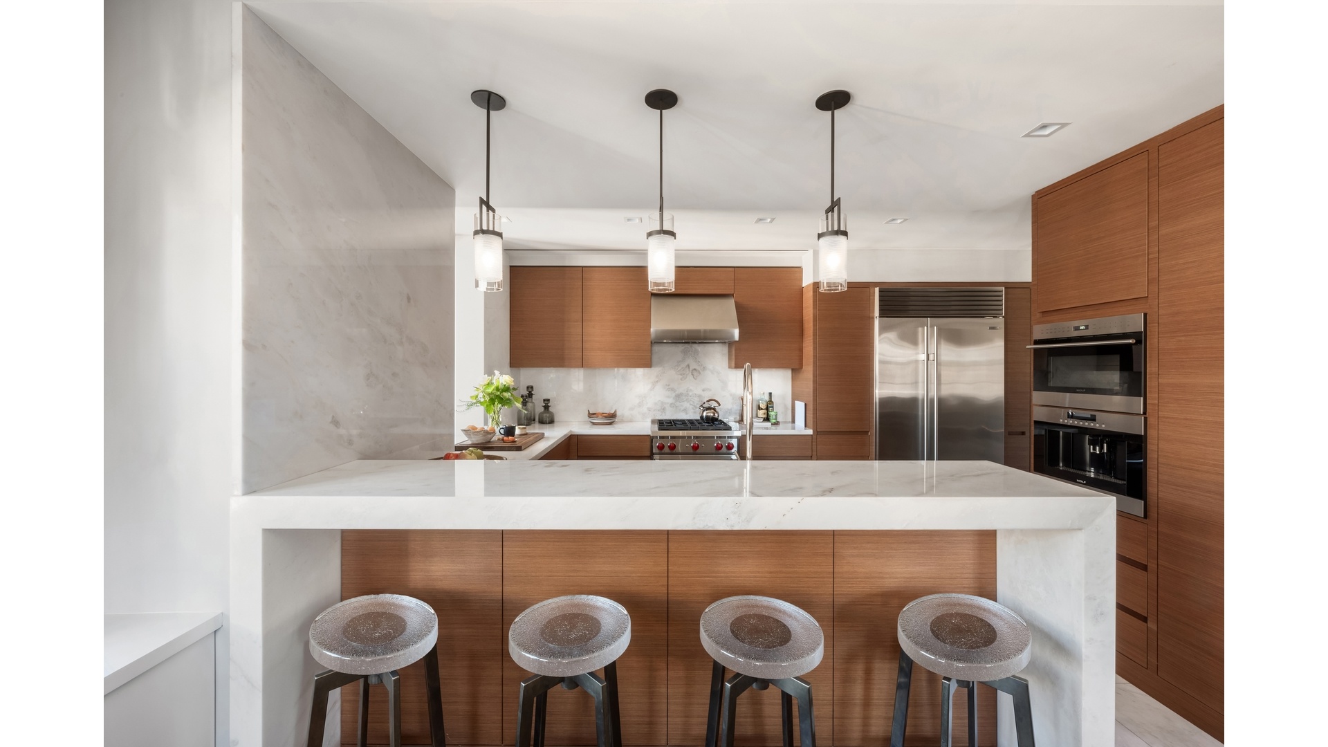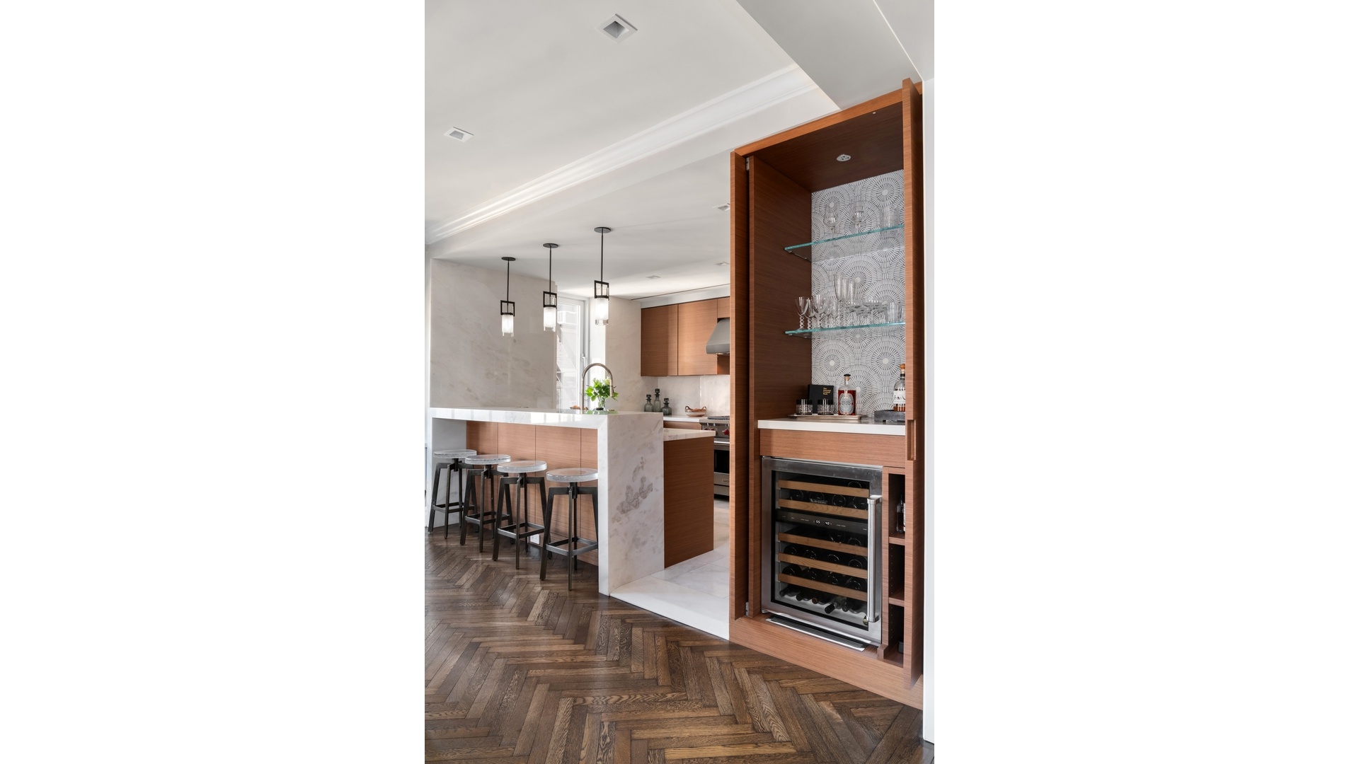 A striking gallery with Bianco Bello marble floors and refined architectural details opens to a sun-filled corner living room with a gas fireplace, flowing seamlessly into a formal dining room and sleek open kitchen. Finished with rift-sawn oak cabinetry, Bianco Bella marble, and top-of-the-line Sub-Zero and Wolf appliances, the kitchen is both elegant and highly functional, complemented by a stylish butler's bar.
