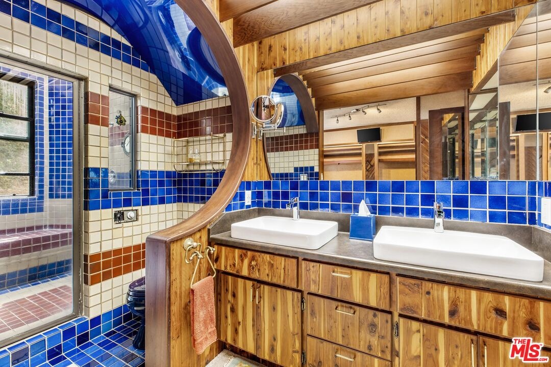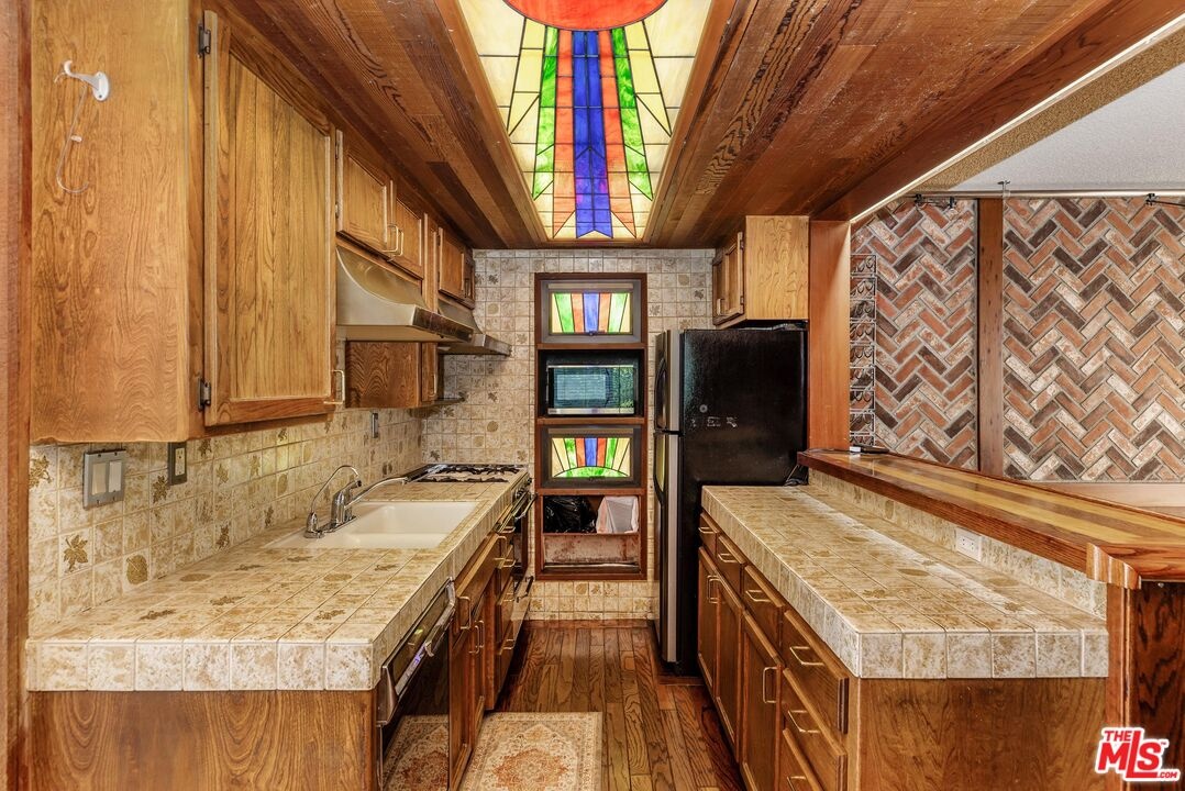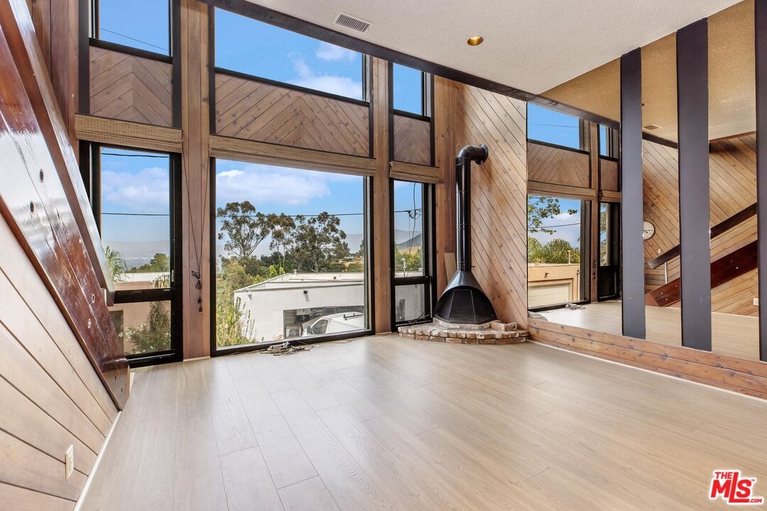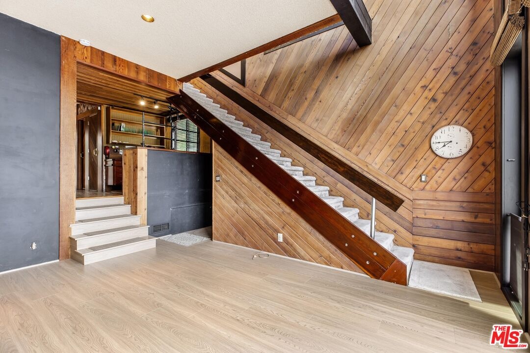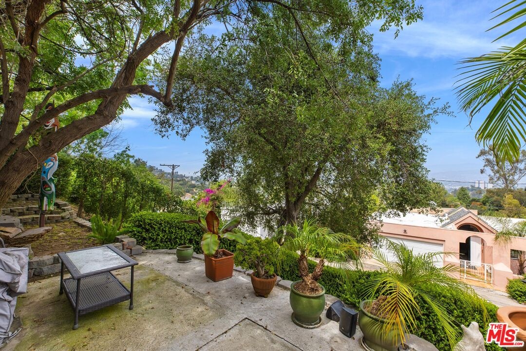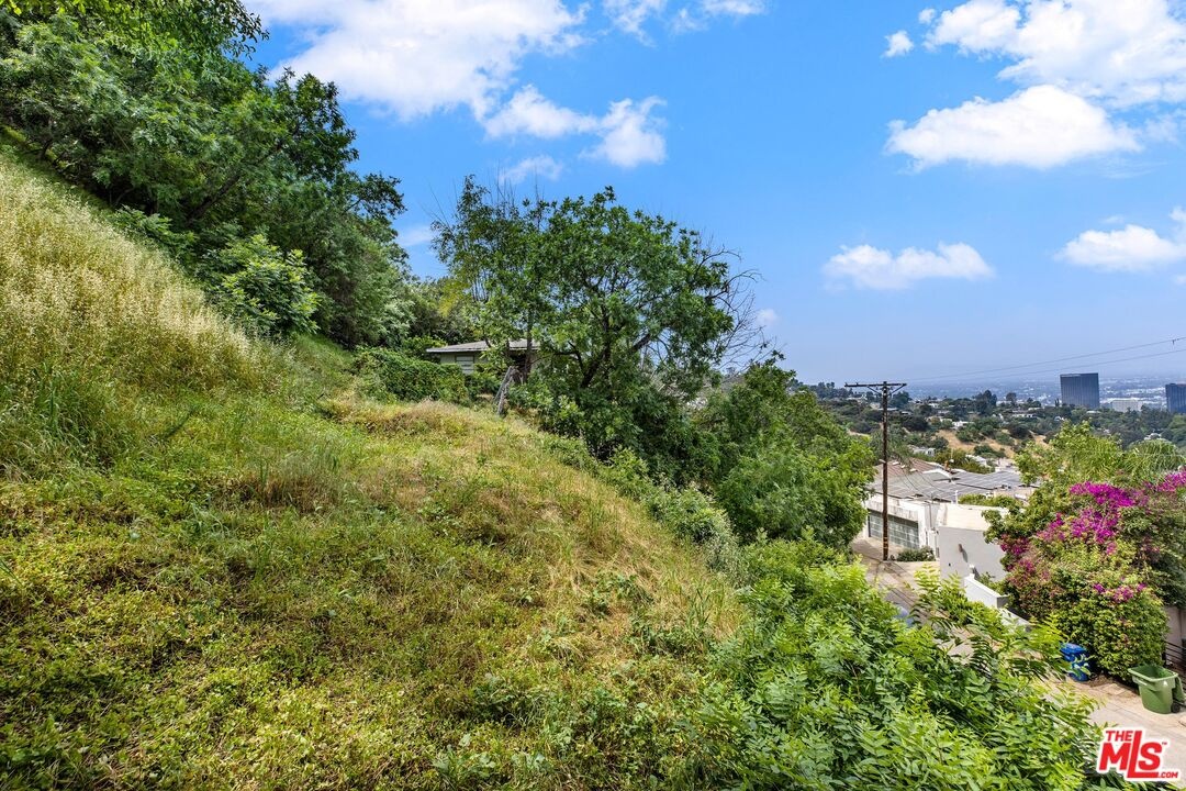 Surrounded by mature trees and set within one of the area's most scenic hillside pockets, this charming Hollywood Hills two-story retreat spans multiple parcels and offers a peaceful take on Southern California living. Featuring 1BD/ 2BA plus a versatile loft, the home showcases sweeping canyon views, original mid-century finishes, and undeniable character. Upon entry, a sunlit living room welcomes you with newly installed engineered wood flooring and expansive windows that frame the natural surroundings. Just a few steps up from the living room, an elevated nook provides the perfect space for a home office, accompanied by a powder bath and a charming kitchen complete with ample cabinetry and stained-glass skylights and windows that add warmth and personality. The kitchen flows into a formal dining area, where sliding glass doors open to a serene patio, ideal for indoor-outdoor living. Upstairs, the inviting loft features rich wood paneling, a motorized skylight, and impressive views stretching toward Universal Studios and the surrounding canyons. The loft connects to a bedroom with generous closet space and an ensuite bath, highlighted by an oversized shower with vibrant tilework. Outdoors, enjoy a quiet patio and a terraced garden overlooking the canyon, offering privacy and a tranquil, nature-filled setting. Additional amenities include a laundry area off the powder room with a newer washer and dryer, as well as a two-car garage. Ideally located moments from the Hollywood Bowl, Runyon Canyon, major studios, and some of LA's most popular dining and nightlife destinations, this unique property presents a rare opportunity to enjoy character, privacy, and scenic views in a quiet hillside setting. Included in the sale are two additional parcels (APNs 2428-010-011 and 2428-010-012), offering expanded space, enhanced privacy, and potential for future use or development.