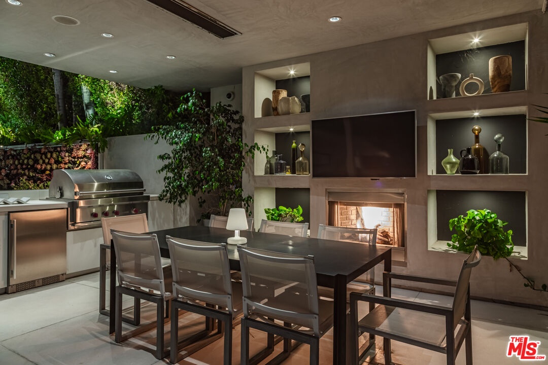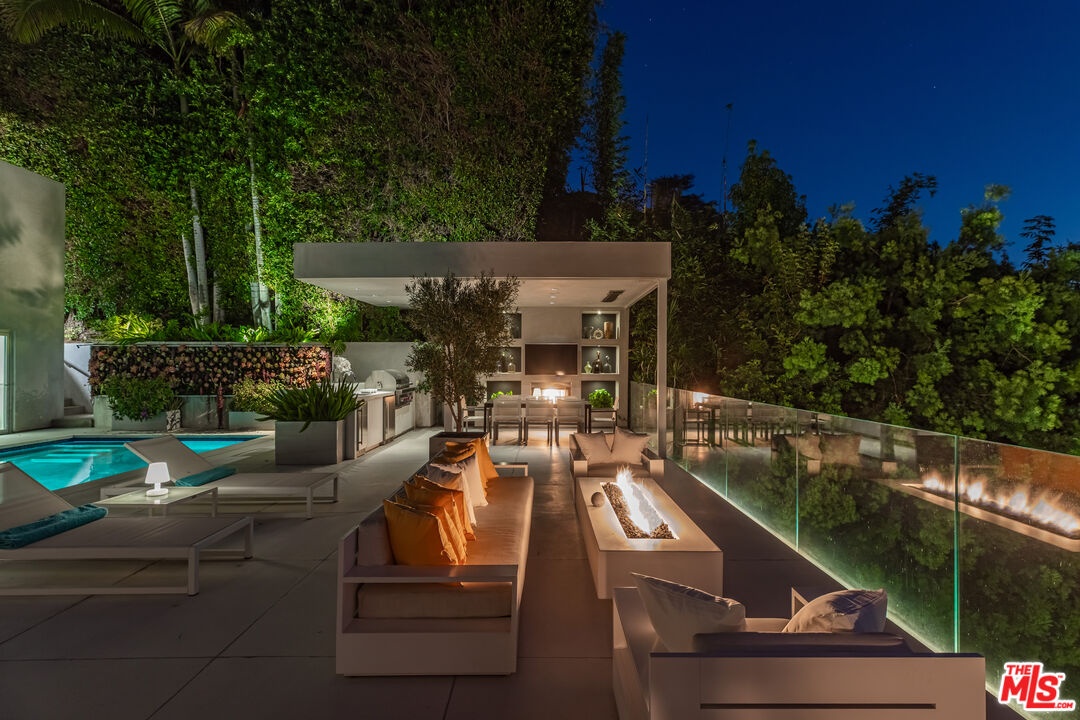 Perched to capture sweeping city lights and sunset ocean views, the Full Moon House is a masterclass in refined modern luxury and bespoke international craftsmanship. With interiors thoughtfully curated by Max Amirsole, featuring artful pieces from Italy, France, and beyond, the home exudes inviting warmth and worldly elegance. His design seamlessly complements James Magni's architectural vision, where bold lines and open-concept spaces meet light, texture, and panoramic city-to-ocean views. Floor-to-ceiling glass walls connect seamless indoor-outdoor spaces, leading to expansive terraces and newly landscaped grounds featuring a stone water feature and a sculpture installation. The main level features a dramatic living area with disappearing glass walls, a sleek chef's kitchen centered around a backlit onyx island, and a formal dining space ideal for entertaining. Designer bedrooms include imported pieces from Spain and Italy, Toto toilets, and flexible use options such as a pre-wired theater suite. The primary suite spans the entire upper level with motorized shades, lime-washed walls, dual spa baths, a soaking tub set on stone, two walk-in closets, and a private outdoor gym terrace. Additional features include terrazzo flooring throughout, Control4 smart home automation, Lutron lighting, solar panels, and a redesigned cabana with smooth stucco and custom shelving. This residence offers an unparalleled blend of modern sophistication, curated design, and indoor-outdoor serenity in the hills above Los Angeles. Furnishings thoughtfully curated from Cantoni, Poliform, BoConcept, and bespoke designer pieces.