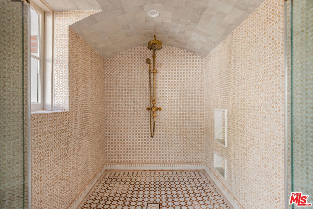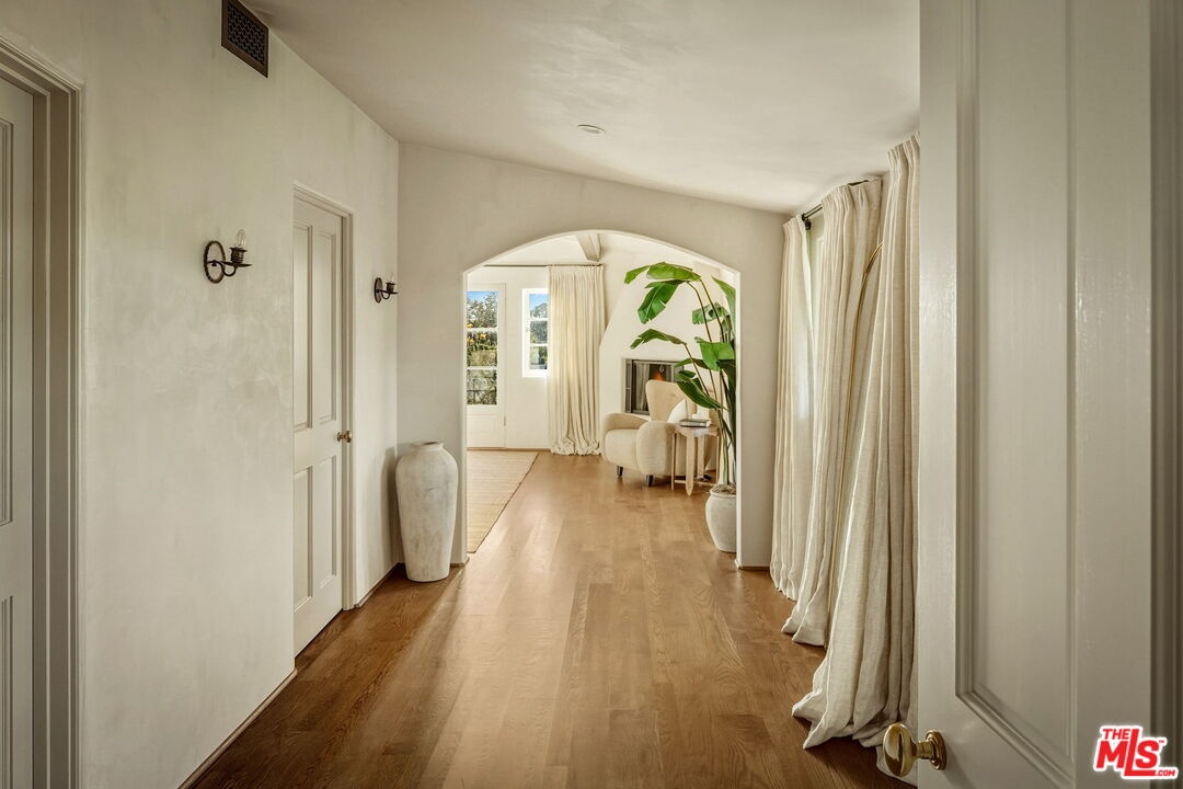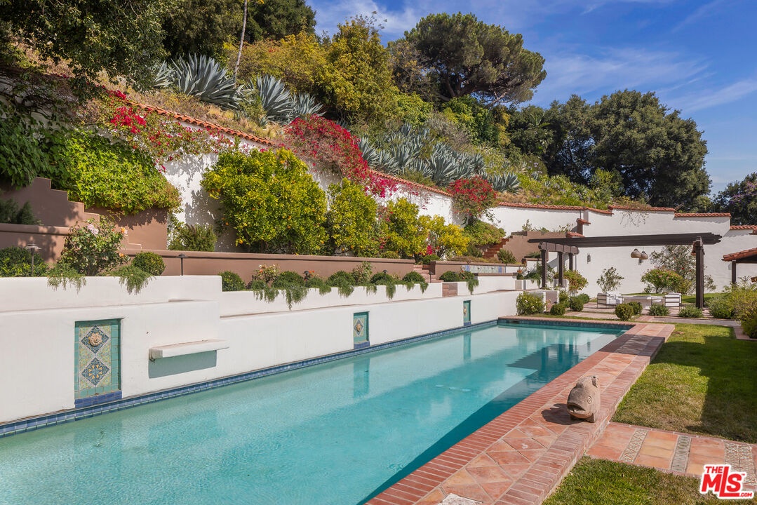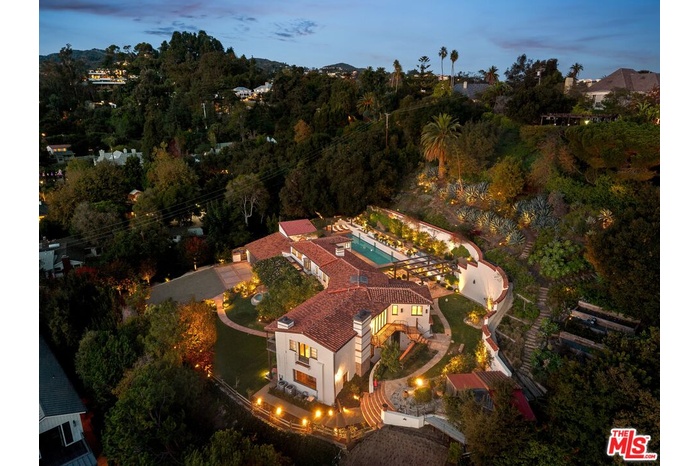 Nestled at the end of a long gated drive in Lower Mandeville Canyon, La Casa De Flores is a Spanish Revival estate of rare provenance and timeless beauty. Designed in 1929 by acclaimed architect John Byers and thoughtfully reimagined for modern living, the home sits on nearly an acre of lush, secluded grounds, offering an atmosphere that feels both grand and deeply inviting. Inside, the craftsmanship of the original era remains intact -- with wood-beamed and coffered ceilings, rich hardwood floors, graceful French doors, and hand-crafted casement windows. Sculptural designer lighting fixtures punctuate the interiors, enhancing the interplay of light and texture throughout. The formal living room, framed by garden views, is anchored by a stone fireplace and crowned by thick, solid wood beams. The formal dining room opens to verandas on both sides, creating effortless flow for gatherings, while the warm, inviting family room is wrapped in custom built-ins. The fully remodeled gourmet kitchen blends elegance and function with stone countertops, custom cabinetry, and an expansive dual-surface marble and butcher block island. A Lacanche range sits within a bespoke alcove, complemented by a walk-in pantry. Adjacent, the glass-topped atrium breakfast room dazzles with direct access to the outdoor kitchen and al fresco dining patio outfitted in vibrant Spanish tile and an original fountain. The primary wing offers a serene retreat with a private covered balcony, far-reaching canyon vistas, a corner fireplace, and a designer walk-in dressing room. Its en suite bath, bathed in natural light, features dual marble vanities and a custom-tiled shower. Four additional guest suites, including two joined by a Jack-and-Jill bath, provide comfort and flexibility. A detached office with a tranquil handpainted mural and expansive windows offers an inspiring workspace, while a coved wine cellar adds an indulgent touch. The grounds are a true sanctuary -- mature fruit trees, flowering gardens, peaceful fountains, and sweeping lush views frame a 55-foot swimmer's pool, brick patios, and a pergola lounge with firepit. Accessory structures and a three-car garage complete this rare and private compound, just moments from Brentwood's finest restaurants, boutiques, and top-rated schools. Blending architectural pedigree with modern comfort, La Casa De Flores is not merely a home -- it's a priceless work of art in one of Los Angeles' most coveted neighborhoods.