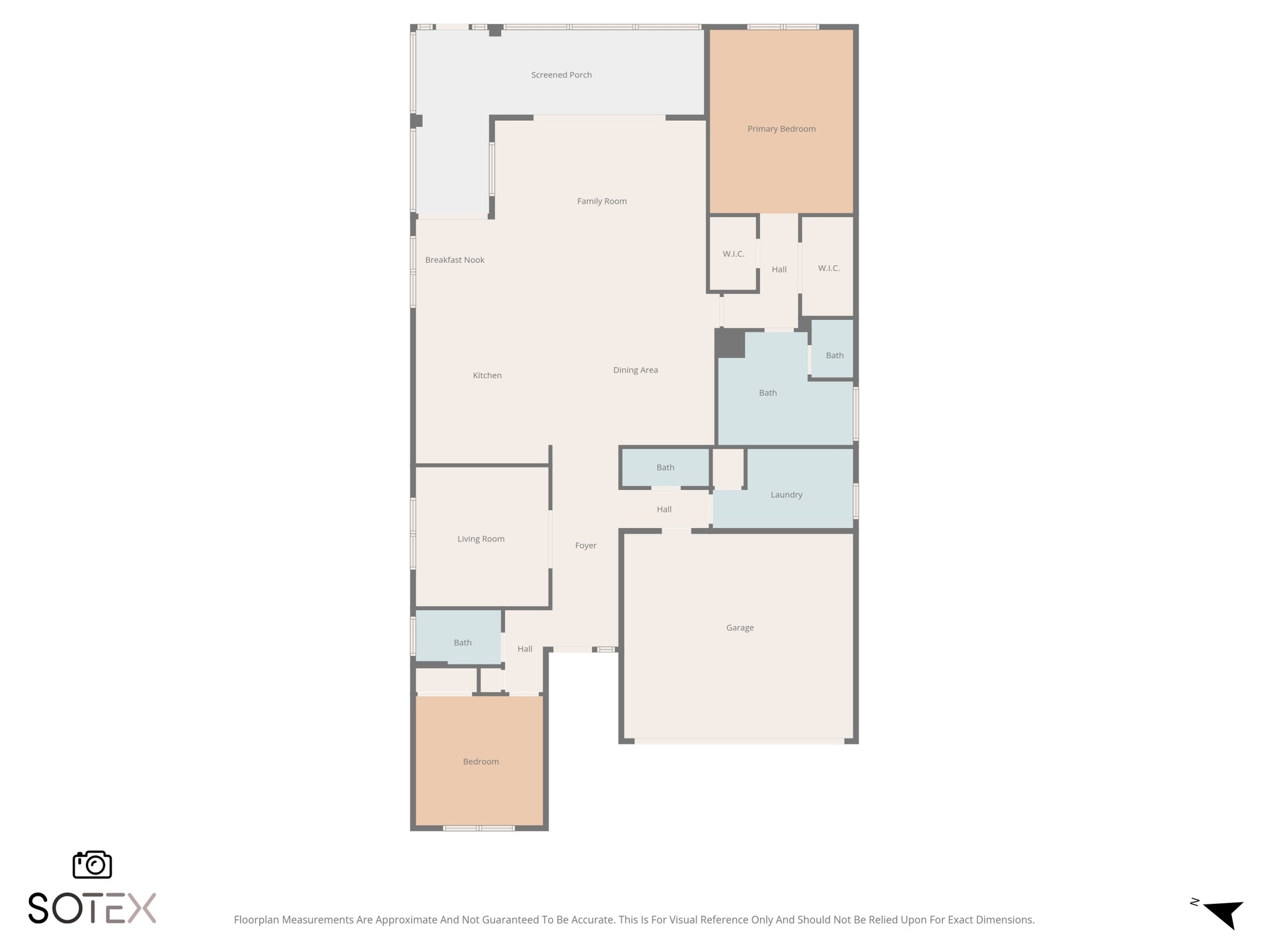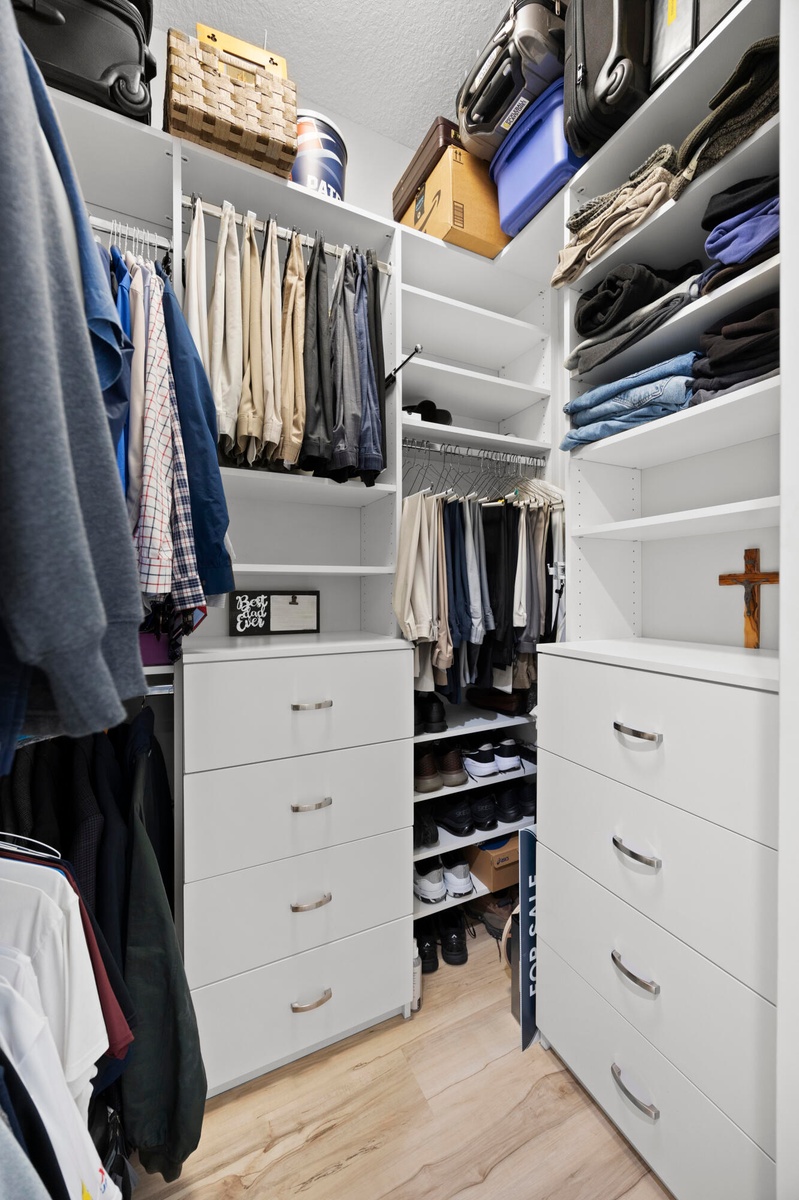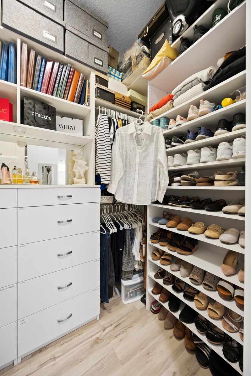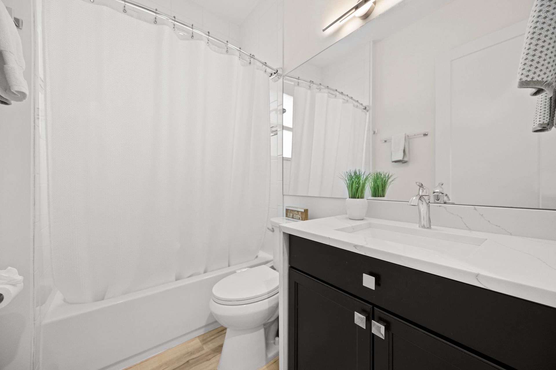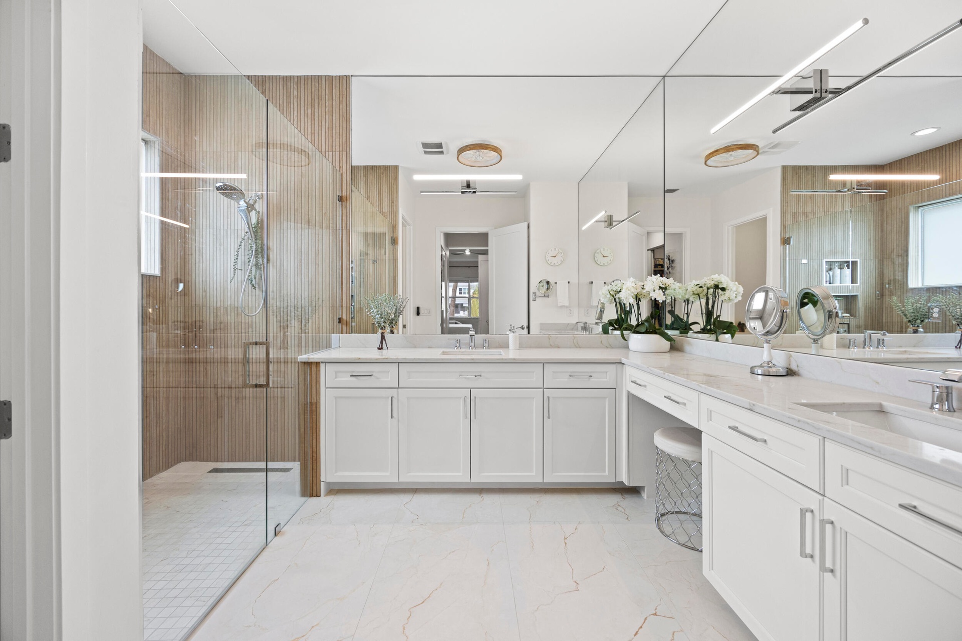 - Renovated primary bathroom with new tile flooring, roll in shower, new lighting, fixtures and floor to ceiling wall shower tile. Double sinks. Linen c