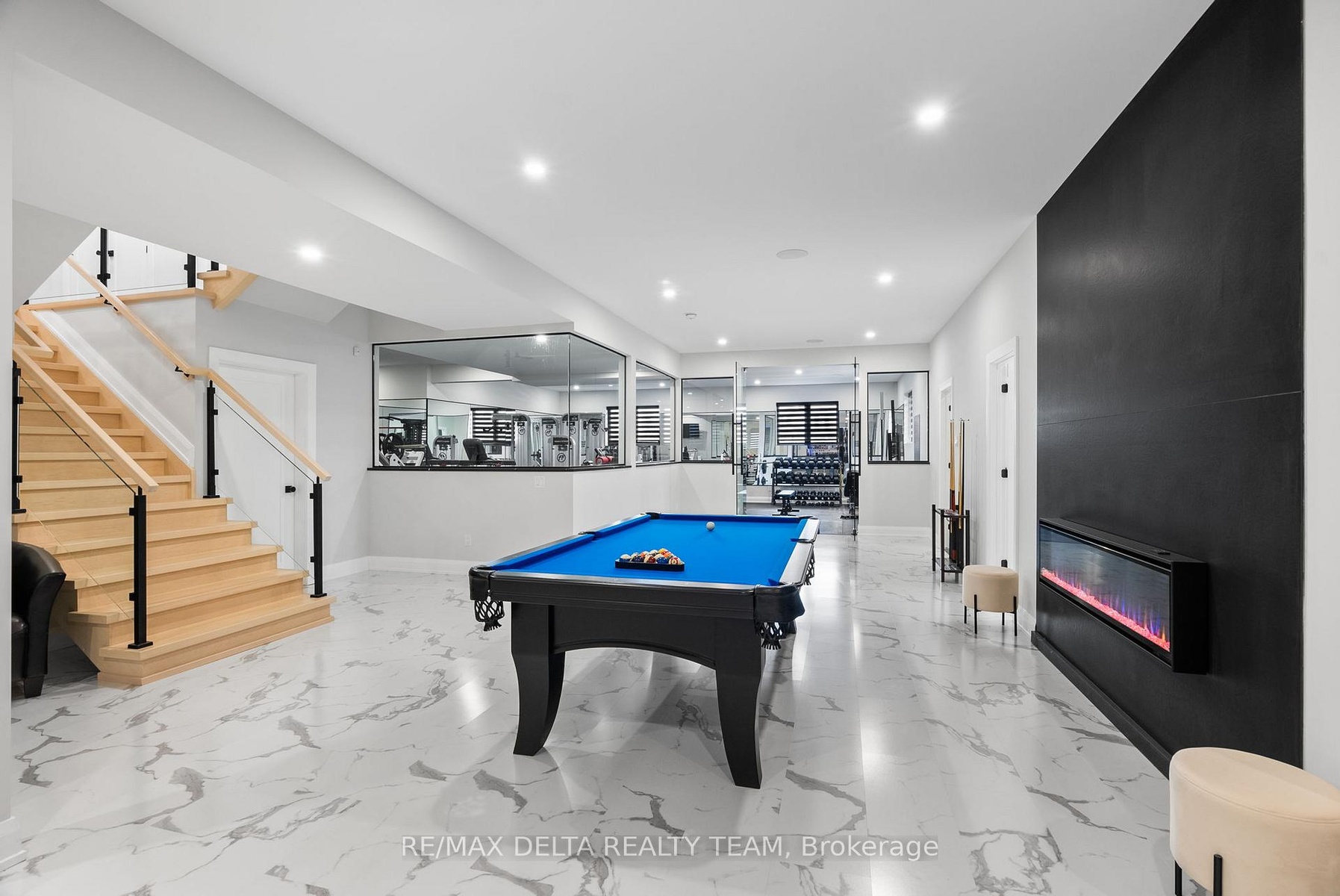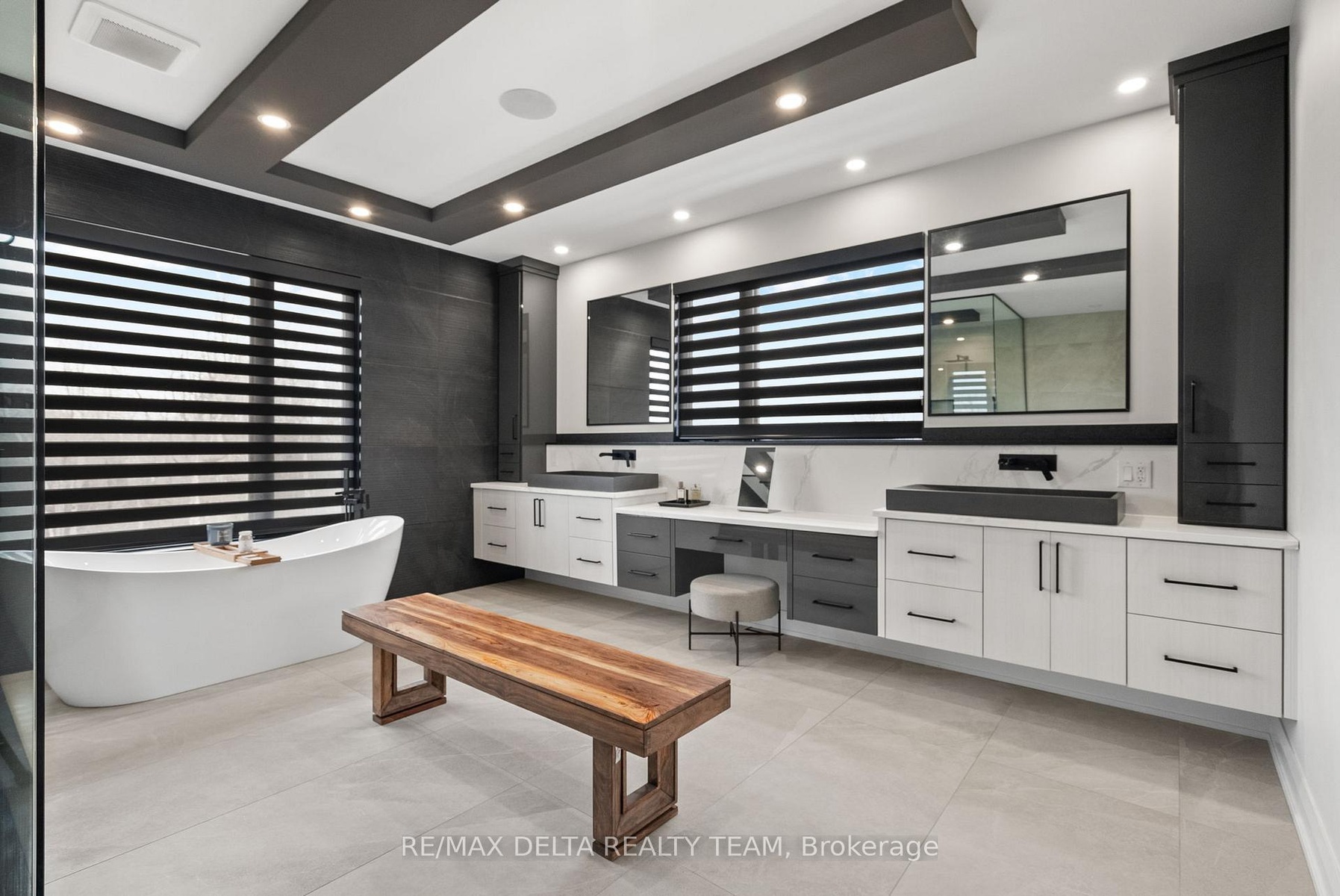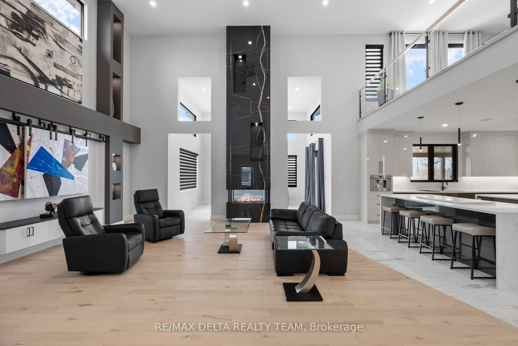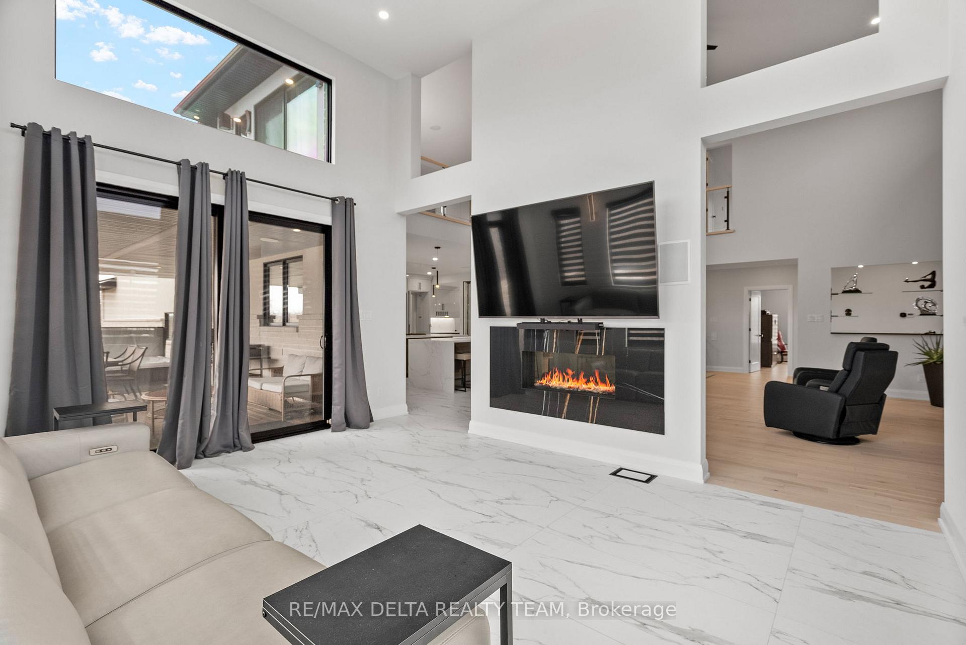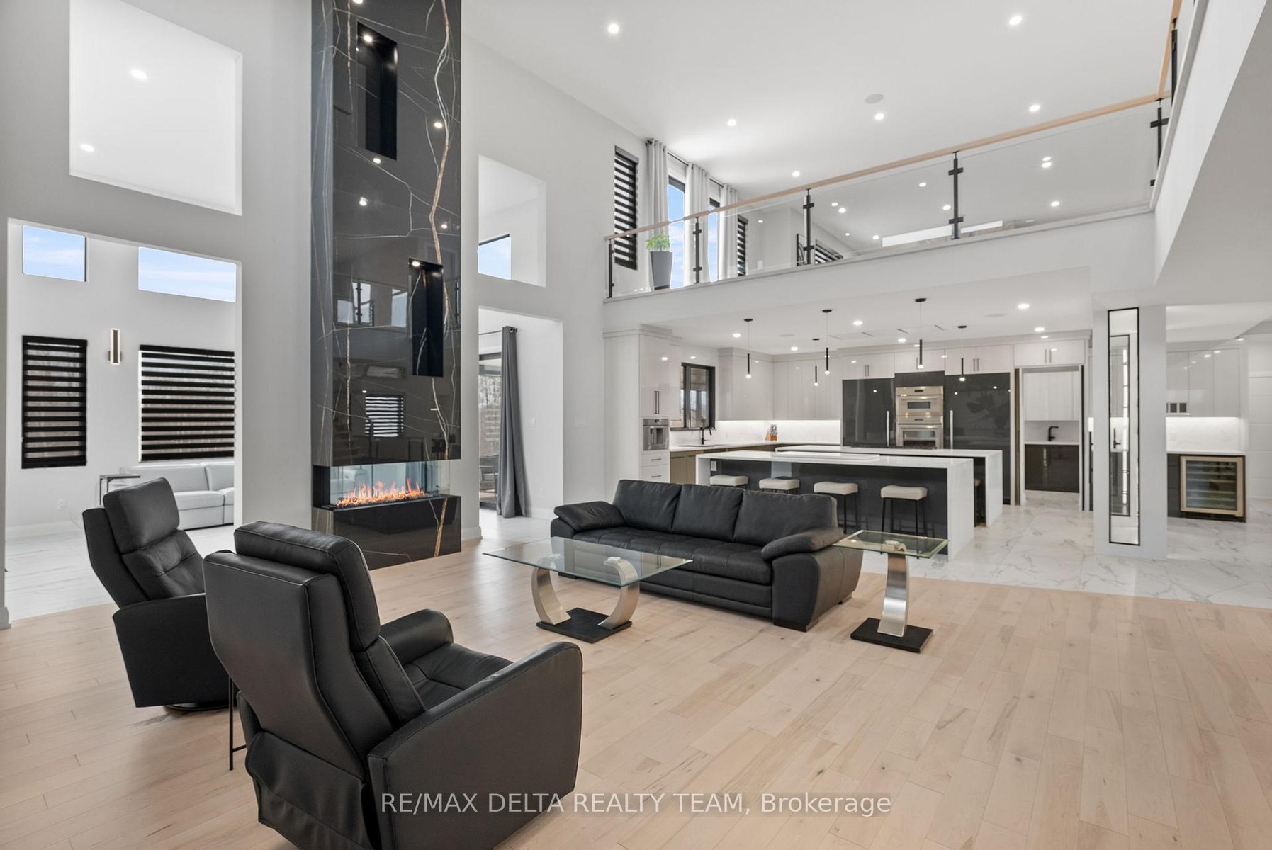 Tailored for the executive lifestyle, perfected for family living. Welcome to 663 Ballycastle Crescent a showstopping modern residence with commanding curb appeal, set on a quiet crescent lined with prestigious homes and backing onto peaceful open space. With over 5,700 sq. ft. of refined living space, this 5-bedroom, 6-bathroom home is a true architectural statement. The exterior offers bold, clean lines and grand scale, while inside, elegance meets innovation. Soaring 20-foot ceilings and a dramatic open-riser staircase set the tone in the main living area anchored by a double-sided porcelain-wrapped fireplace and lighted artwork niches. Maple and leather-finished porcelain floors run throughout the main level. The kitchen is both luxurious and functional, with dual waterfall quartz islands, Thermador appliances, a walk-in pantry, and a striking glass wine feature. A spacious main floor suite with walk-in closet and ensuite offers flexible comfort for guests or extended family. Upstairs, an 830 sq. ft. loft overlooks the great room, connecting two bedrooms each with private ensuites and walk-ins plus a bar area. The 540 sq. ft. primary suite offers a stunning gas fireplace, a dream walk-in closet with quartz island and a spa-inspired ensuite with freestanding tub, porcelain finishes, and custom-lit glass shower with rain heads and jets. The lower level features radiant-heated floors, a fireplace lounge, wet bar, theater, fifth bedroom and full bath, and a 900 sq. ft. commercial-grade gym with mirrors and glass dividers. Built-in media and smart systems run throughout. A 1,200 sq. ft. triple garage offers an oversized bay, loft storage, and backyard access. Two expansive decks add outdoor living space. Minutes from the new Hard Rock Casino and surrounded by luxury. This is a home that makes a statement.