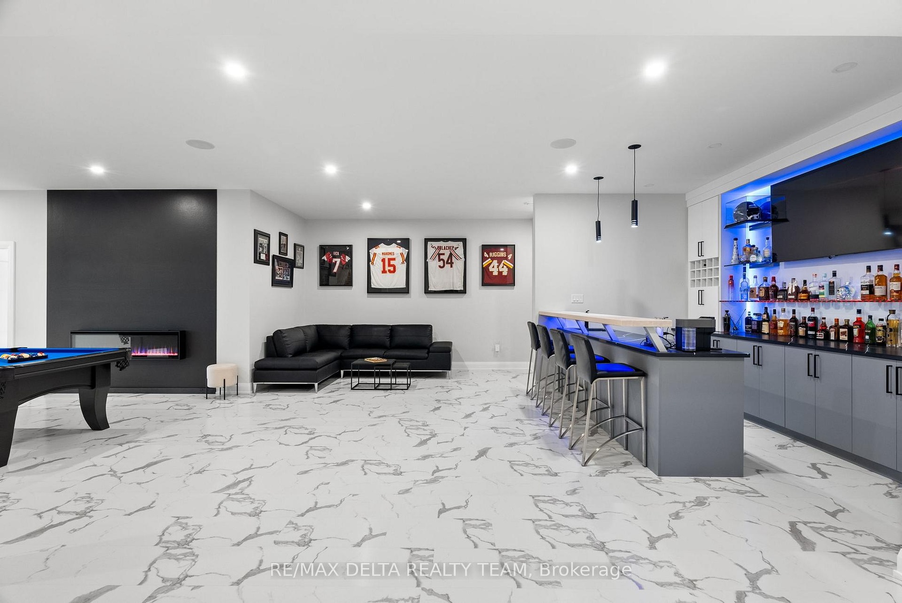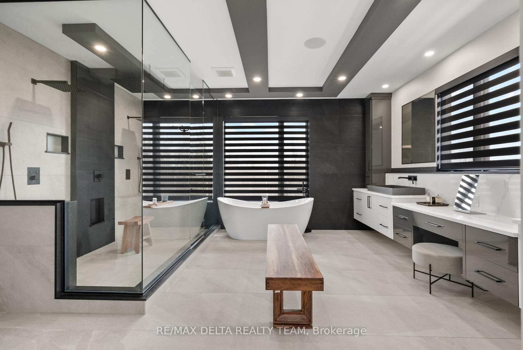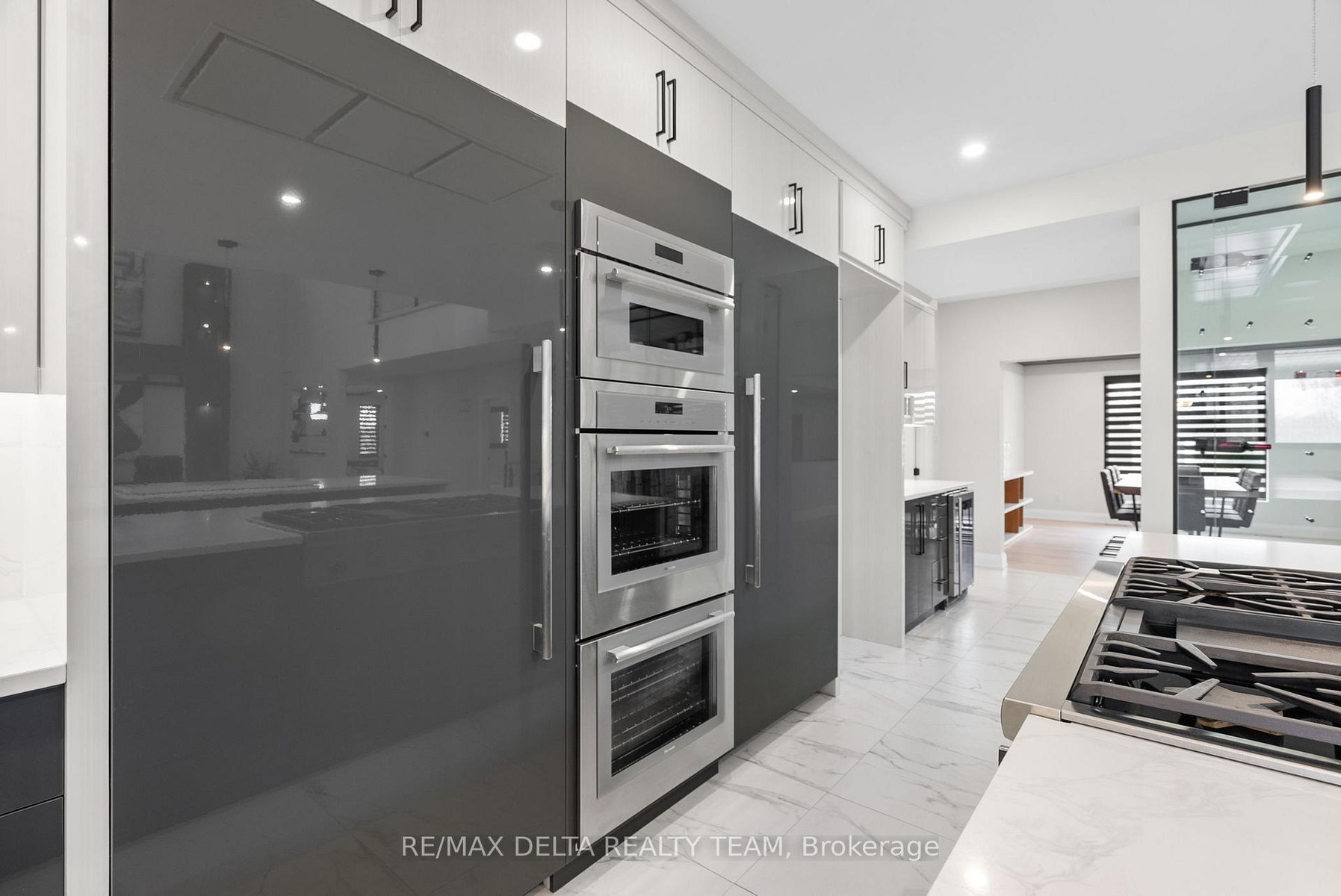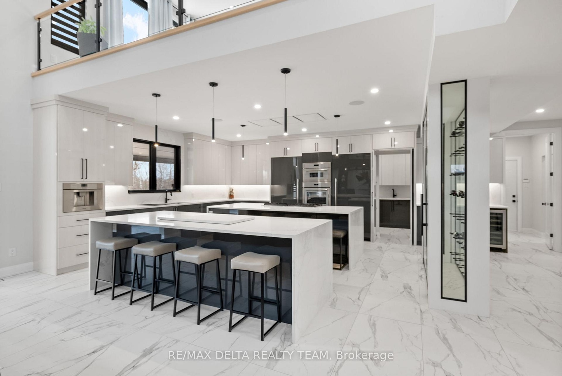 Tailored for the executive lifestyle, perfected for family living. Welcome to 663 Ballycastle Crescent a showstopping modern residence with commanding curb appeal, set on a quiet crescent lined with prestigious homes and backing onto peaceful open space. With over 5,700 sq. ft. of refined living space, this 5-bedroom, 6-bathroom home is a true architectural statement. The exterior offers bold, clean lines and grand scale, while inside, elegance meets innovation. Soaring 20-foot ceilings and a dramatic open-riser staircase set the tone in the main living area anchored by a double-sided porcelain-wrapped fireplace and lighted artwork niches. Maple and leather-finished porcelain floors run throughout the main level. The kitchen is both luxurious and functional, with dual waterfall quartz islands, Thermador appliances, a walk-in pantry, and a striking glass wine feature. A spacious main floor suite with walk-in closet and ensuite offers flexible comfort for guests or extended family. Upstairs, an 830 sq. ft. loft overlooks the great room, connecting two bedrooms each with private ensuites and walk-ins plus a bar area. The 540 sq. ft. primary suite offers a stunning gas fireplace, a dream walk-in closet with quartz island and a spa-inspired ensuite with freestanding tub, porcelain finishes, and custom-lit glass shower with rain heads and jets. The lower level features radiant-heated floors, a fireplace lounge, wet bar, theater, fifth bedroom and full bath, and a 900 sq. ft. commercial-grade gym with mirrors and glass dividers. Built-in media and smart systems run throughout. A 1,200 sq. ft. triple garage offers an oversized bay, loft storage, and backyard access. Two expansive decks add outdoor living space. Minutes from the new Hard Rock Casino and surrounded by luxury. This is a home that makes a statement.