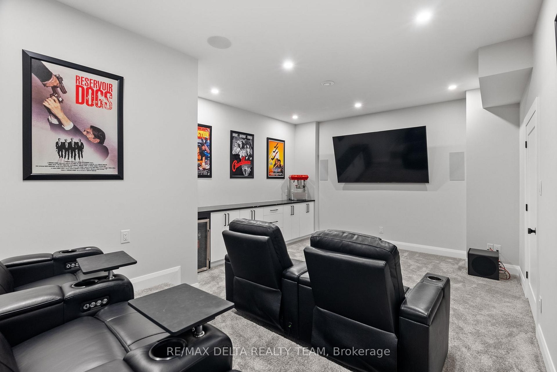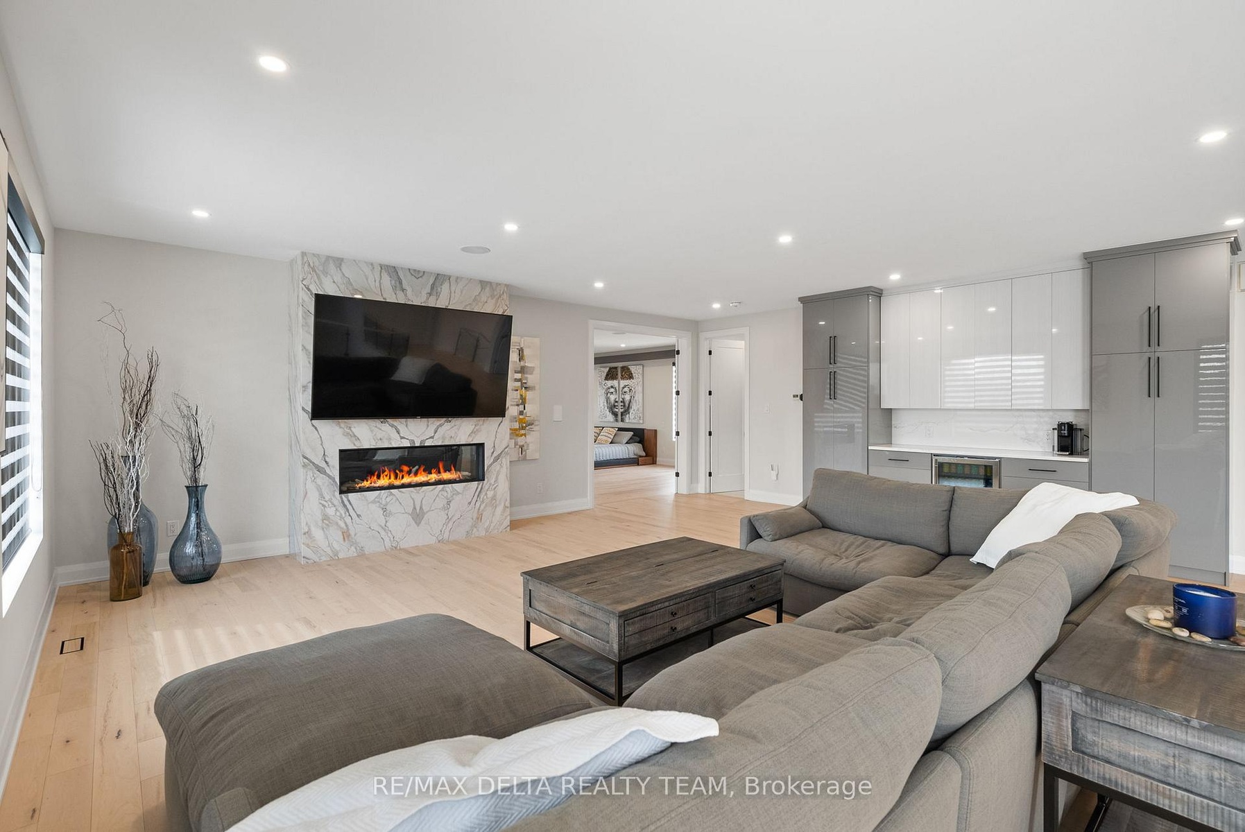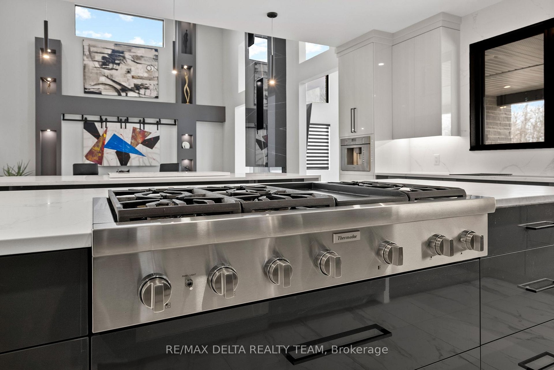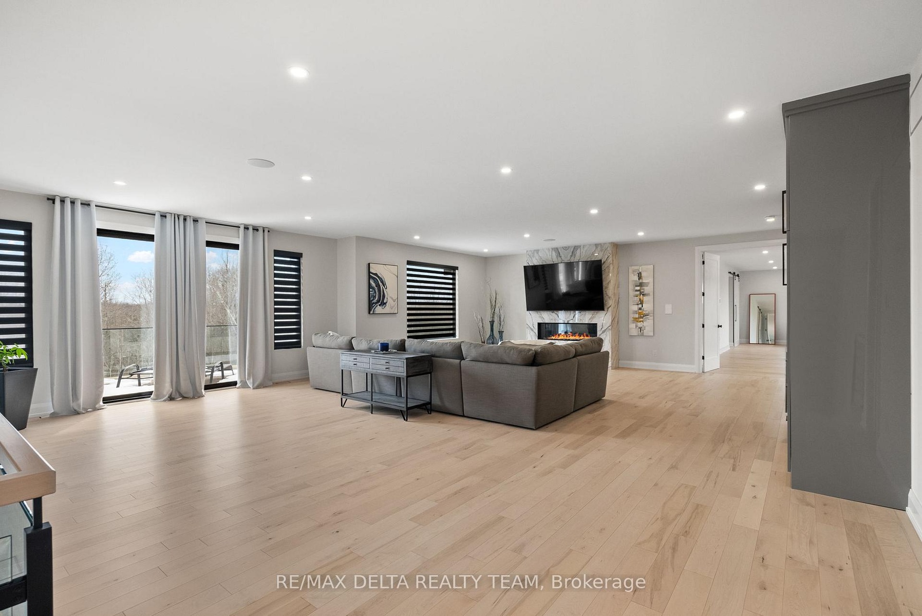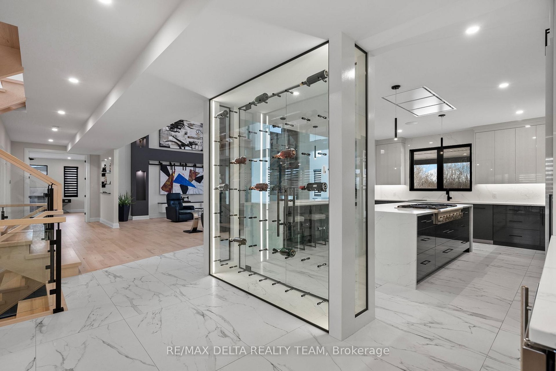 Tailored for the executive lifestyle, perfected for family living. Welcome to 663 Ballycastle Crescent a showstopping modern residence with commanding curb appeal, set on a quiet crescent lined with prestigious homes and backing onto peaceful open space. With over 5,700 sq. ft. of refined living space, this 5-bedroom, 6-bathroom home is a true architectural statement. The exterior offers bold, clean lines and grand scale, while inside, elegance meets innovation. Soaring 20-foot ceilings and a dramatic open-riser staircase set the tone in the main living area anchored by a double-sided porcelain-wrapped fireplace and lighted artwork niches. Maple and leather-finished porcelain floors run throughout the main level. The kitchen is both luxurious and functional, with dual waterfall quartz islands, Thermador appliances, a walk-in pantry, and a striking glass wine feature. A spacious main floor suite with walk-in closet and ensuite offers flexible comfort for guests or extended family. Upstairs, an 830 sq. ft. loft overlooks the great room, connecting two bedrooms each with private ensuites and walk-ins plus a bar area. The 540 sq. ft. primary suite offers a stunning gas fireplace, a dream walk-in closet with quartz island and a spa-inspired ensuite with freestanding tub, porcelain finishes, and custom-lit glass shower with rain heads and jets. The lower level features radiant-heated floors, a fireplace lounge, wet bar, theater, fifth bedroom and full bath, and a 900 sq. ft. commercial-grade gym with mirrors and glass dividers. Built-in media and smart systems run throughout. A 1,200 sq. ft. triple garage offers an oversized bay, loft storage, and backyard access. Two expansive decks add outdoor living space. Minutes from the new Hard Rock Casino and surrounded by luxury. This is a home that makes a statement.