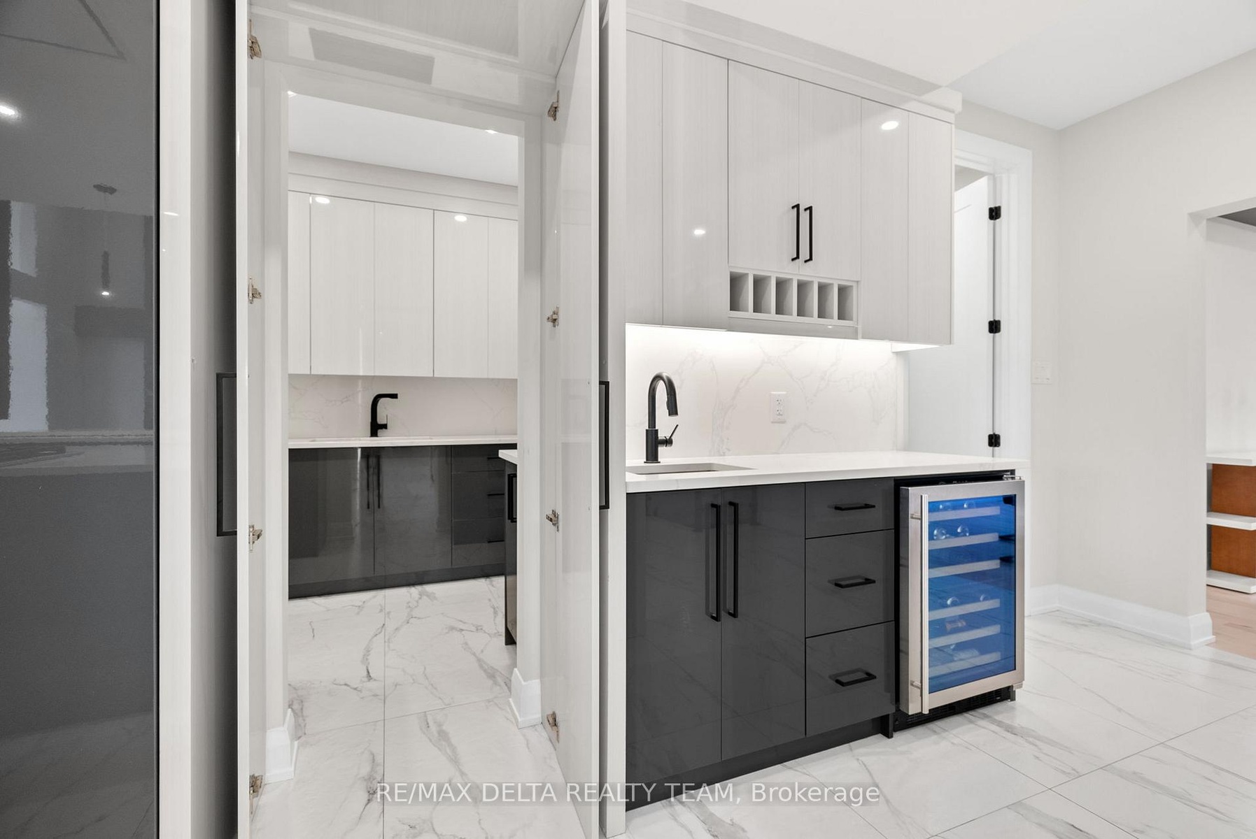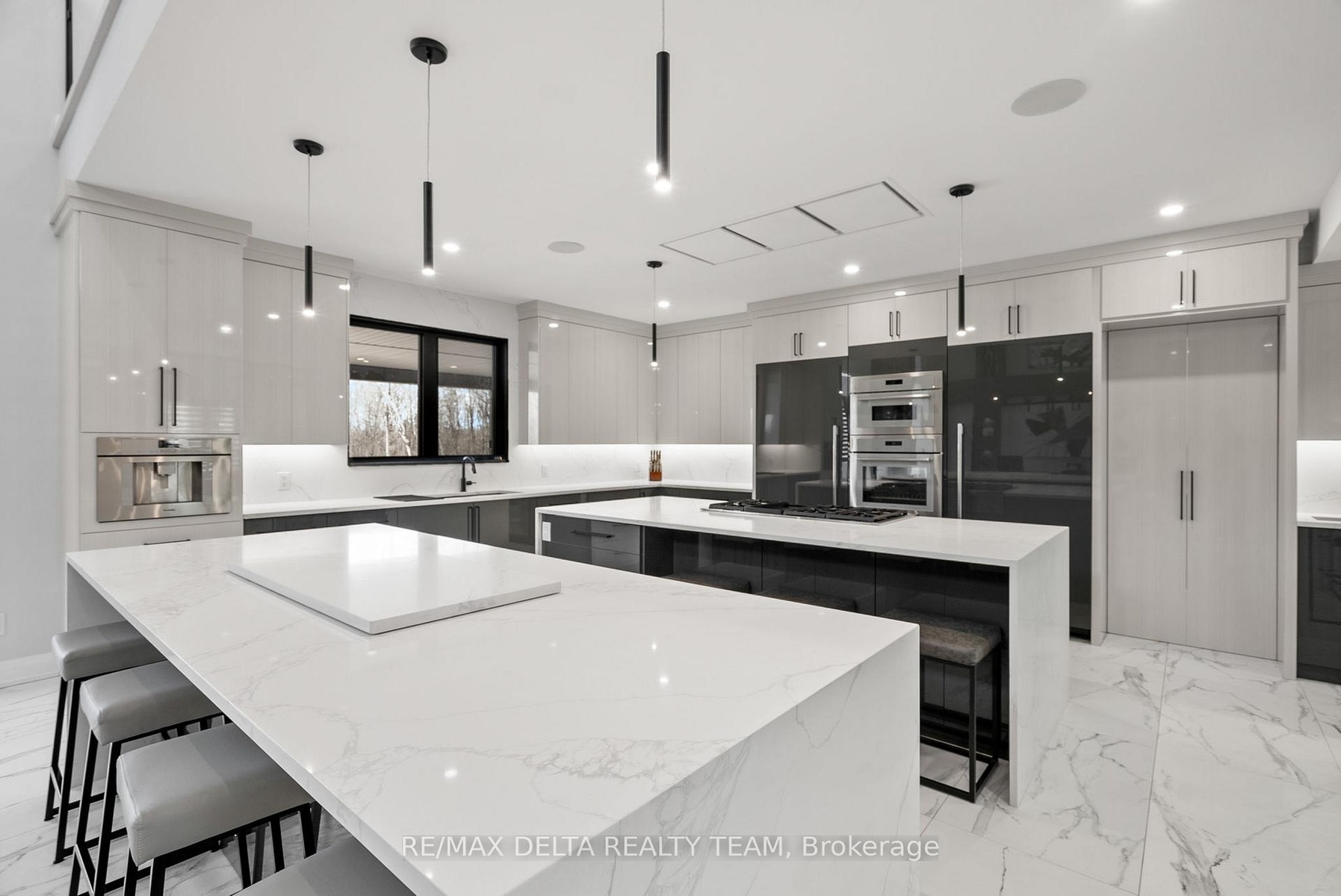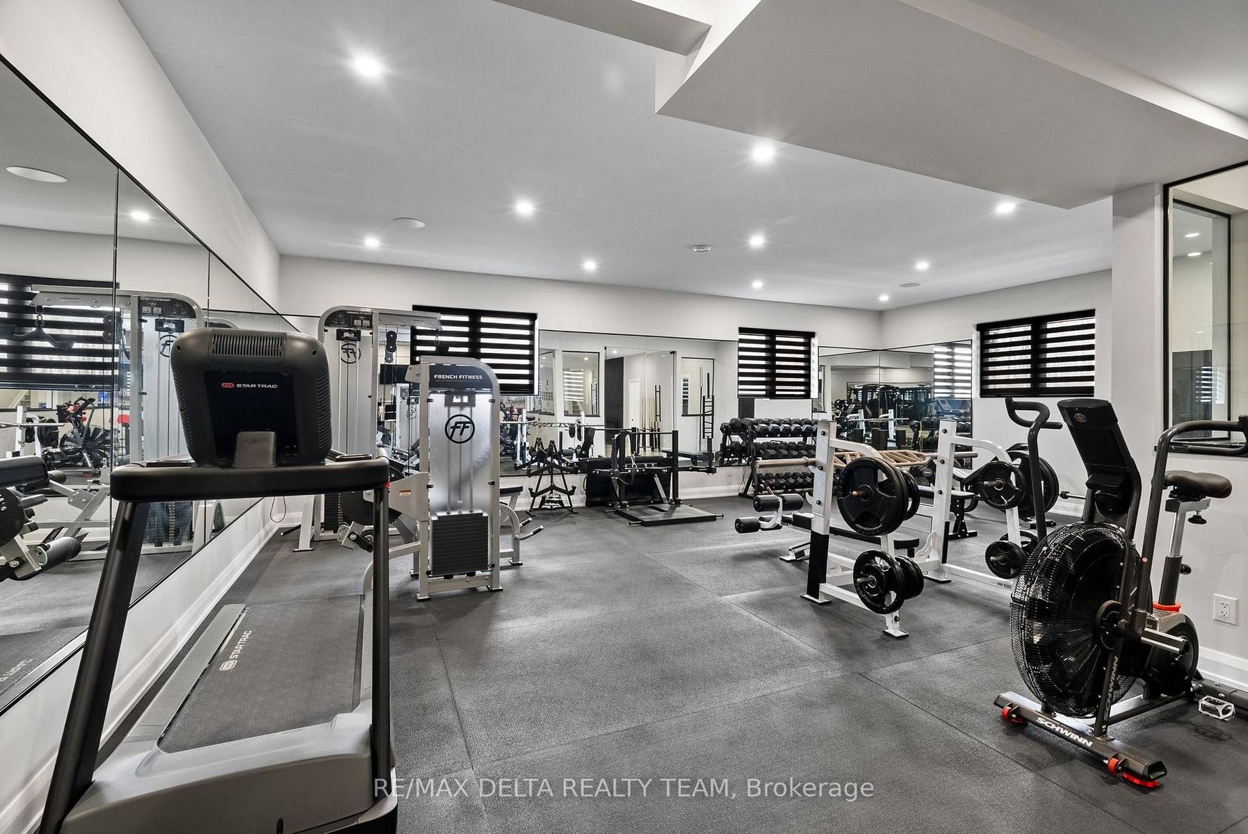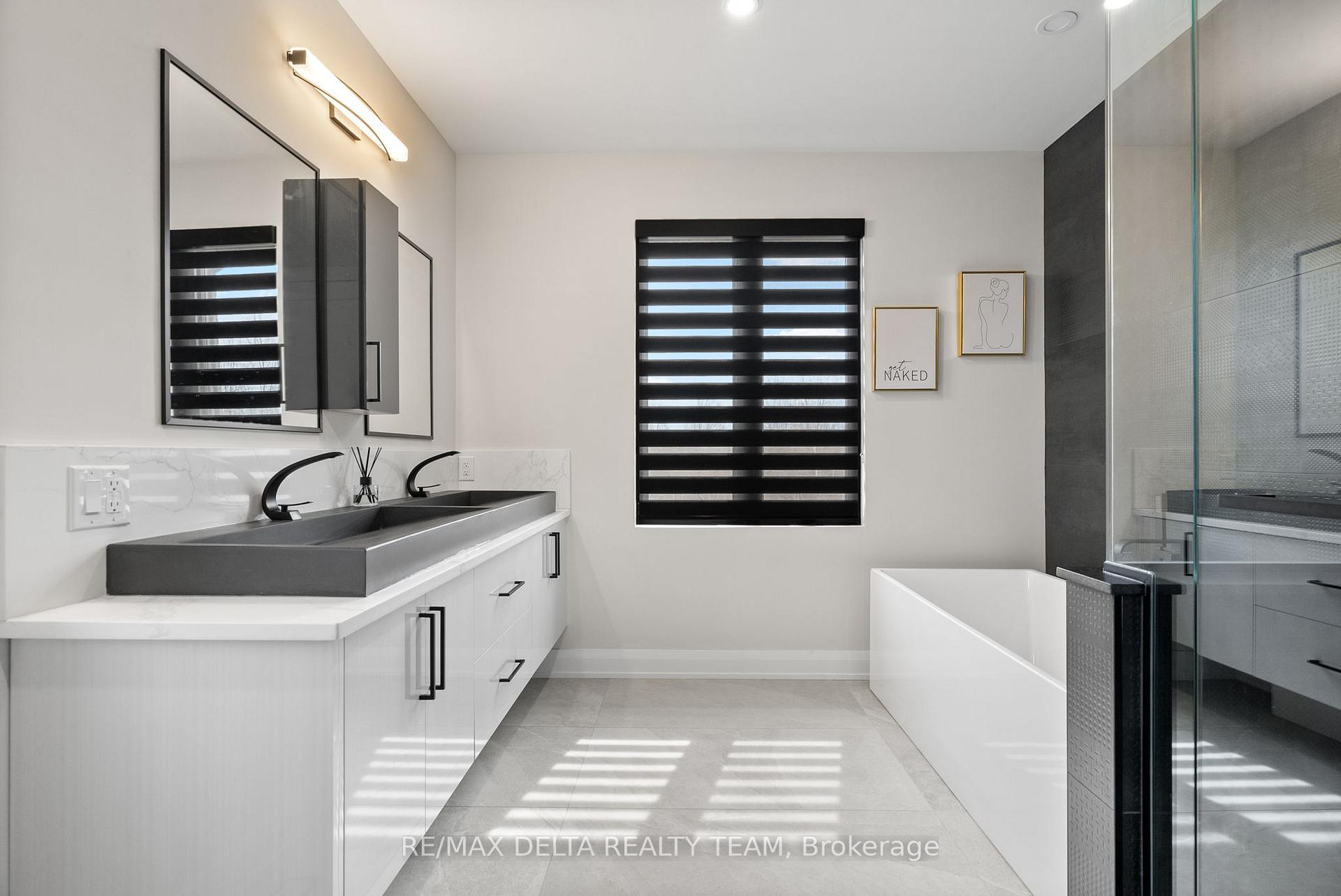 Tailored for the executive lifestyle, perfected for family living. Welcome to 663 Ballycastle Crescent a showstopping modern residence with commanding curb appeal, set on a quiet crescent lined with prestigious homes and backing onto peaceful open space. With over 5,700 sq. ft. of refined living space, this 5-bedroom, 6-bathroom home is a true architectural statement. The exterior offers bold, clean lines and grand scale, while inside, elegance meets innovation. Soaring 20-foot ceilings and a dramatic open-riser staircase set the tone in the main living area anchored by a double-sided porcelain-wrapped fireplace and lighted artwork niches. Maple and leather-finished porcelain floors run throughout the main level. The kitchen is both luxurious and functional, with dual waterfall quartz islands, Thermador appliances, a walk-in pantry, and a striking glass wine feature. A spacious main floor suite with walk-in closet and ensuite offers flexible comfort for guests or extended family. Upstairs, an 830 sq. ft. loft overlooks the great room, connecting two bedrooms each with private ensuites and walk-ins plus a bar area. The 540 sq. ft. primary suite offers a stunning gas fireplace, a dream walk-in closet with quartz island and a spa-inspired ensuite with freestanding tub, porcelain finishes, and custom-lit glass shower with rain heads and jets. The lower level features radiant-heated floors, a fireplace lounge, wet bar, theater, fifth bedroom and full bath, and a 900 sq. ft. commercial-grade gym with mirrors and glass dividers. Built-in media and smart systems run throughout. A 1,200 sq. ft. triple garage offers an oversized bay, loft storage, and backyard access. Two expansive decks add outdoor living space. Minutes from the new Hard Rock Casino and surrounded by luxury. This is a home that makes a statement.