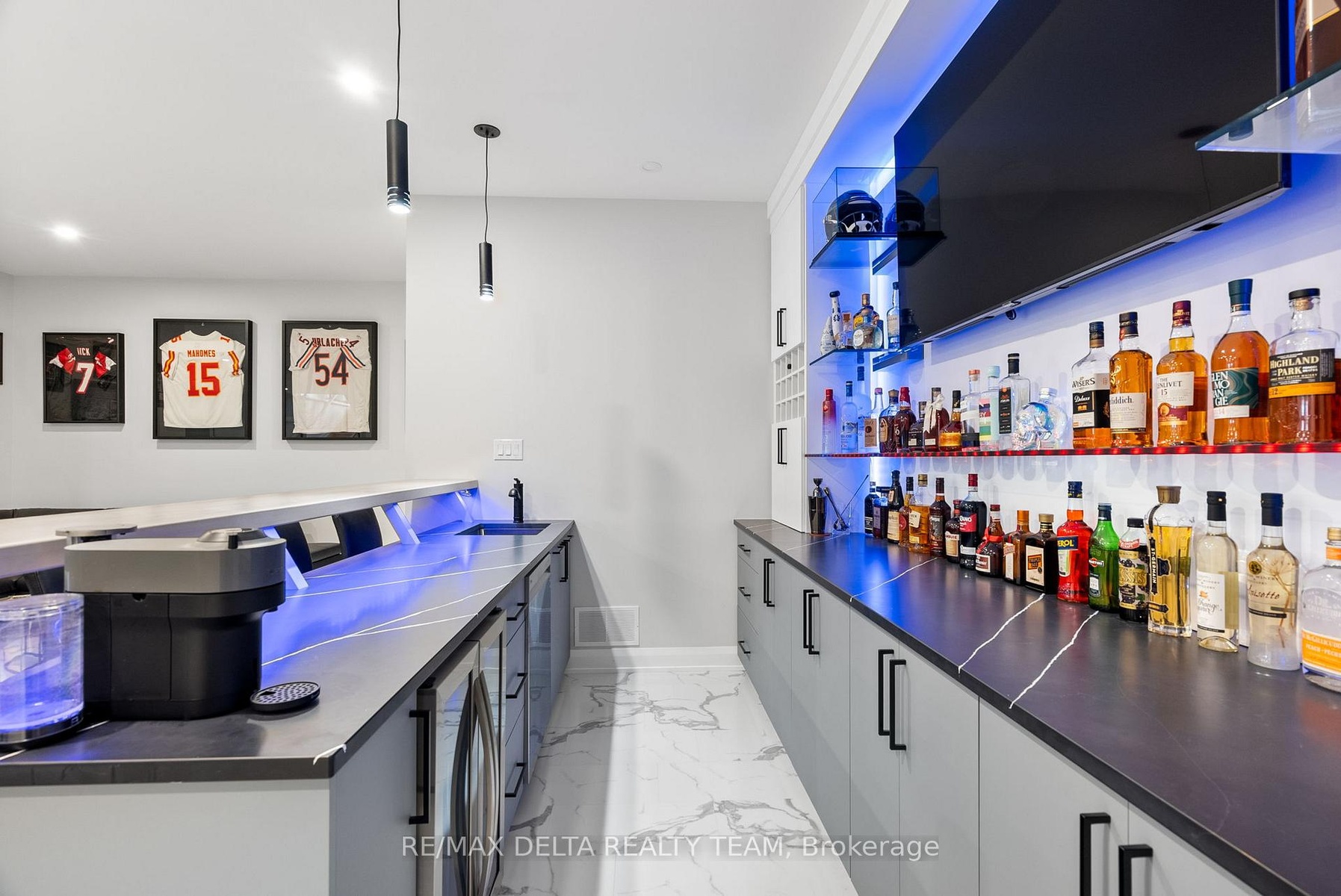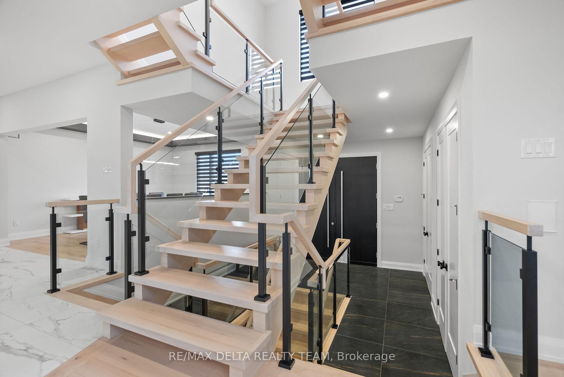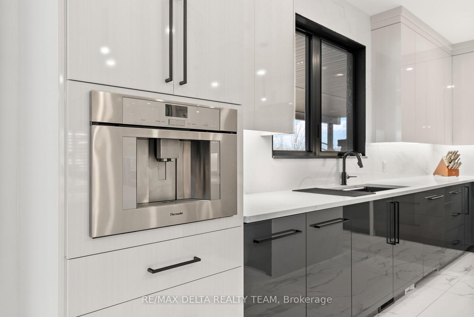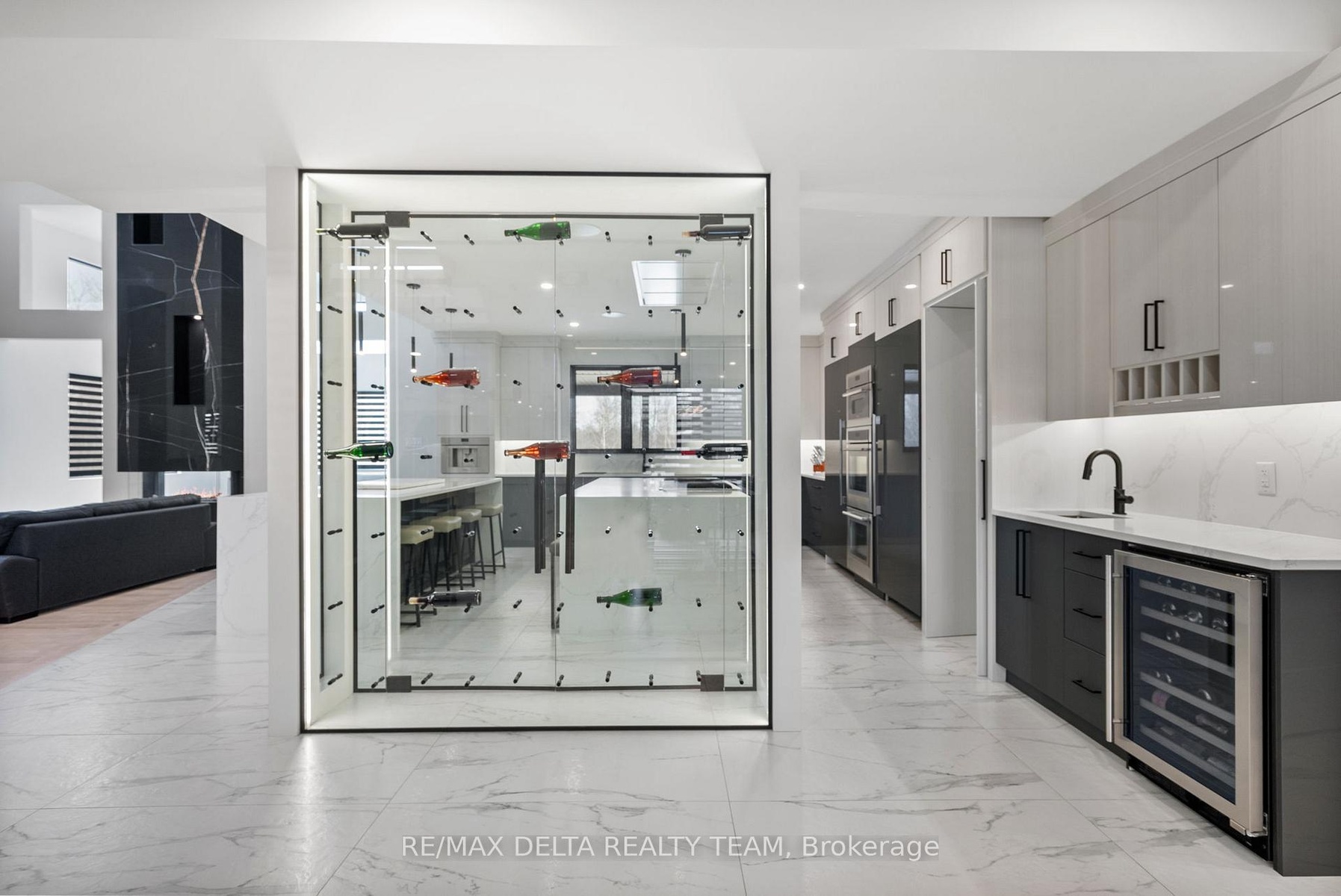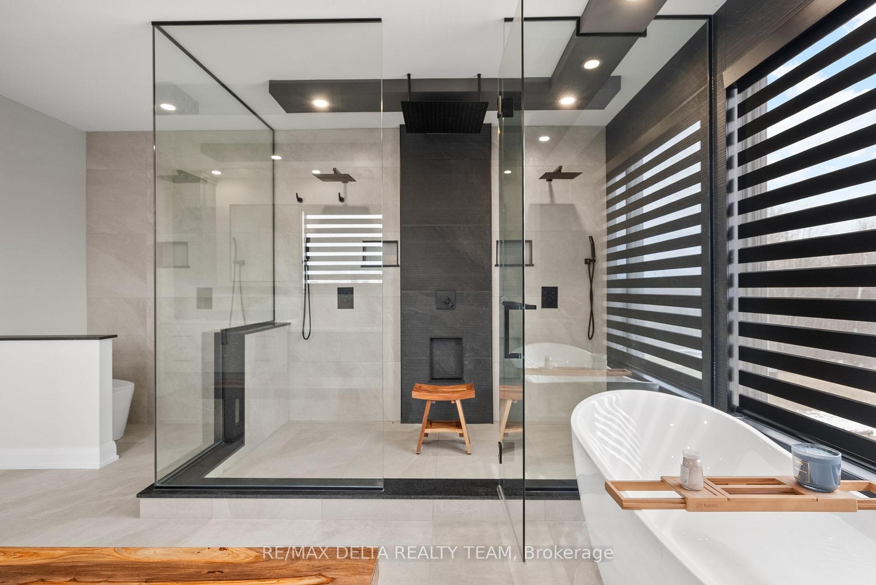 Tailored for the executive lifestyle, perfected for family living. Welcome to 663 Ballycastle Crescent a showstopping modern residence with commanding curb appeal, set on a quiet crescent lined with prestigious homes and backing onto peaceful open space. With over 5,700 sq. ft. of refined living space, this 5-bedroom, 6-bathroom home is a true architectural statement. The exterior offers bold, clean lines and grand scale, while inside, elegance meets innovation. Soaring 20-foot ceilings and a dramatic open-riser staircase set the tone in the main living area anchored by a double-sided porcelain-wrapped fireplace and lighted artwork niches. Maple and leather-finished porcelain floors run throughout the main level. The kitchen is both luxurious and functional, with dual waterfall quartz islands, Thermador appliances, a walk-in pantry, and a striking glass wine feature. A spacious main floor suite with walk-in closet and ensuite offers flexible comfort for guests or extended family. Upstairs, an 830 sq. ft. loft overlooks the great room, connecting two bedrooms each with private ensuites and walk-ins plus a bar area. The 540 sq. ft. primary suite offers a stunning gas fireplace, a dream walk-in closet with quartz island and a spa-inspired ensuite with freestanding tub, porcelain finishes, and custom-lit glass shower with rain heads and jets. The lower level features radiant-heated floors, a fireplace lounge, wet bar, theater, fifth bedroom and full bath, and a 900 sq. ft. commercial-grade gym with mirrors and glass dividers. Built-in media and smart systems run throughout. A 1,200 sq. ft. triple garage offers an oversized bay, loft storage, and backyard access. Two expansive decks add outdoor living space. Minutes from the new Hard Rock Casino and surrounded by luxury. This is a home that makes a statement.