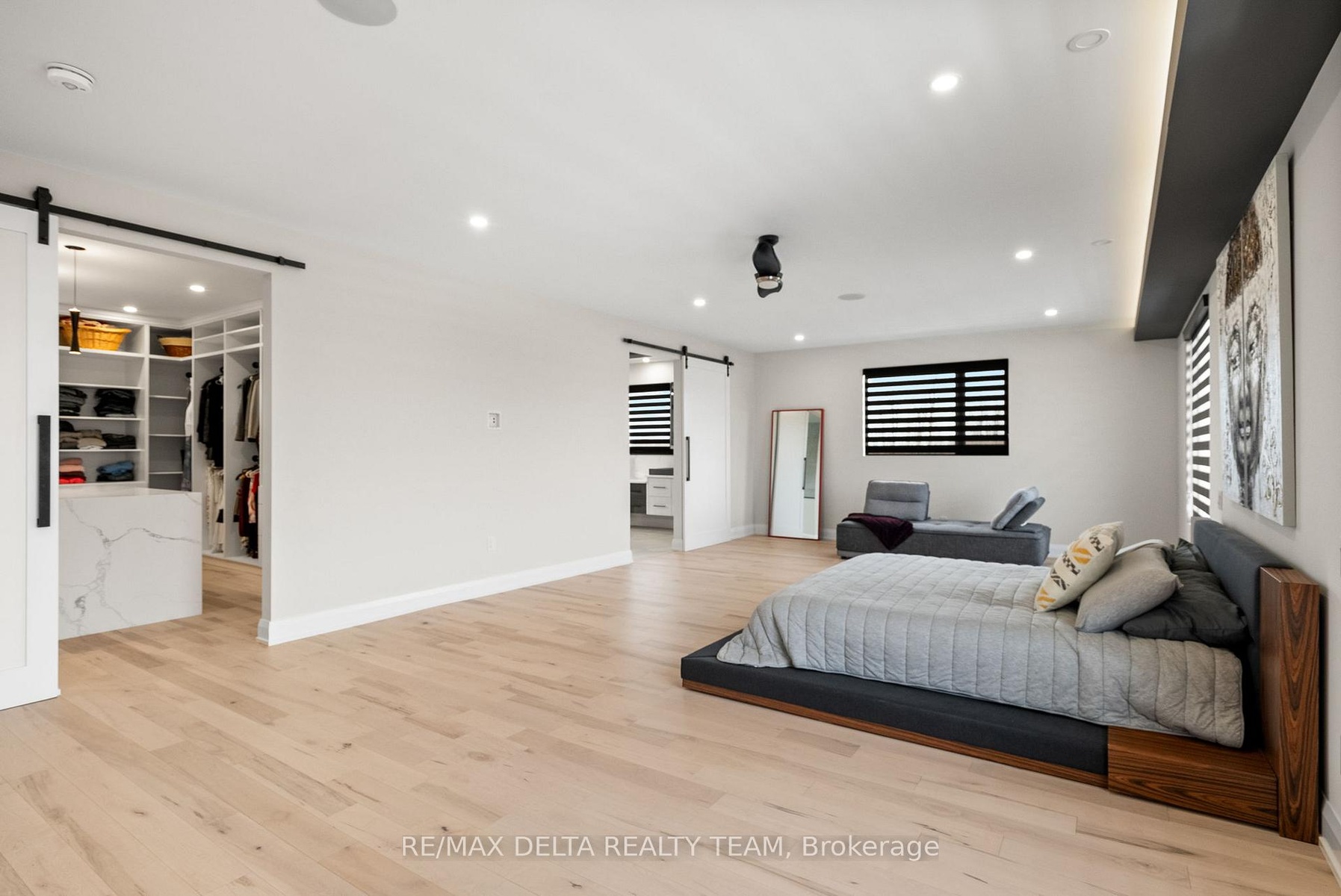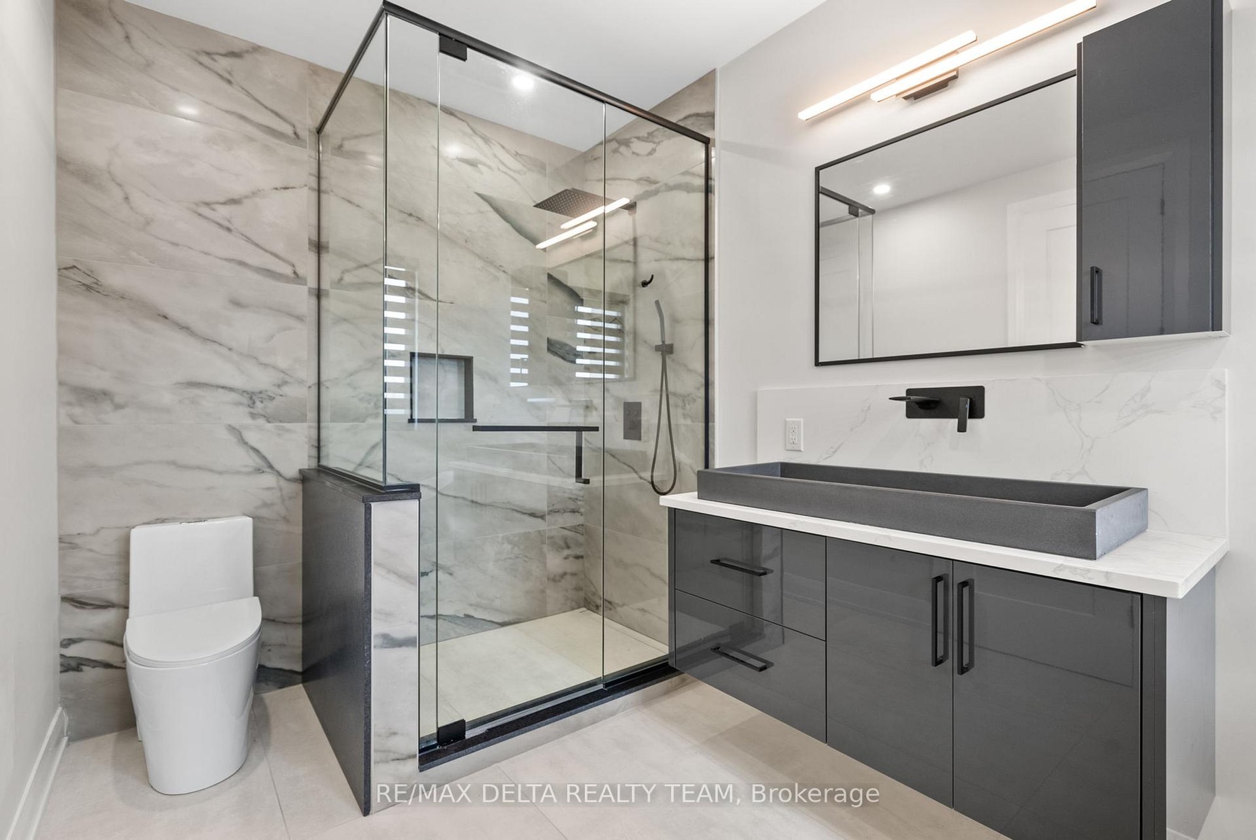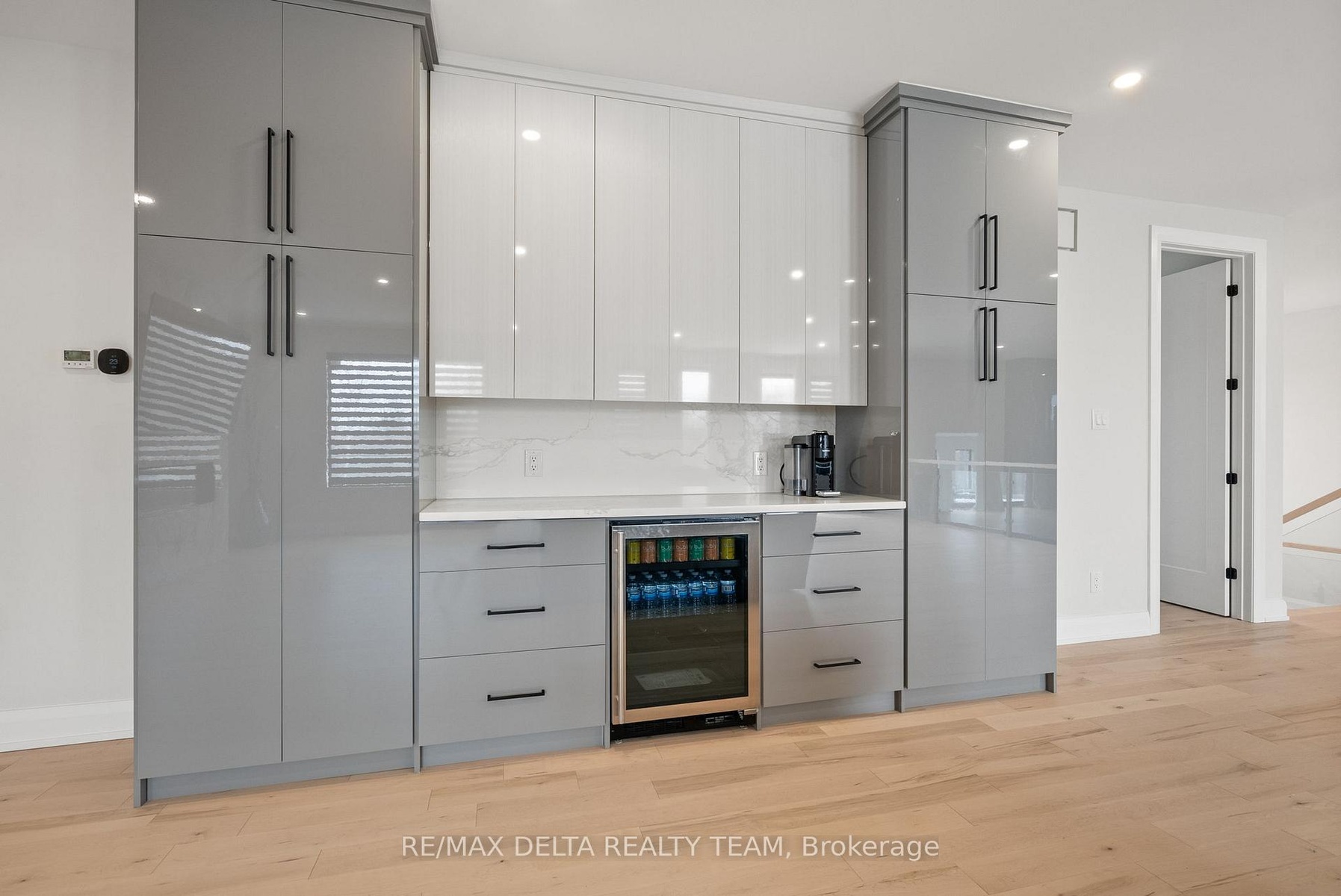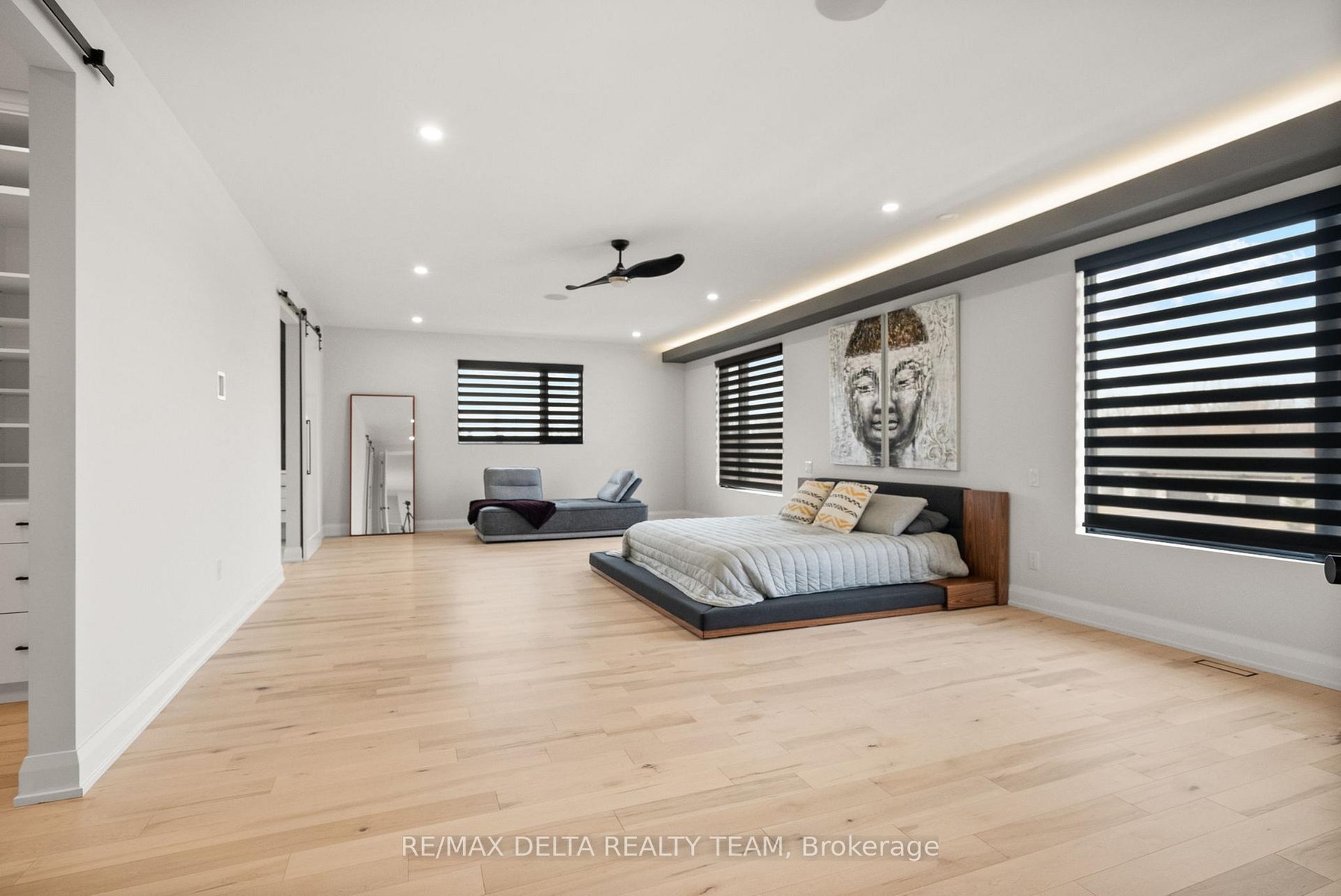 Tailored for the executive lifestyle, perfected for family living. Welcome to 663 Ballycastle Crescent a showstopping modern residence with commanding curb appeal, set on a quiet crescent lined with prestigious homes and backing onto peaceful open space. With over 5,700 sq. ft. of refined living space, this 5-bedroom, 6-bathroom home is a true architectural statement. The exterior offers bold, clean lines and grand scale, while inside, elegance meets innovation. Soaring 20-foot ceilings and a dramatic open-riser staircase set the tone in the main living area anchored by a double-sided porcelain-wrapped fireplace and lighted artwork niches. Maple and leather-finished porcelain floors run throughout the main level. The kitchen is both luxurious and functional, with dual waterfall quartz islands, Thermador appliances, a walk-in pantry, and a striking glass wine feature. A spacious main floor suite with walk-in closet and ensuite offers flexible comfort for guests or extended family. Upstairs, an 830 sq. ft. loft overlooks the great room, connecting two bedrooms each with private ensuites and walk-ins plus a bar area. The 540 sq. ft. primary suite offers a stunning gas fireplace, a dream walk-in closet with quartz island and a spa-inspired ensuite with freestanding tub, porcelain finishes, and custom-lit glass shower with rain heads and jets. The lower level features radiant-heated floors, a fireplace lounge, wet bar, theater, fifth bedroom and full bath, and a 900 sq. ft. commercial-grade gym with mirrors and glass dividers. Built-in media and smart systems run throughout. A 1,200 sq. ft. triple garage offers an oversized bay, loft storage, and backyard access. Two expansive decks add outdoor living space. Minutes from the new Hard Rock Casino and surrounded by luxury. This is a home that makes a statement.