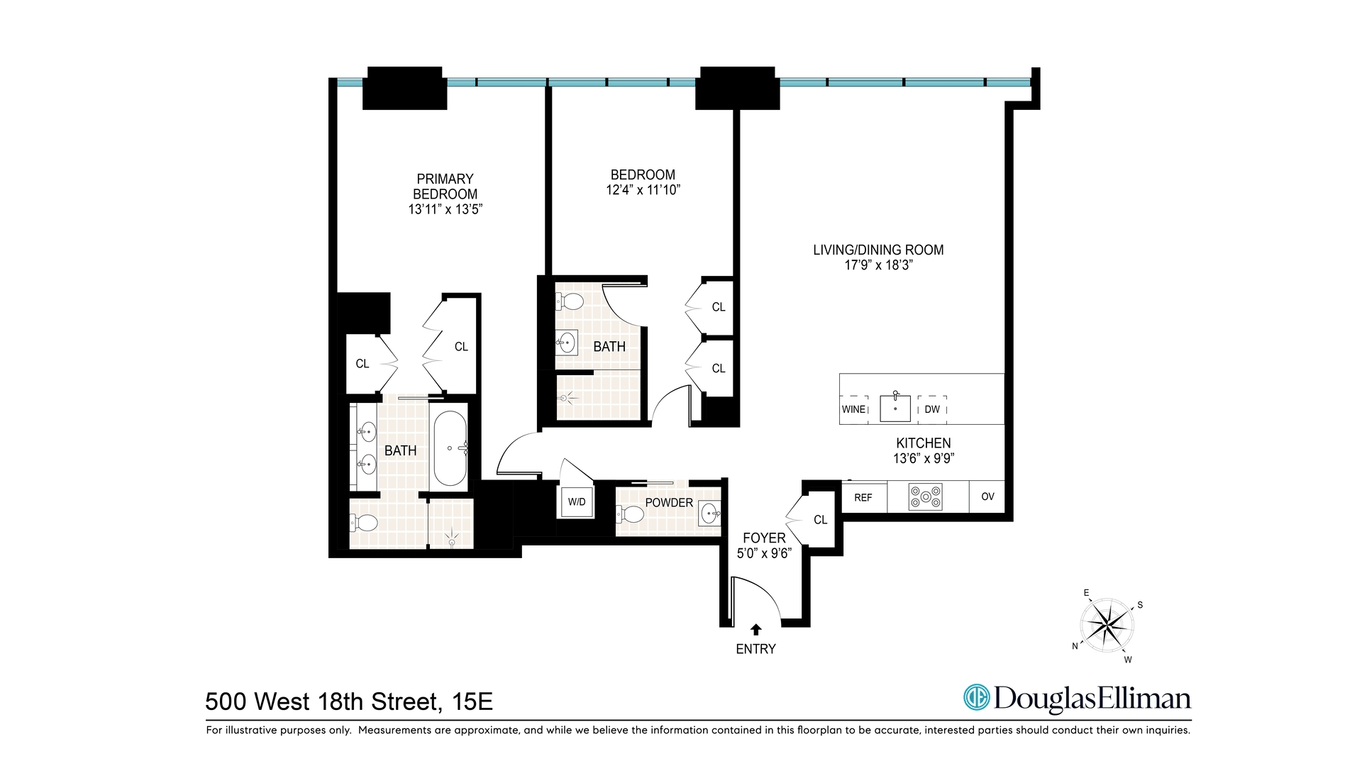 Residence East 15E is a luminous 1, 512 square foot two bedroom, two and a half bathroom home offering sweeping eastern skyline views through walls of floor to ceiling glass.