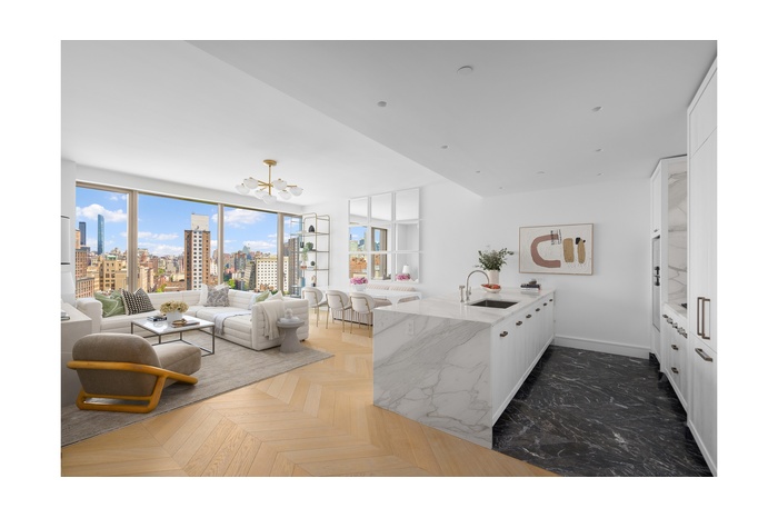 The gracious primary suite offers stunning city vistas, and a spa-quality bath clad in Arabescato Vagli Oro and Saint Laurent marbles. A Kaldewei soaking tub, radiant-heated floors, integrated LED lighting, and smoked oak vanities provide a serene, hotel-like experience.