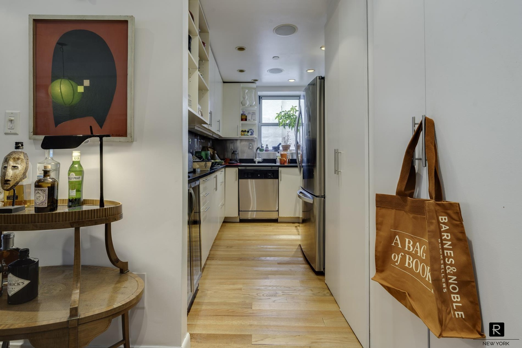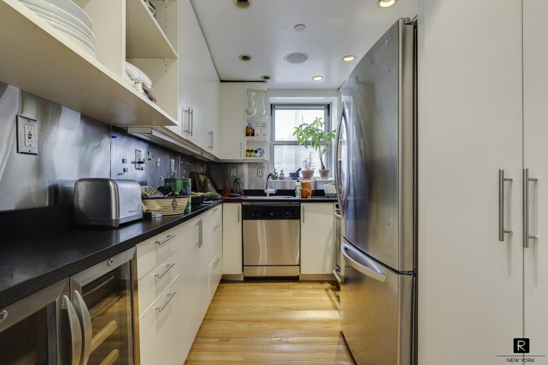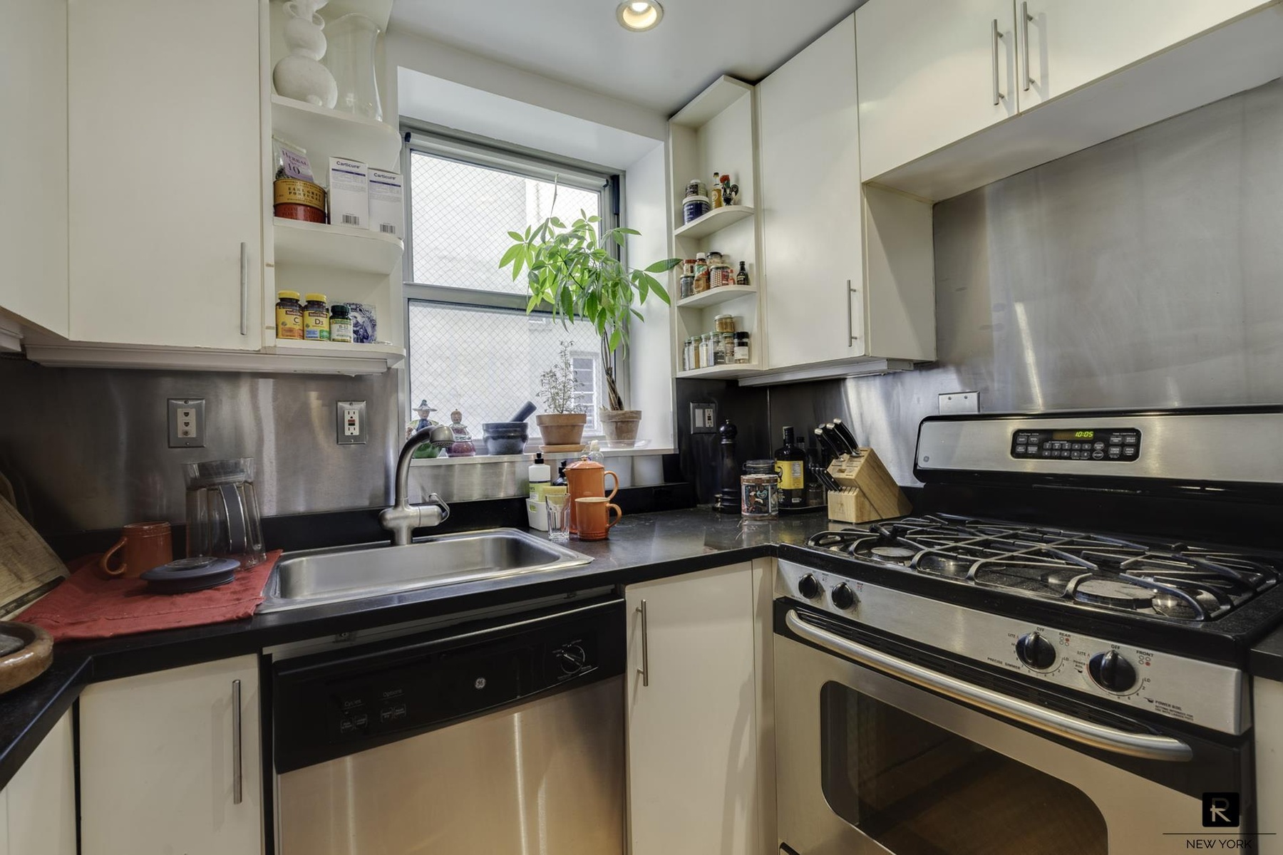 Windowed kitchen with stainless steel appliances and ample storage