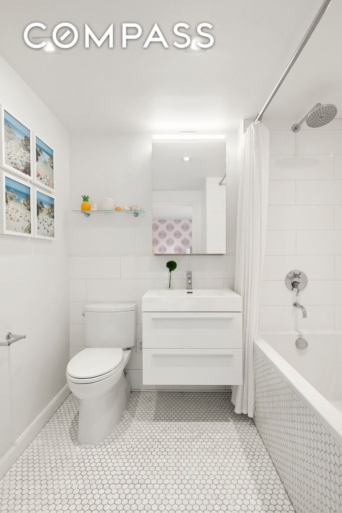 The spa-inspired bathroom is finished in classic white tile and designed for comfort, featuring a 28-inch deep soaking tub, rain-style shower, TOTO toilet, modern vanity, and timeless mosaic flooring.