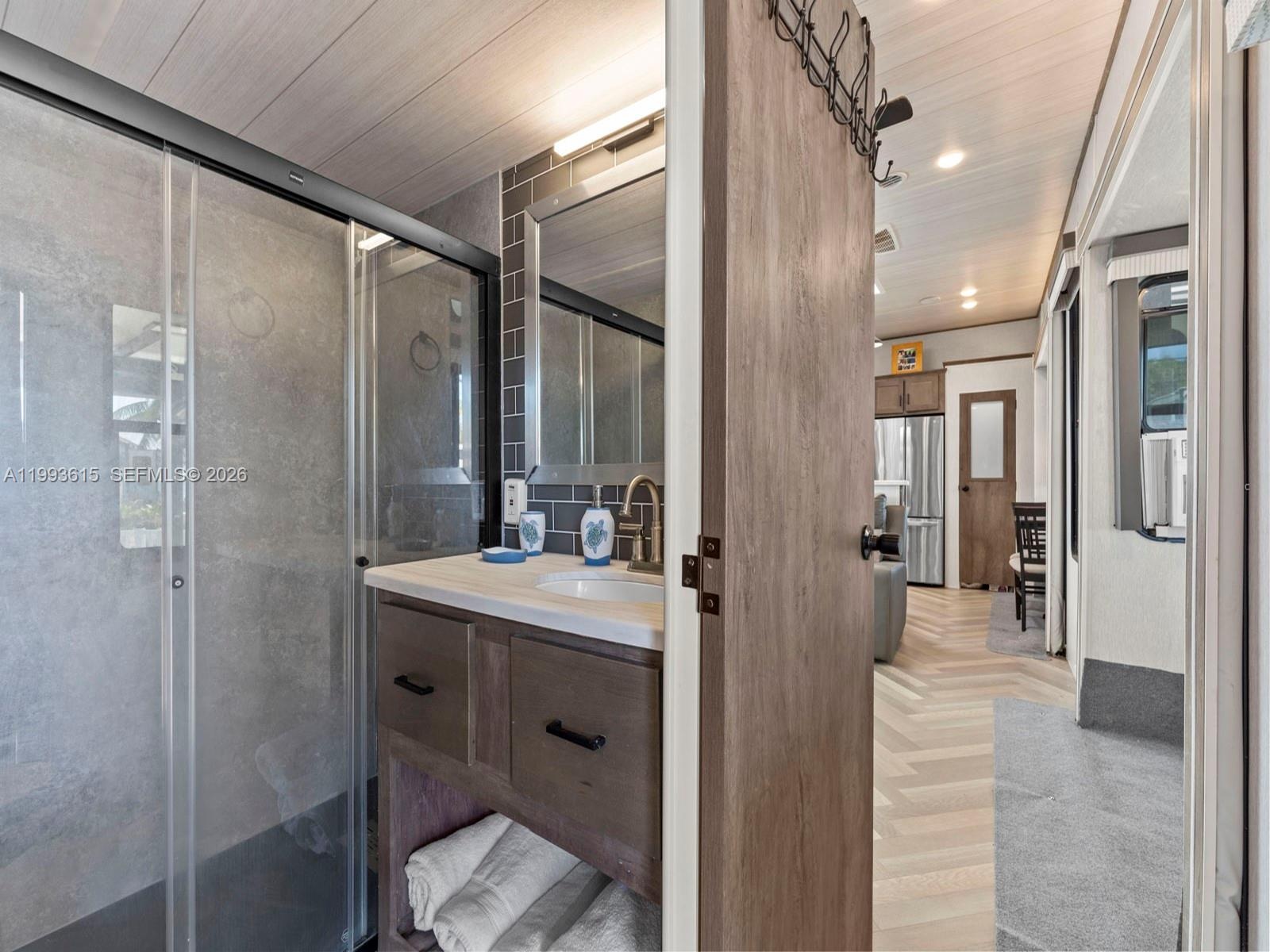 Additional upgrades include a private shed with extra storage, refrigerator, and full-size washer/dryer—a rare and valuable feature in the community.