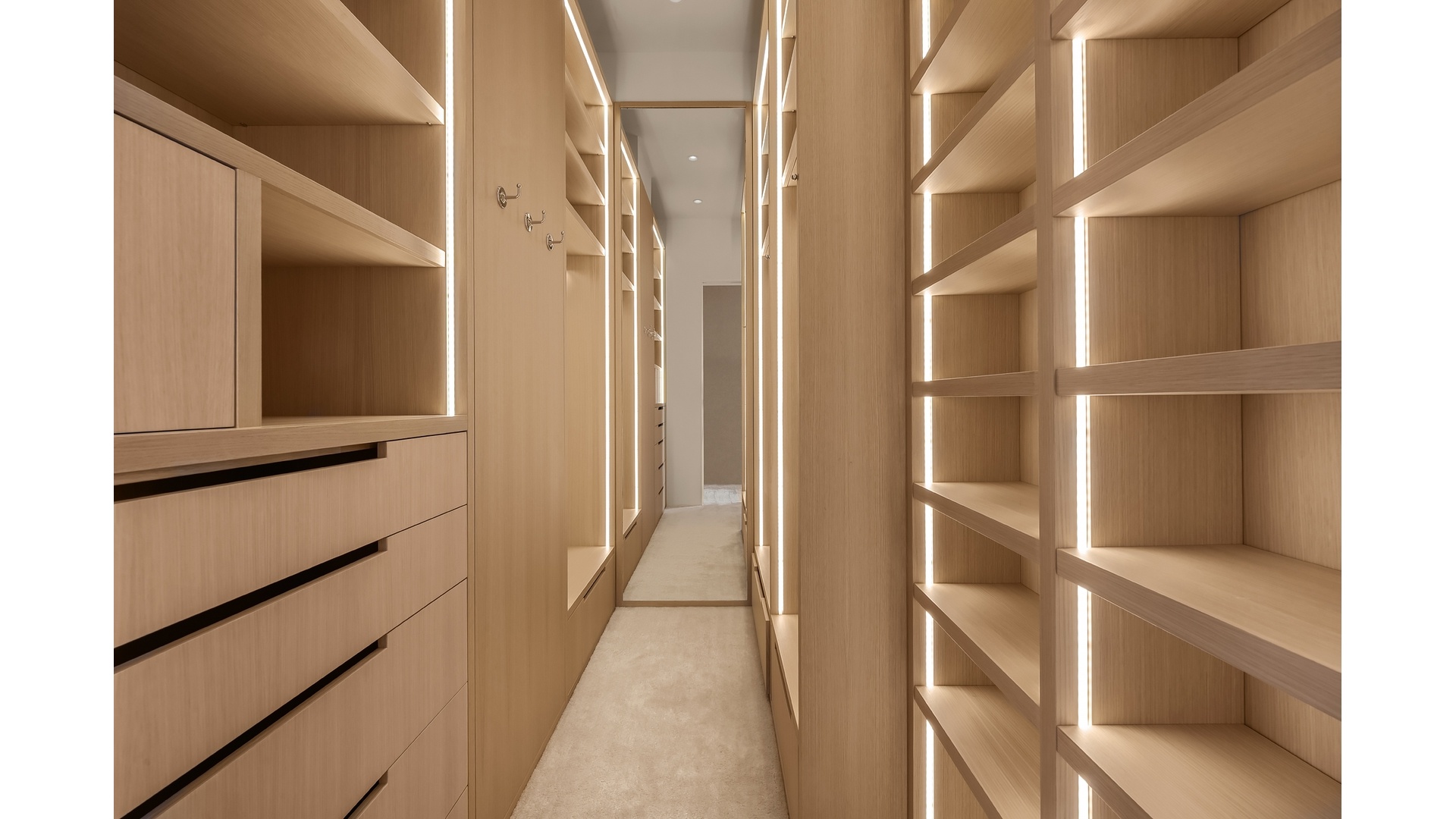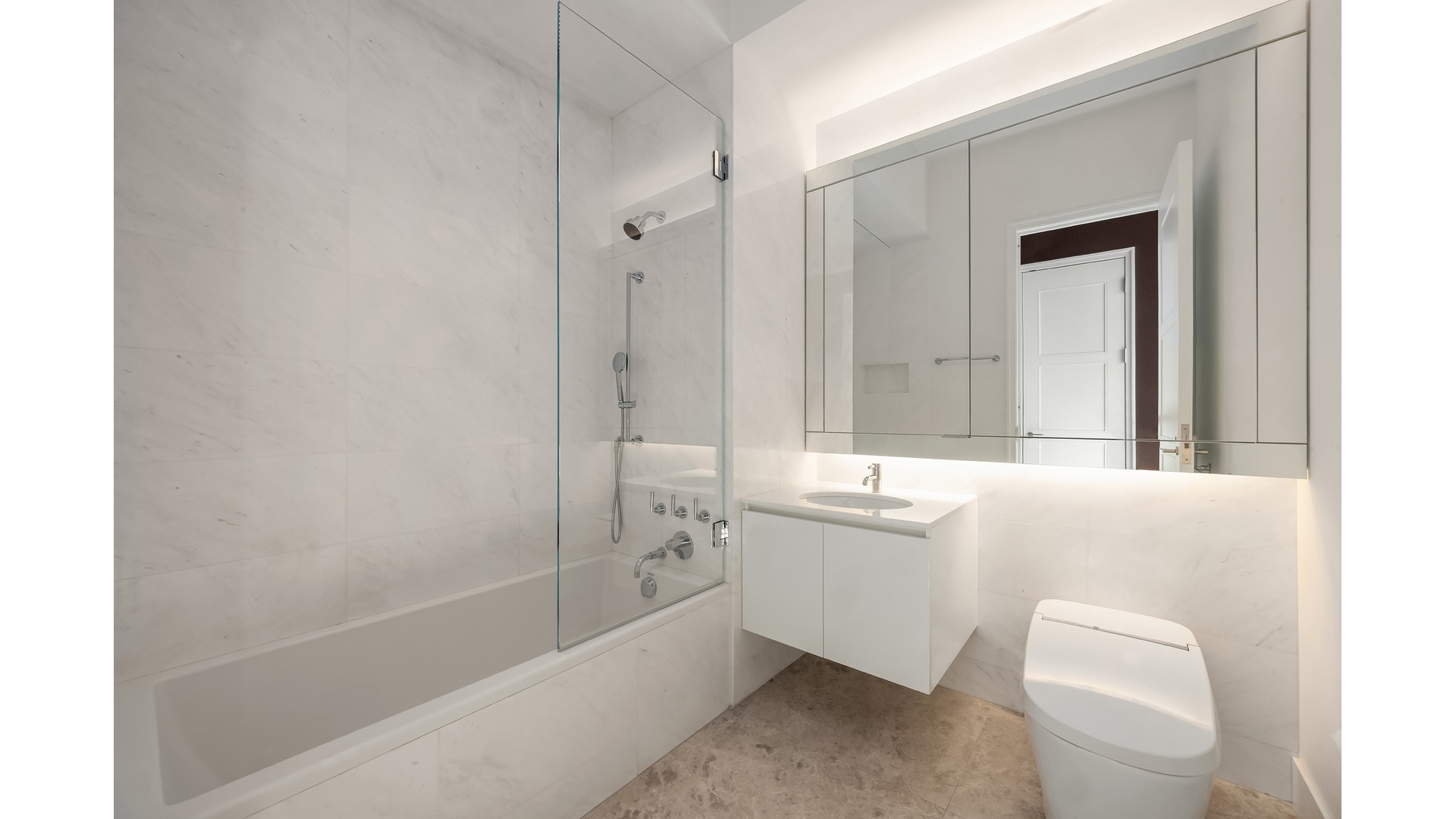 The tranquil primary suite serves as a private sanctuary, featuring a spa-quality marble bath with a deep soaking tub and glass-enclosed shower, as well as a custom natural oak walk-in closet. The secondary bedroom offers its own en suite bath and bespoke finishes, including walls upholstered in luxurious alpaca cashmere. Throughout the residence, solid oak flooring and finely crafted hardware reflect an uncompromising attention to detail.