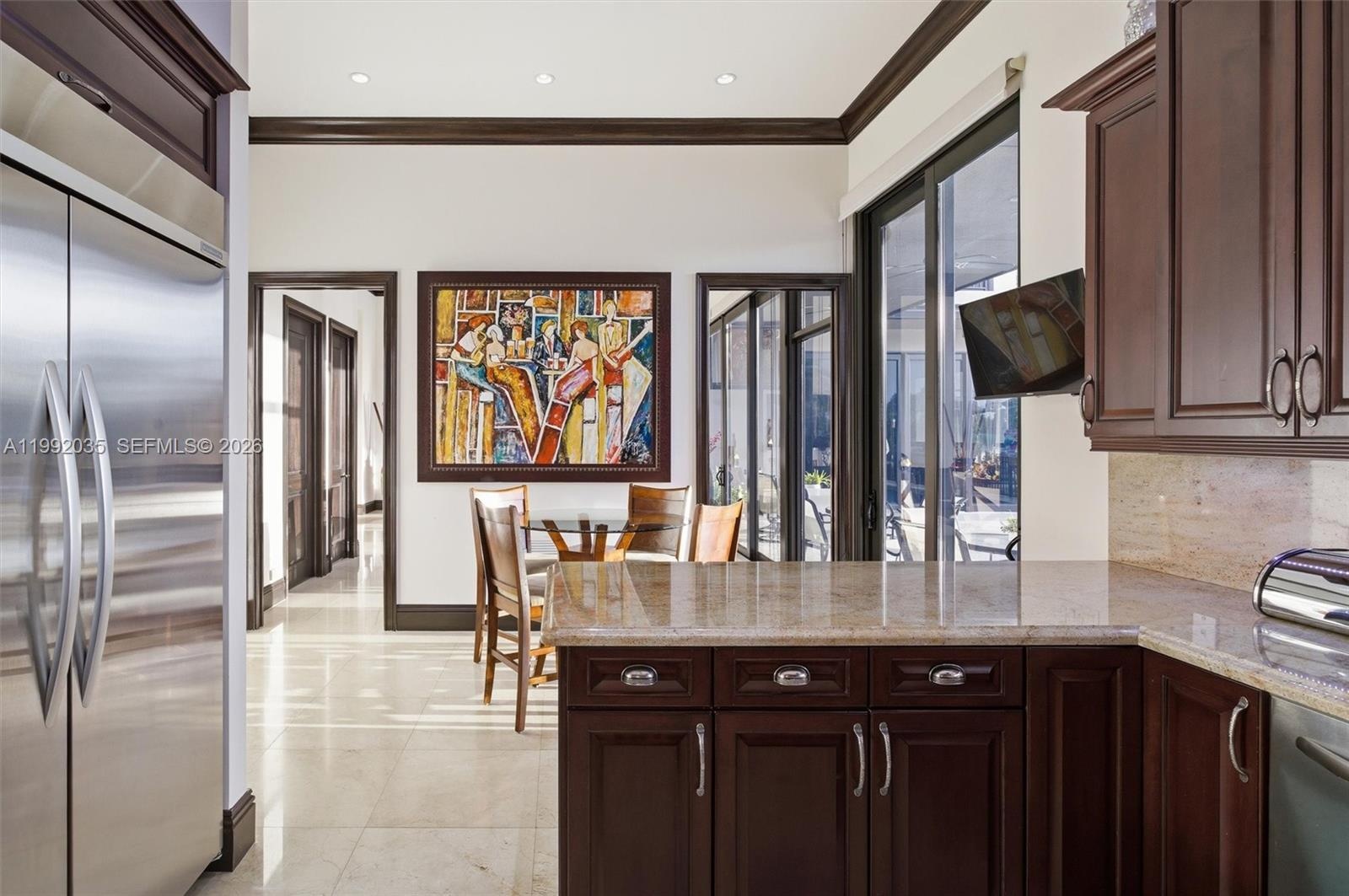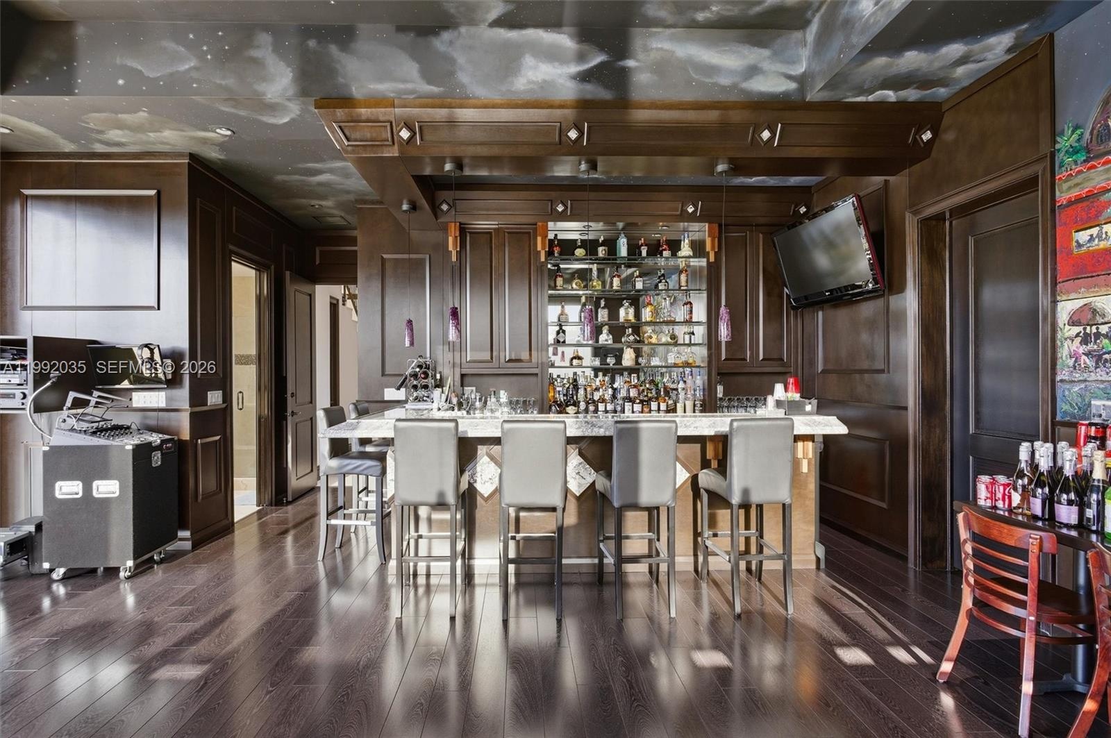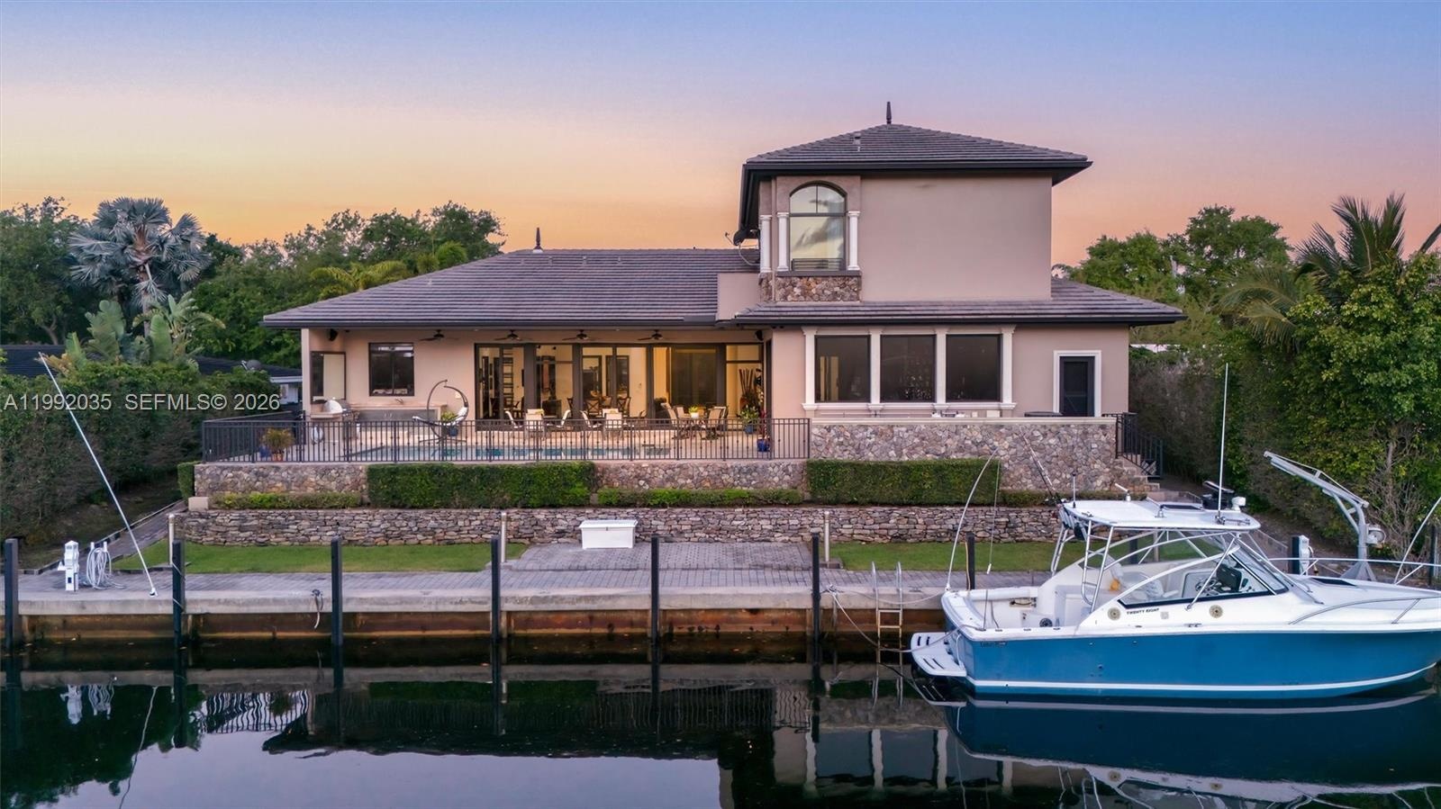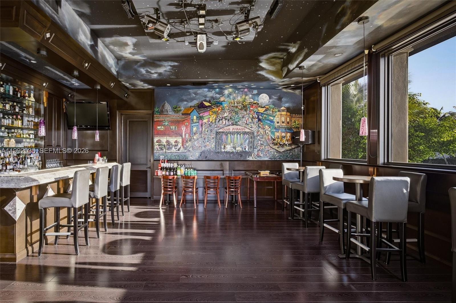 The gourmet kitchen features premium appliances, granite counters and custom cabinetry, perfect for entertaining. Elevate your lifestyle with a private club room featuring a full bar, private bathroom and VIP entertainment space overlooking the pool and dock, a true showpiece.