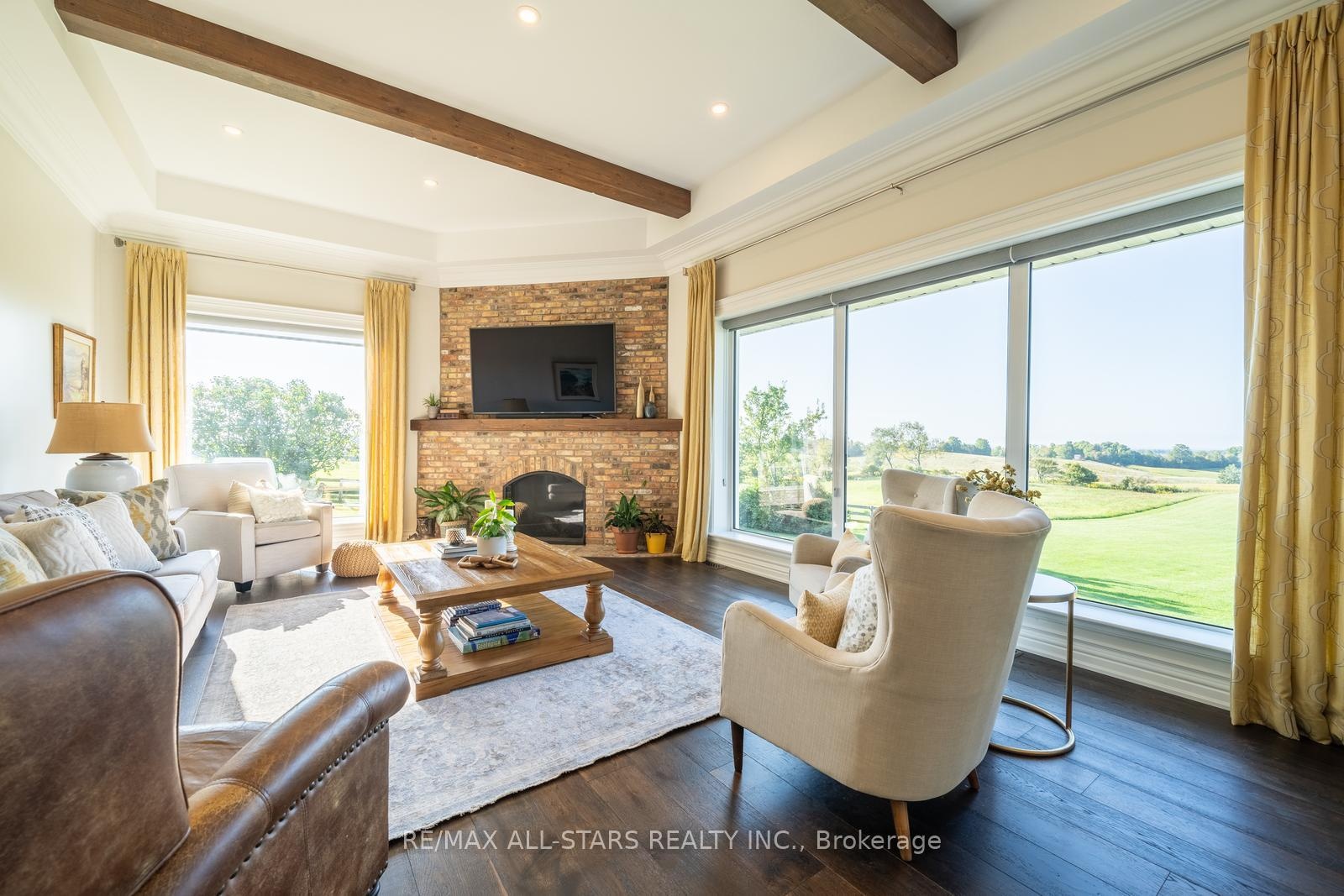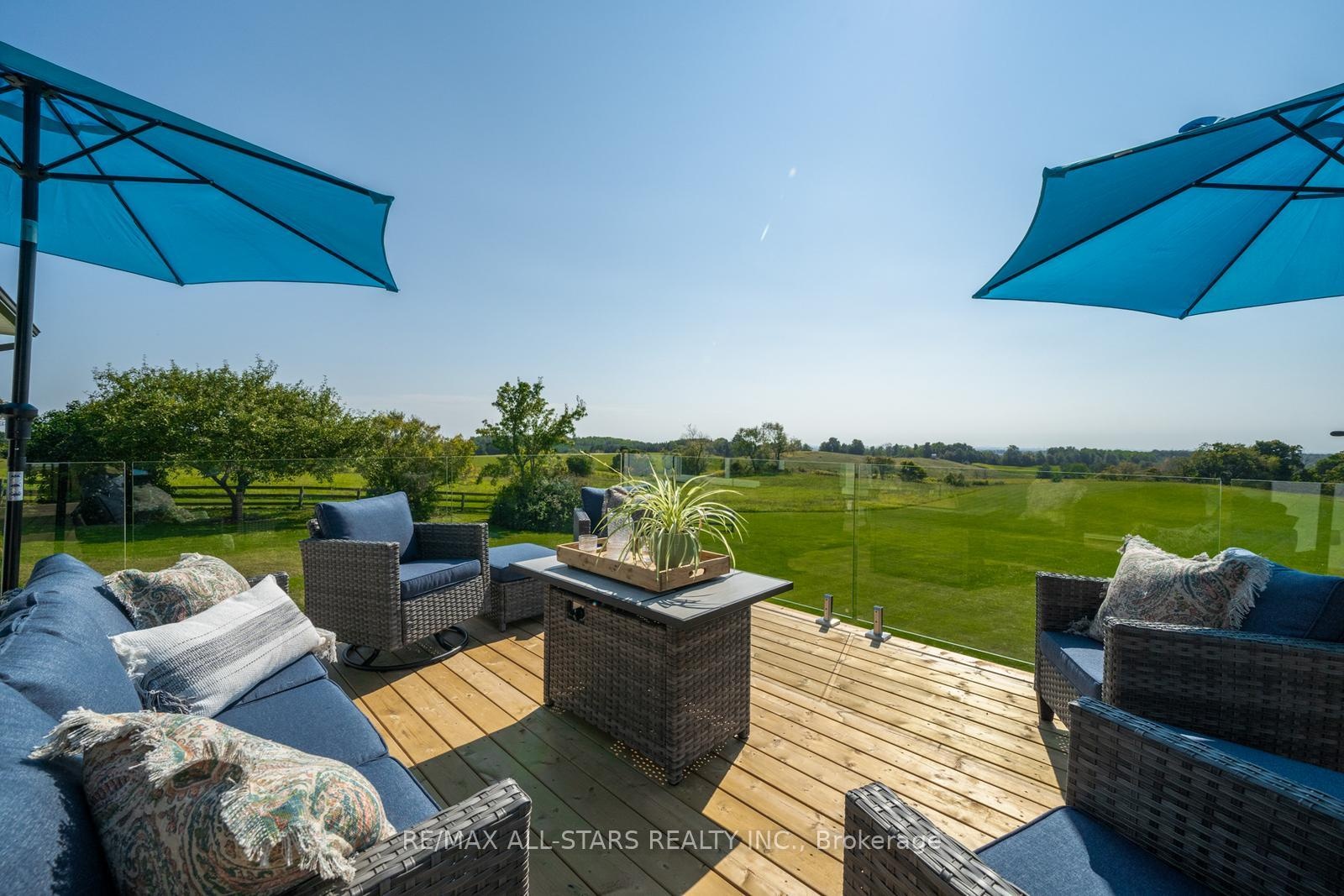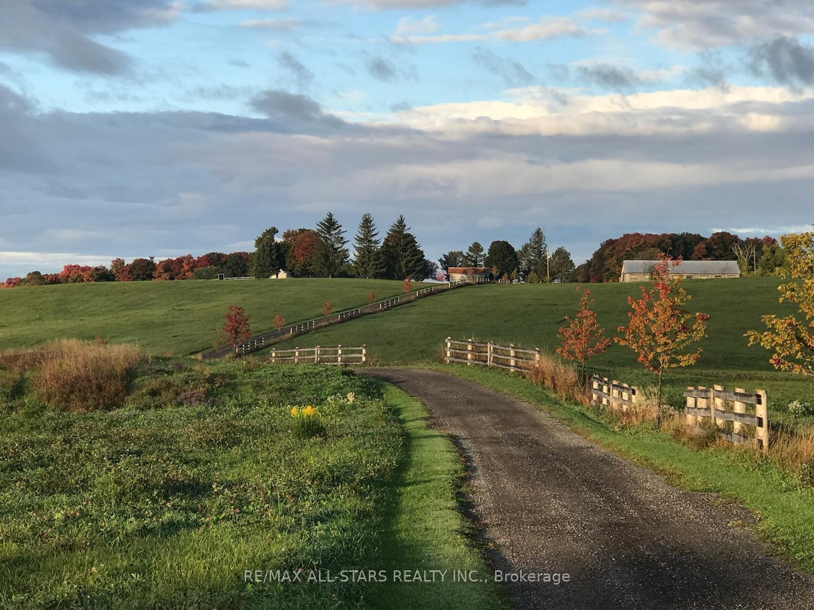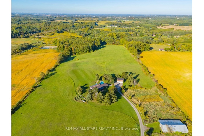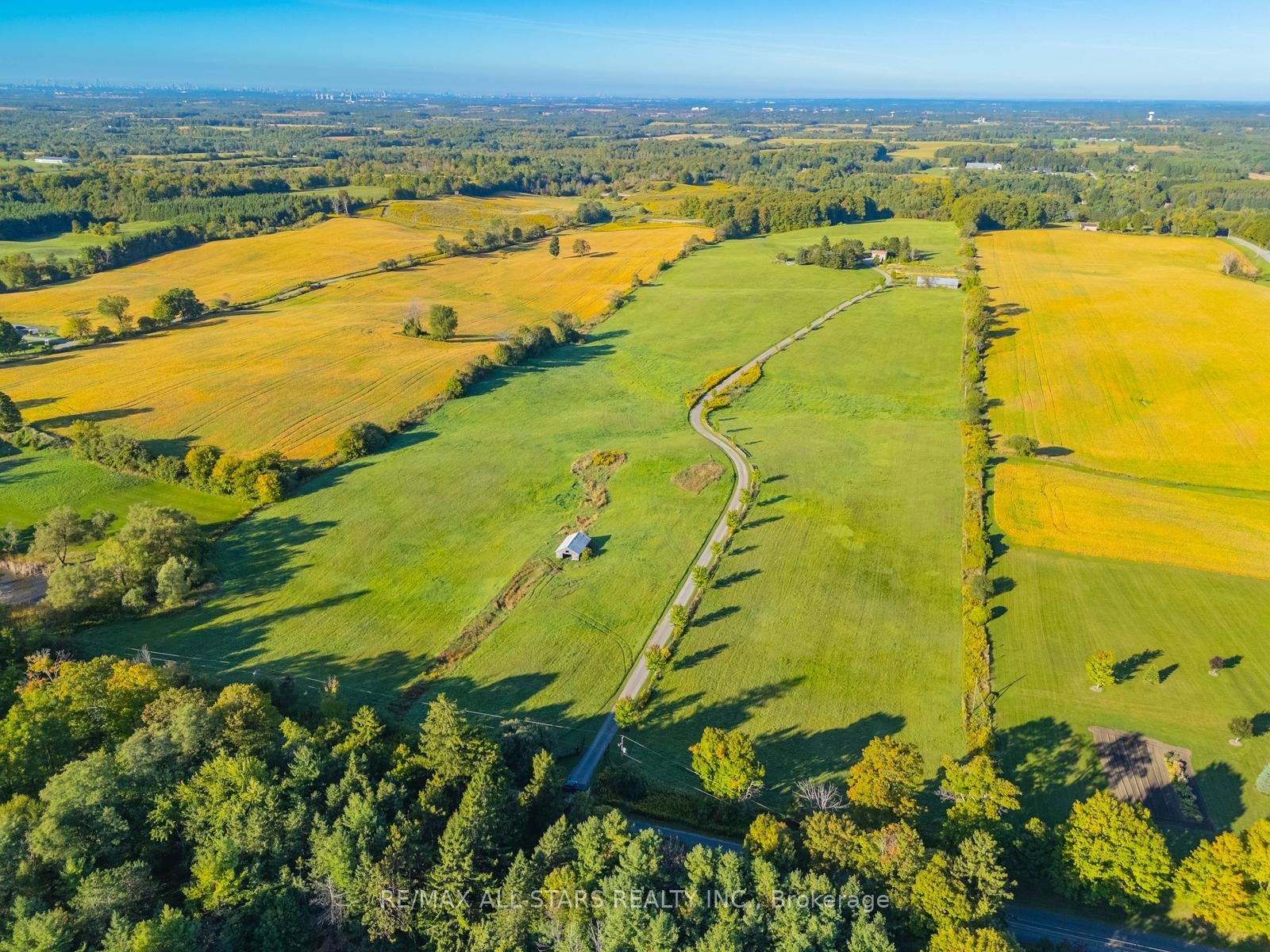 A Truly Exceptional 50-Acre Luxury Estate. Set atop rolling hills with sweeping countryside views, this remarkable estate offers a rare blend of privacy and tranquility-ideally located at the borders of Stouffville, Uxbridge, and Pickering. A long, winding driveway creates an impressive sense of arrival, guiding you through picturesque landscapes to the home. Inside, the light-filled main living area features 12-foot ceilings, exposed beams, and an antique-style brick fireplace. Expansive windows frame breathtaking west-facing views, bringing the outdoors in. The chef-inspired kitchen offers high-end appliances, European-style finishes, and a large island ideal for everyday living and entertaining. An expansive deck with glass railings extends the living space outdoors, showcasing panoramic views of rolling hills and, in the distance, the Toronto skyline. The primary suite is a private retreat with a walk-in closet, built-in wardrobe, 5-piece ensuite, and walkout to the east lawn. Three additional bedrooms and a beautifully updated 5-piece bath provide ample space for family and guests.The walkout lower level includes a spacious recreation area, two home offices, a full bath, and a large bedroom, all with stunning west-facing views. Outdoors, enjoy approx. 6 acres of maple bush, a seasonal pond, and a charming barn with original paddocks and vintage nameplates. An oversized garage accommodates three large trucks with hydro and roughed-in heated floors. Additional features include a heated in ground pool, hot tub, landscaped gardens, geothermal heating, in-floor heating, and extensive updates throughout. A truly special property that must be experienced to be appreciated. You won't want to miss this one!