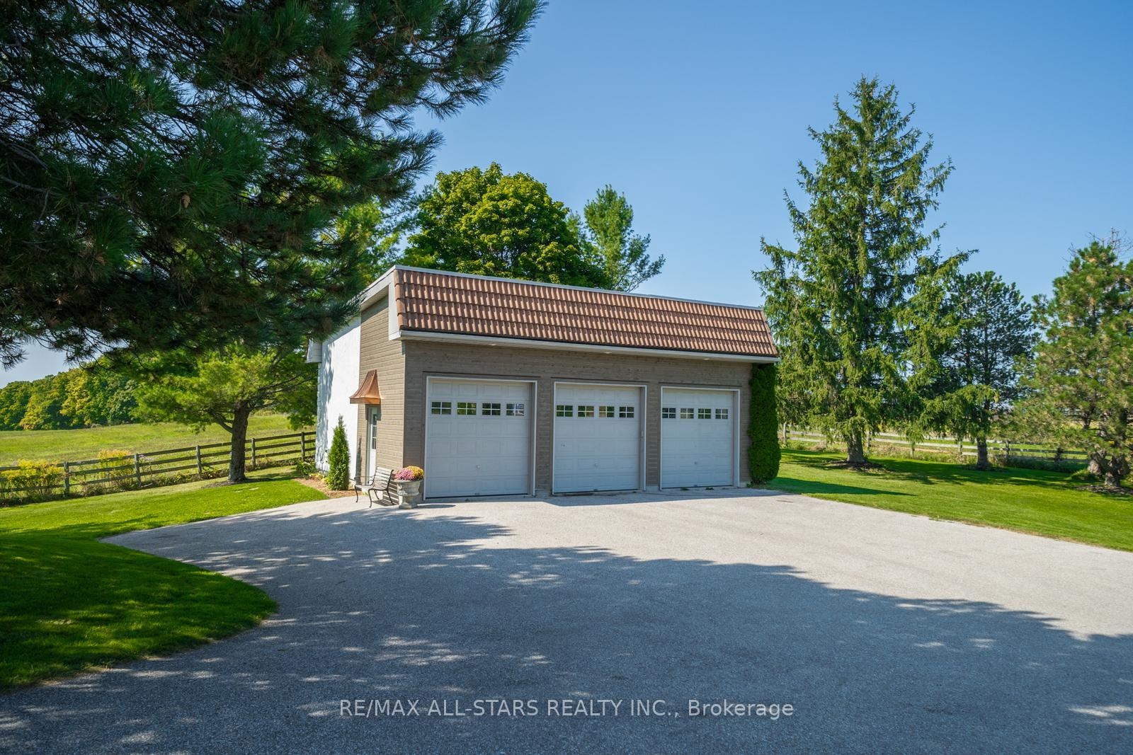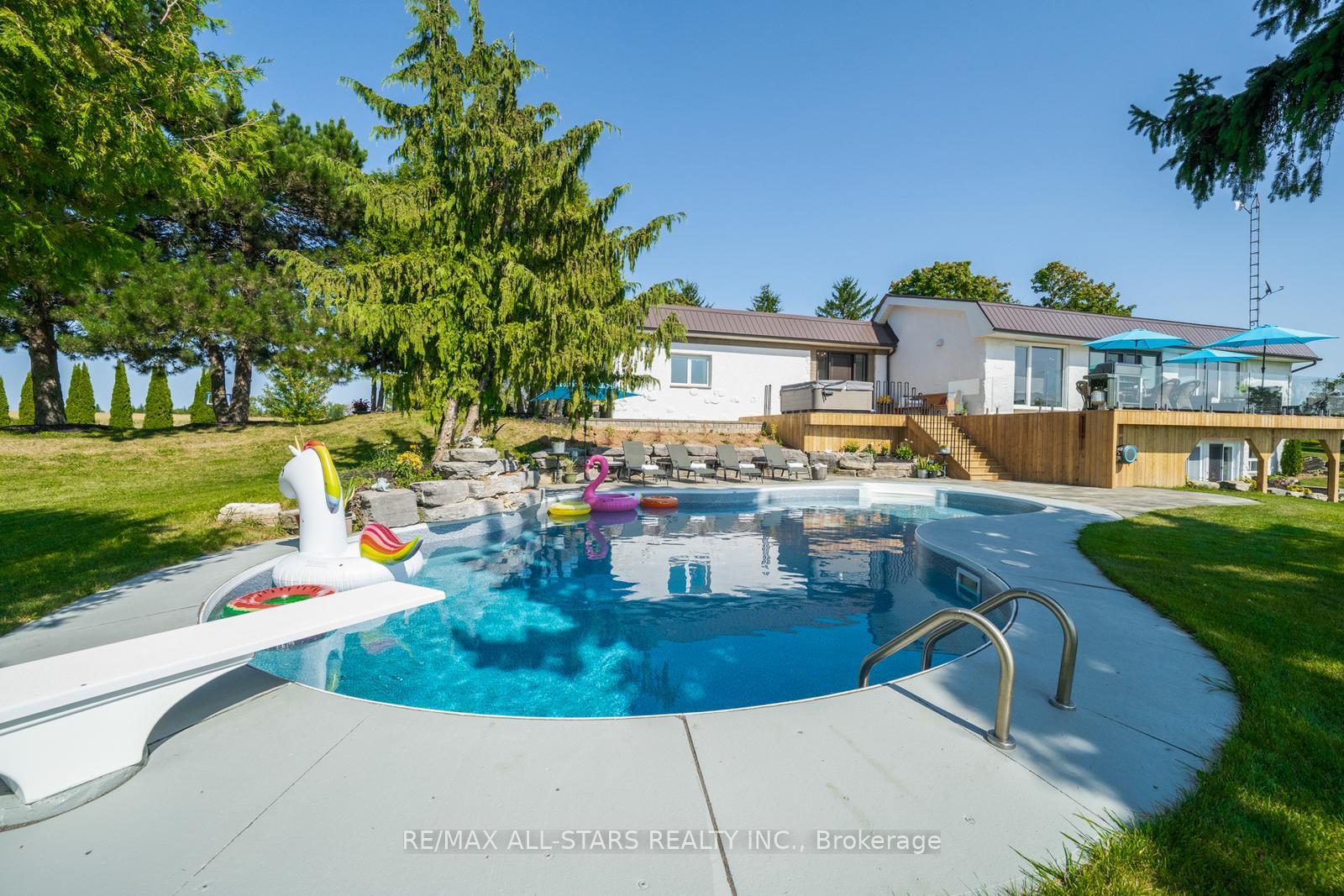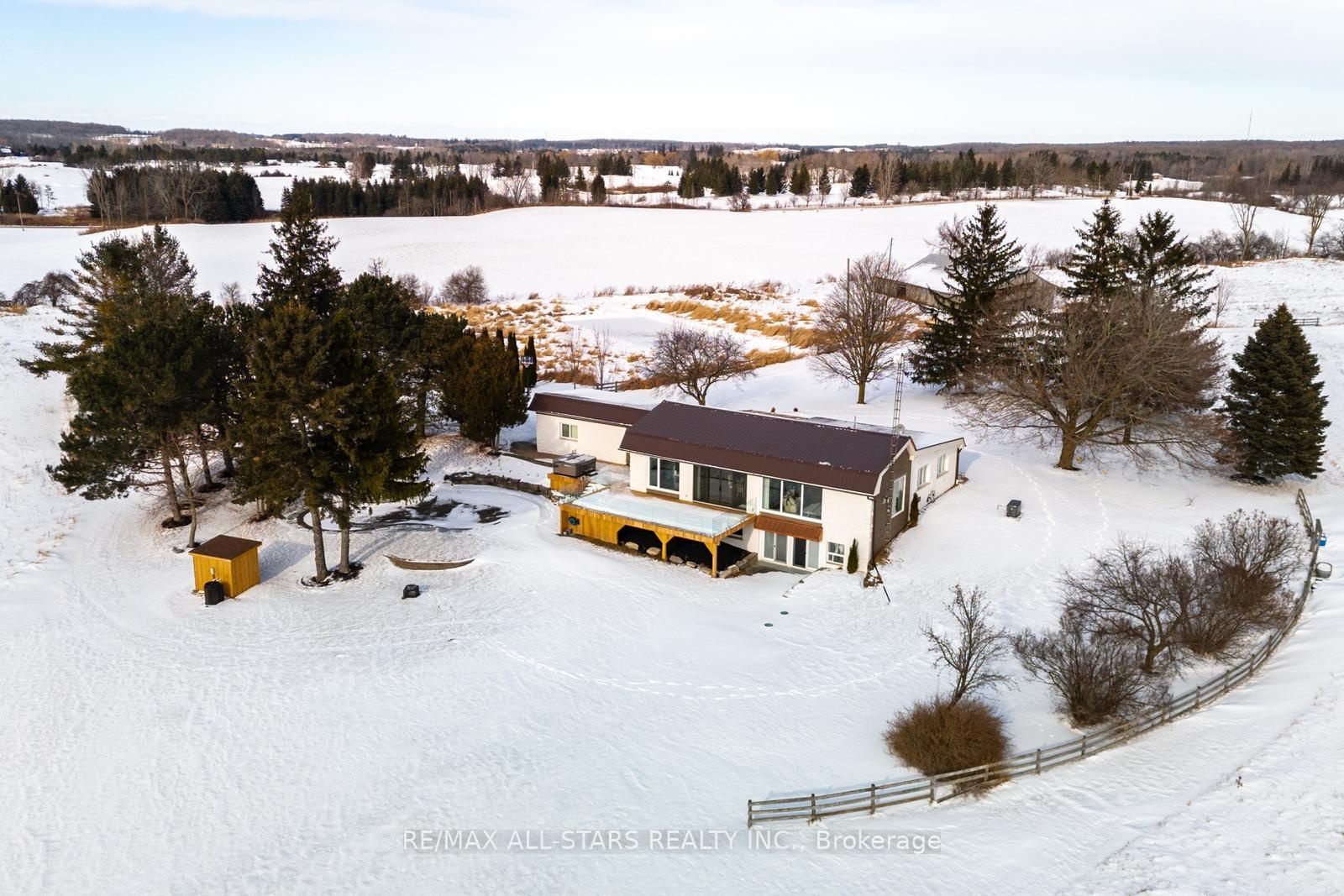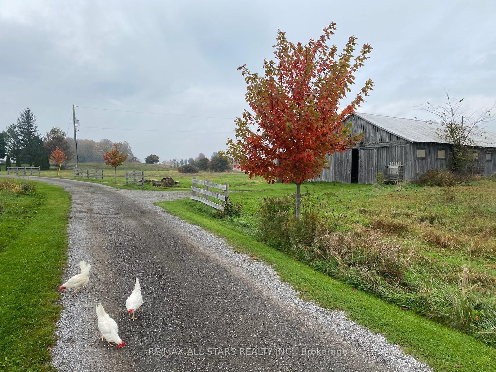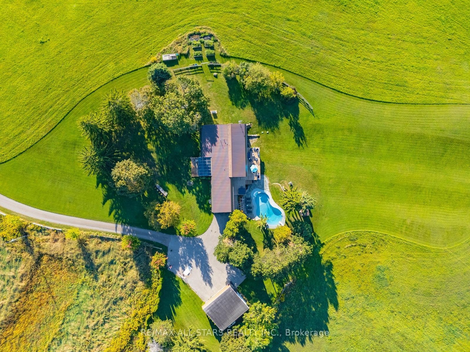 A Truly Exceptional 50-Acre Luxury Estate. Set atop rolling hills with sweeping countryside views, this remarkable estate offers a rare blend of privacy and tranquility-ideally located at the borders of Stouffville, Uxbridge, and Pickering. A long, winding driveway creates an impressive sense of arrival, guiding you through picturesque landscapes to the home. Inside, the light-filled main living area features 12-foot ceilings, exposed beams, and an antique-style brick fireplace. Expansive windows frame breathtaking west-facing views, bringing the outdoors in. The chef-inspired kitchen offers high-end appliances, European-style finishes, and a large island ideal for everyday living and entertaining. An expansive deck with glass railings extends the living space outdoors, showcasing panoramic views of rolling hills and, in the distance, the Toronto skyline. The primary suite is a private retreat with a walk-in closet, built-in wardrobe, 5-piece ensuite, and walkout to the east lawn. Three additional bedrooms and a beautifully updated 5-piece bath provide ample space for family and guests.The walkout lower level includes a spacious recreation area, two home offices, a full bath, and a large bedroom, all with stunning west-facing views. Outdoors, enjoy approx. 6 acres of maple bush, a seasonal pond, and a charming barn with original paddocks and vintage nameplates. An oversized garage accommodates three large trucks with hydro and roughed-in heated floors. Additional features include a heated in ground pool, hot tub, landscaped gardens, geothermal heating, in-floor heating, and extensive updates throughout. A truly special property that must be experienced to be appreciated. You won't want to miss this one!