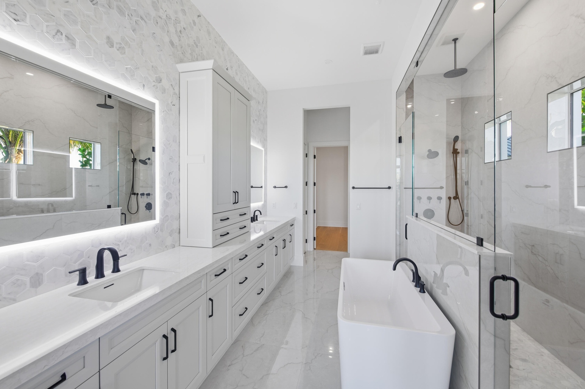 Sprawling main house has 4 bedrooms each with ensuite bathrooms and walk in closets. Home also boasts an additional powder room, home theater with wet bar and Den space. The kitchen area is sure to delight with a wine cellar and separate prep kitchen area. Impressive pocketing sliders open to covered lanai overlooking the pool area. Guest house features a Gracious Bedroom and Bath, Cabana bath, Den, Built in Kitchen, laundry room & handy storage area. Zero Corner Slider doors open to the wrap around porch. Separate 4 car garage building provides ample storage. Opulent Finishes Added Throughout.