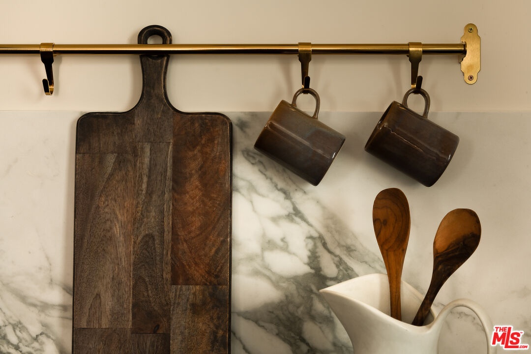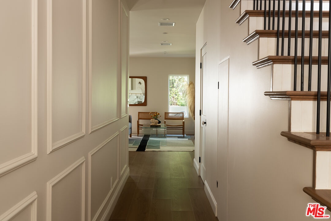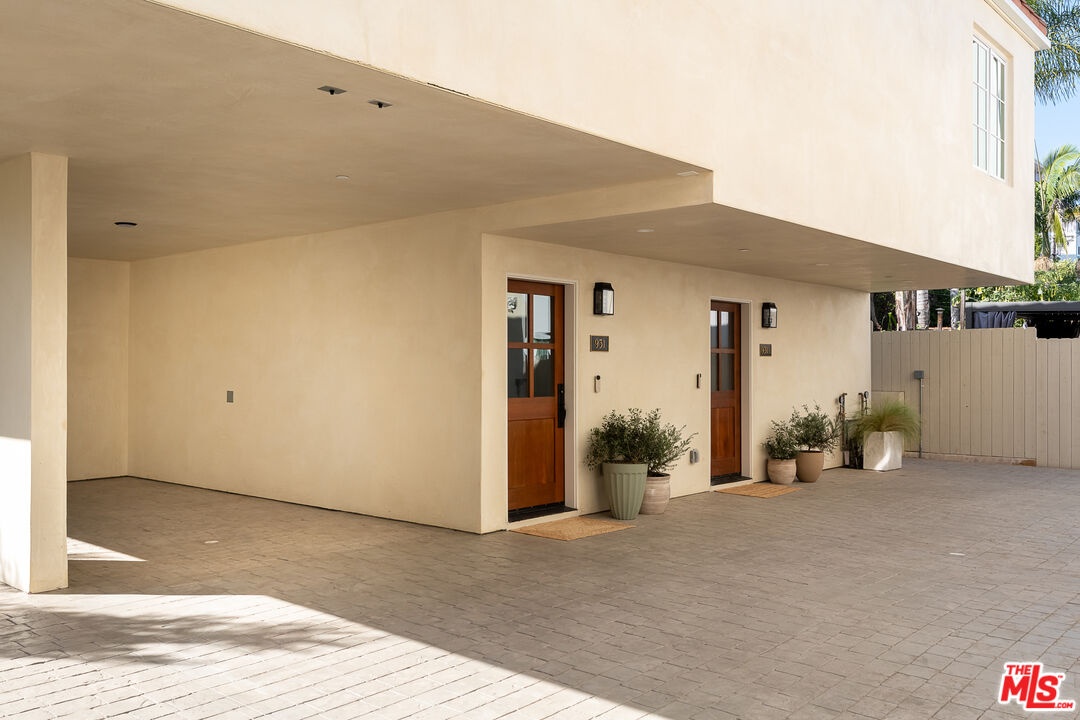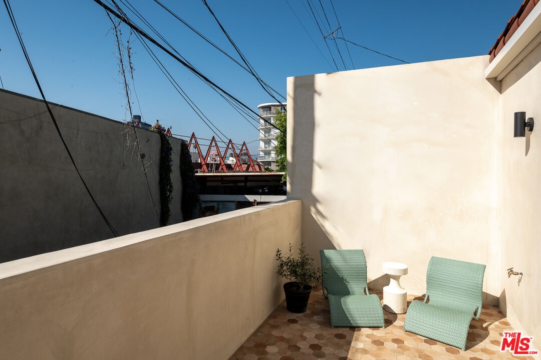 This newly constructed 3-bed, 3-bath Spanish-style residence by Cassa Design Studio blends timeless architectural character with a refined, design-driven vision in the heart of Mid-Wilshire. Light-filled interiors offer an effortless flow, with the main level anchored by a designer kitchen ideal for entertaining. Dark granite countertops, a striking Arabescato porcelain backsplash, brass pot rail detailing, and a custom Portola Roman clay range hood introduce depth and texture, while a built-in dining nook adds both function and thoughtful design. The private outdoor patio extends directly from the living and dining areas, creating a seamless indoor-outdoor connection ideal for everyday living and entertaining, all set against lush, Mediterranean-inspired landscaping. A moody green Roman clay powder room adds a rich, design-forward moment on the main level. Upstairs, three generously sized bedrooms offer comfort and privacy, including a spacious primary suite with a customizable walk-in closet and a private balcony finished with zellige-inspired terracotta tile. The primary bath is designed with intention, featuring a double vanity and an oversized walk-in shower with black penny marble flooring and refined Arabescato porcelain surfaces. A full third bath is equally considered, incorporating sage green zellige-inspired tile and classic Spanish flooring. Curated brass fixtures and statement lighting bring warmth throughout. Additional features include HVAC, hardwood flooring, a full laundry room, Integrated A/V wiring (Cat6), paid off solar panels, Ring doorbell, and Nest thermostat. The property is gated and secured, with dedicated parking and an EV charging outlet. Situated in a highly coveted neighborhood near Museum Row and the upcoming Purple Line, and just around the corner from Lassens, Republique, All Season Brewing Company, Met Her At A Bar, LACMA, and Hancock Park, this residence offers a refined blend of design, comfort, and modern living.