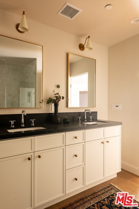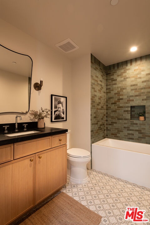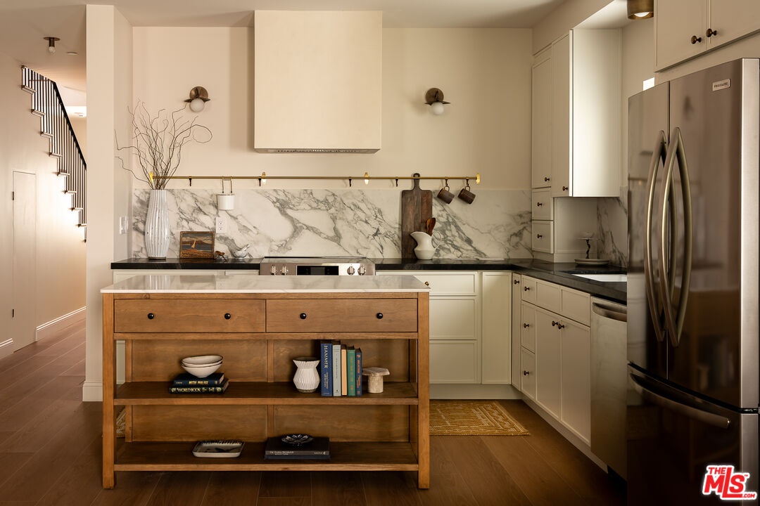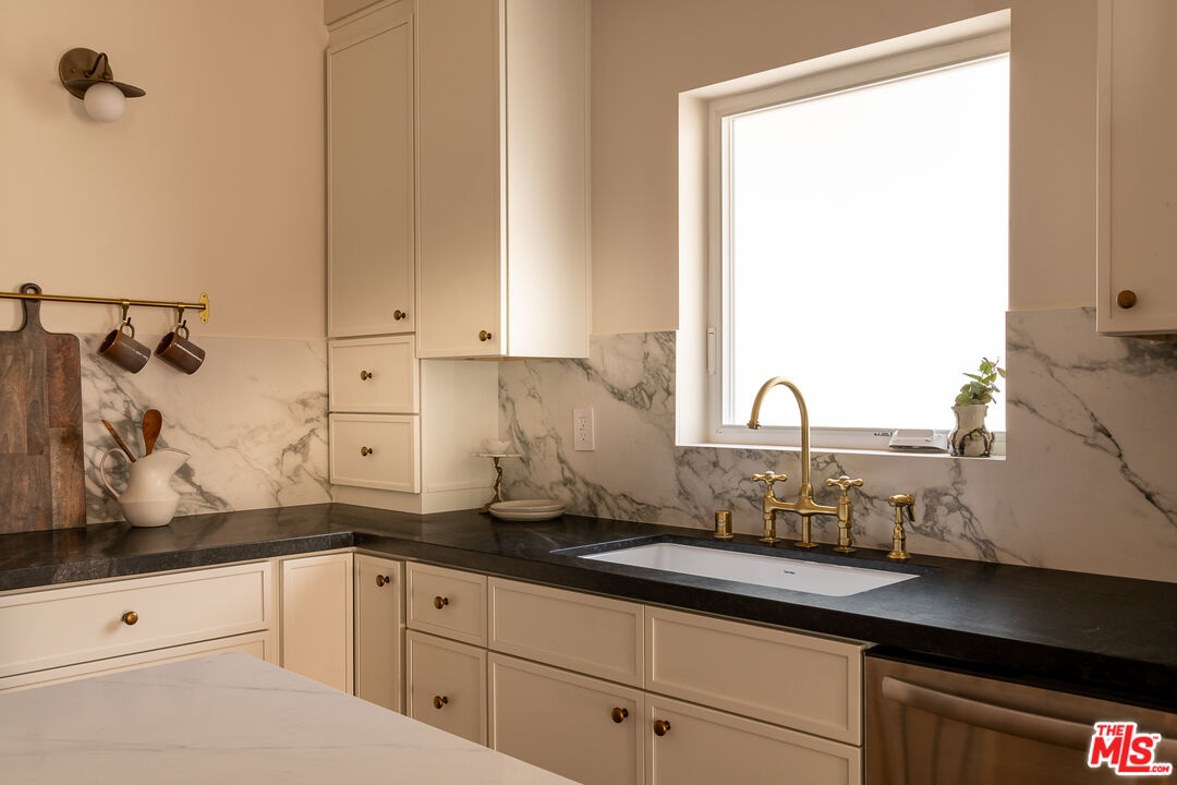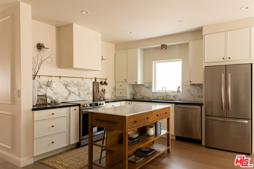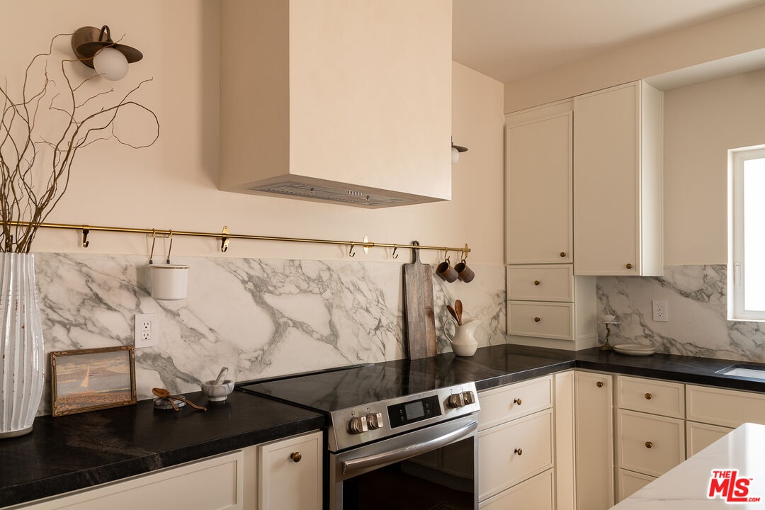 This newly constructed 3-bed, 3-bath Spanish-style residence by Cassa Design Studio blends timeless architectural character with a refined, design-driven vision in the heart of Mid-Wilshire. Light-filled interiors offer an effortless flow, with the main level anchored by a designer kitchen ideal for entertaining. Dark granite countertops, a striking Arabescato porcelain backsplash, brass pot rail detailing, and a custom Portola Roman clay range hood introduce depth and texture, while a built-in dining nook adds both function and thoughtful design. The private outdoor patio extends directly from the living and dining areas, creating a seamless indoor-outdoor connection ideal for everyday living and entertaining, all set against lush, Mediterranean-inspired landscaping. A moody green Roman clay powder room adds a rich, design-forward moment on the main level. Upstairs, three generously sized bedrooms offer comfort and privacy, including a spacious primary suite with a customizable walk-in closet and a private balcony finished with zellige-inspired terracotta tile. The primary bath is designed with intention, featuring a double vanity and an oversized walk-in shower with black penny marble flooring and refined Arabescato porcelain surfaces. A full third bath is equally considered, incorporating sage green zellige-inspired tile and classic Spanish flooring. Curated brass fixtures and statement lighting bring warmth throughout. Additional features include HVAC, hardwood flooring, a full laundry room, Integrated A/V wiring (Cat6), paid off solar panels, Ring doorbell, and Nest thermostat. The property is gated and secured, with dedicated parking and an EV charging outlet. Situated in a highly coveted neighborhood near Museum Row and the upcoming Purple Line, and just around the corner from Lassens, Republique, All Season Brewing Company, Met Her At A Bar, LACMA, and Hancock Park, this residence offers a refined blend of design, comfort, and modern living.