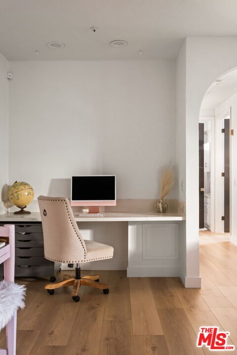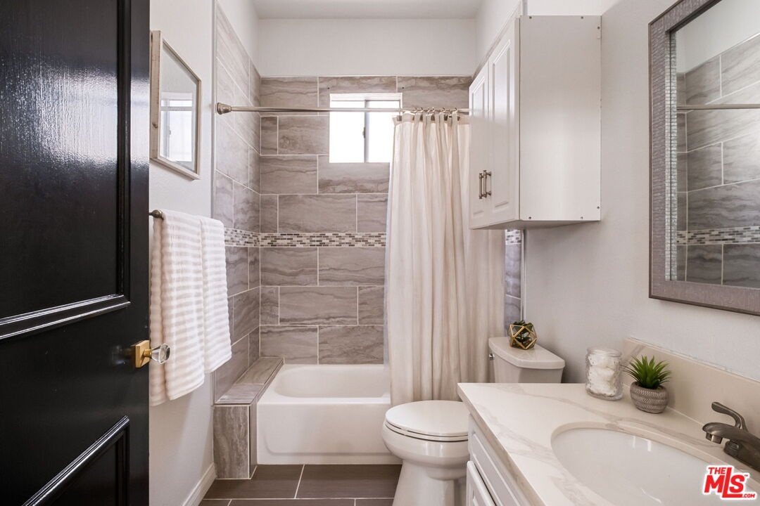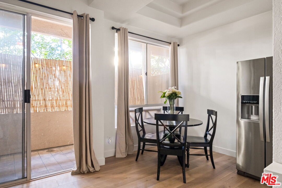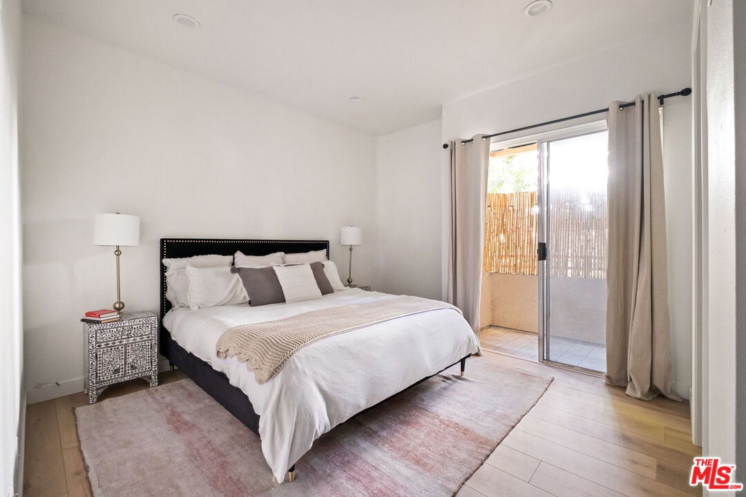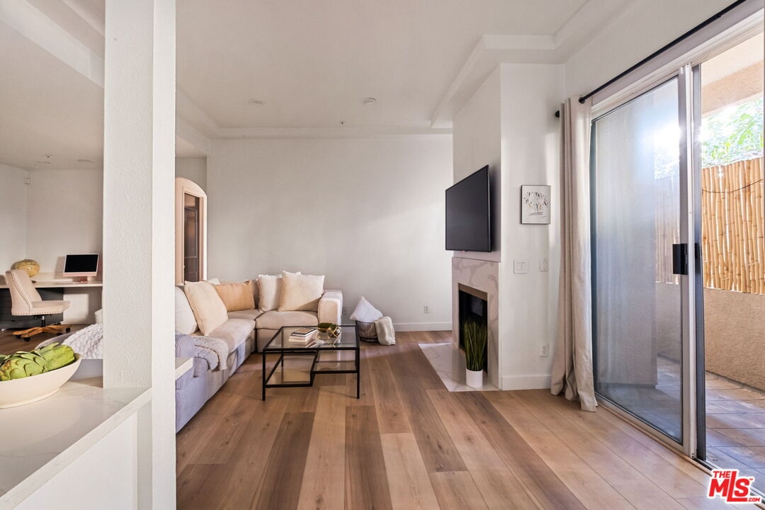 Welcome to this beautifully updated corner rear 2-bedroom, 2-bathroom condo just moments from Hancock Park and Larchmont Village, offering 1,180 SF of bright, open living. The thoughtfully designed layout connects the living, dining, and kitchen areas, creating a space that feels open and inviting. Large windows and sliding glass doors bring in natural light and open to a private patio, enhancing the indoor-outdoor flow. Elevated above street level, the unit offers added privacy while still maintaining convenient access. The kitchen is clean and modern, featuring quartz countertops, a herringbone backsplash, stainless steel appliances, and bar seating ideal for casual dining and entertaining, plus a built-in desk for a convenient work-from-home setup. Both bedrooms are generously sized with walk-in closets, and the primary suite offers direct patio access and an en-suite bathroom with dual vanities, a soaking tub, and a separate shower. Additional features include a dedicated laundry room with storage, new flooring throughout, recessed lighting, a decorative fireplace, and a new HVAC system. The secure building offers gated parking with two tandem spaces and guest parking. A well-designed, move-in-ready home in a central, highly desirable location.