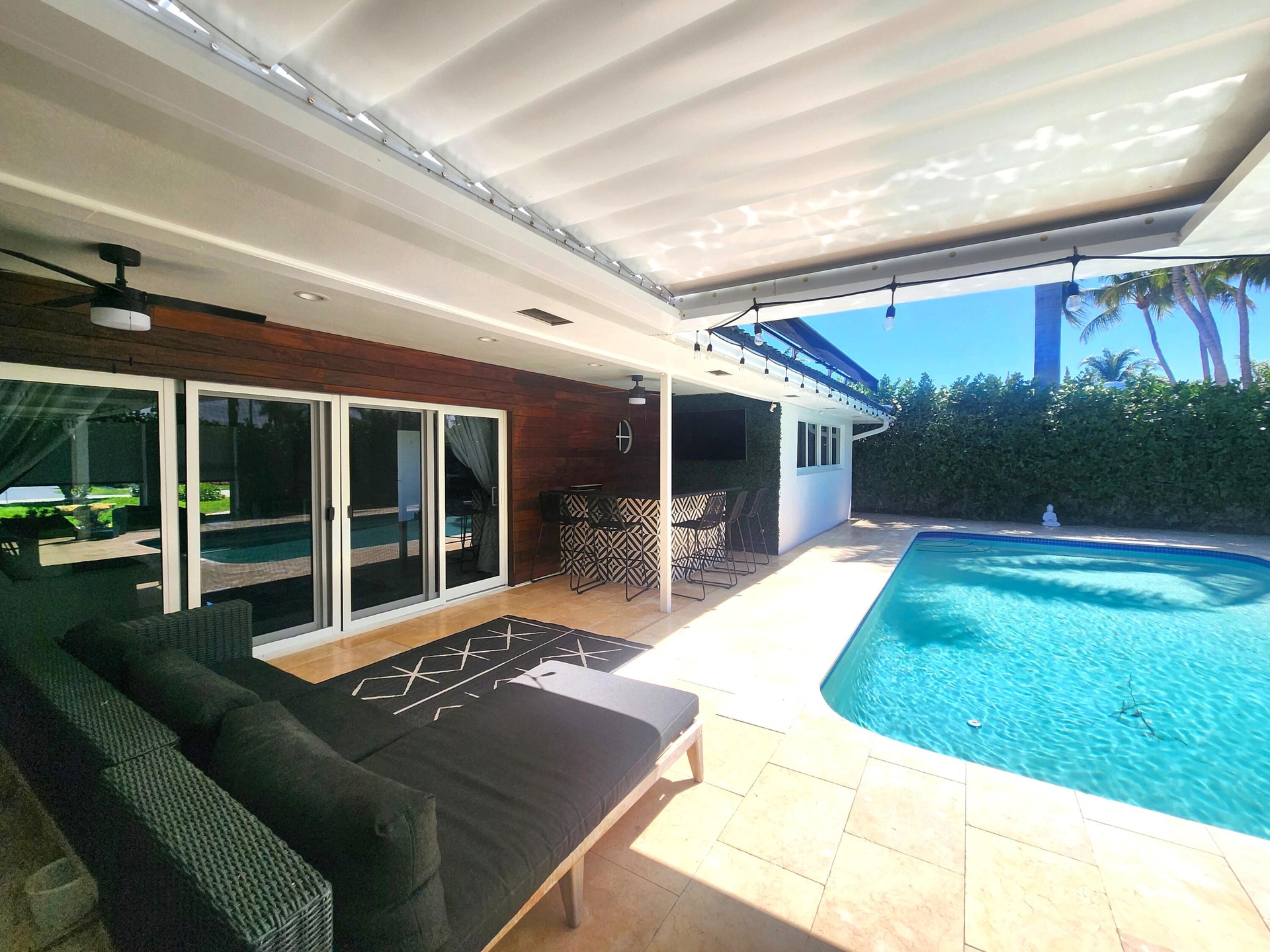 The BEST street in LHP invites you to live the life in this stunning pool home boasting the finest decor. Interior boasts beautiful neutral flooring, open kitchen w/tremendous island and additional dining area, cozy living space, and exceptional exterior living space that you will want to relax in forever. Kitchen features all white kitchen with gold accents, plenty of cabinetry, island, induction cook-top, upgraded hood, and more. Impressive primary suite offers plenty of space, built in closetry, and spacious master bathroom/spa to indulge. The exterior boasts fabulous deck with plenty of sitting area to entertain and relax, pergola for coverage and/or extra lighting, retractable awning, turf lounge area, exterior lighting and lavish palms surrounding your oversized swimming pool!