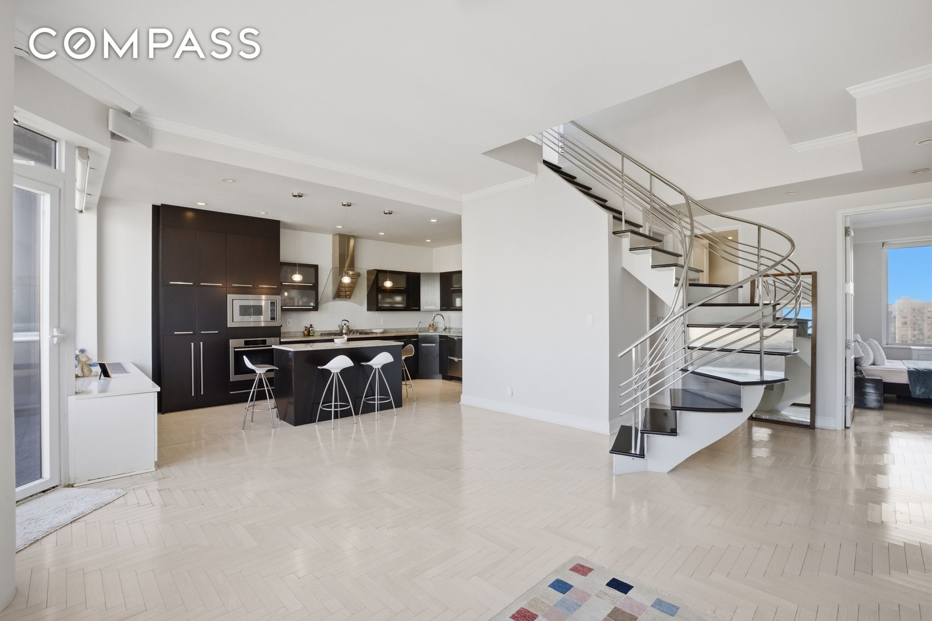 A dramatic curved staircase ascends to the upper level, unveiling an expansive living and entertaining space. A glass-encased solarium floods the floor with natural light while capturing extraordinary river and city panoramas. Just beyond, a sunken den opens onto a large south-facing terrace with sweeping views of the East River and dazzling Midtown towers—nighttime views here are truly unforgettable.