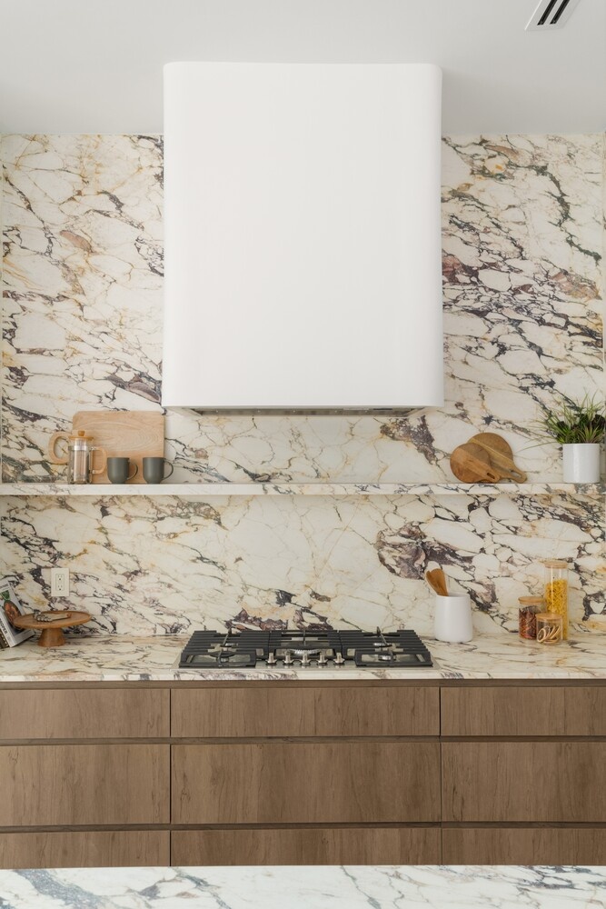 The primary suite occupies its own floor and is designed as a true retreat, offering exceptional scale, two walk-in closets, a separate office, and an ultra-luxurious bath finished with Viola stone and a freestanding soaking tub. The proportions are generous and serene, creating a private and comfortable escape within the home.