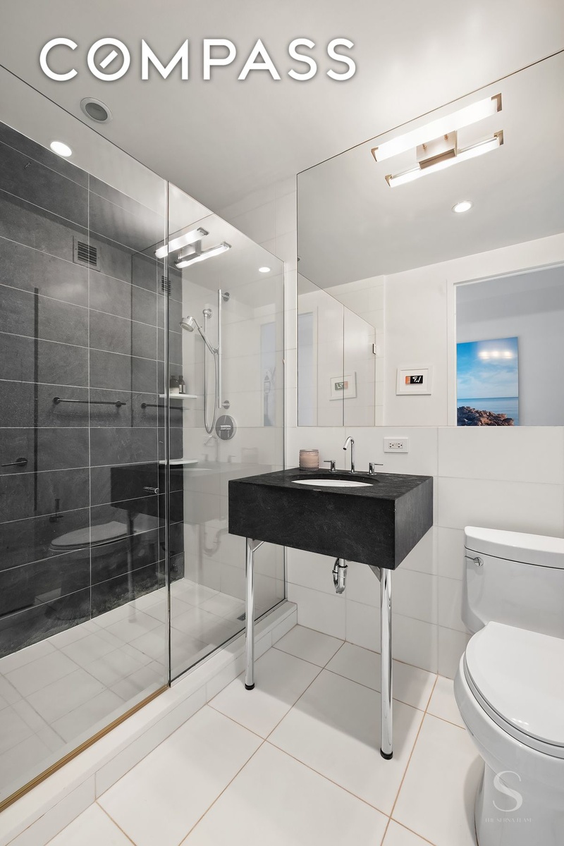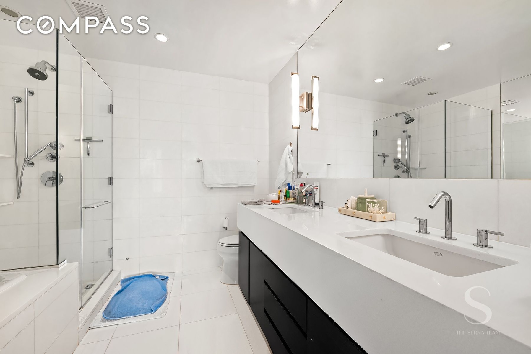 The primary suite is a true retreat, complete with a massive walk-in California Closet and a spa-like en-suite bathroom appointed with honed Glastos stone floors and walls, a Caesarstone double vanity, frameless glass shower, deep soaking tub, and radiant heated floors. The generously sized second bedroom easily accommodates a queen-size bed and also works beautifully as a home office, guest room, or nursery.