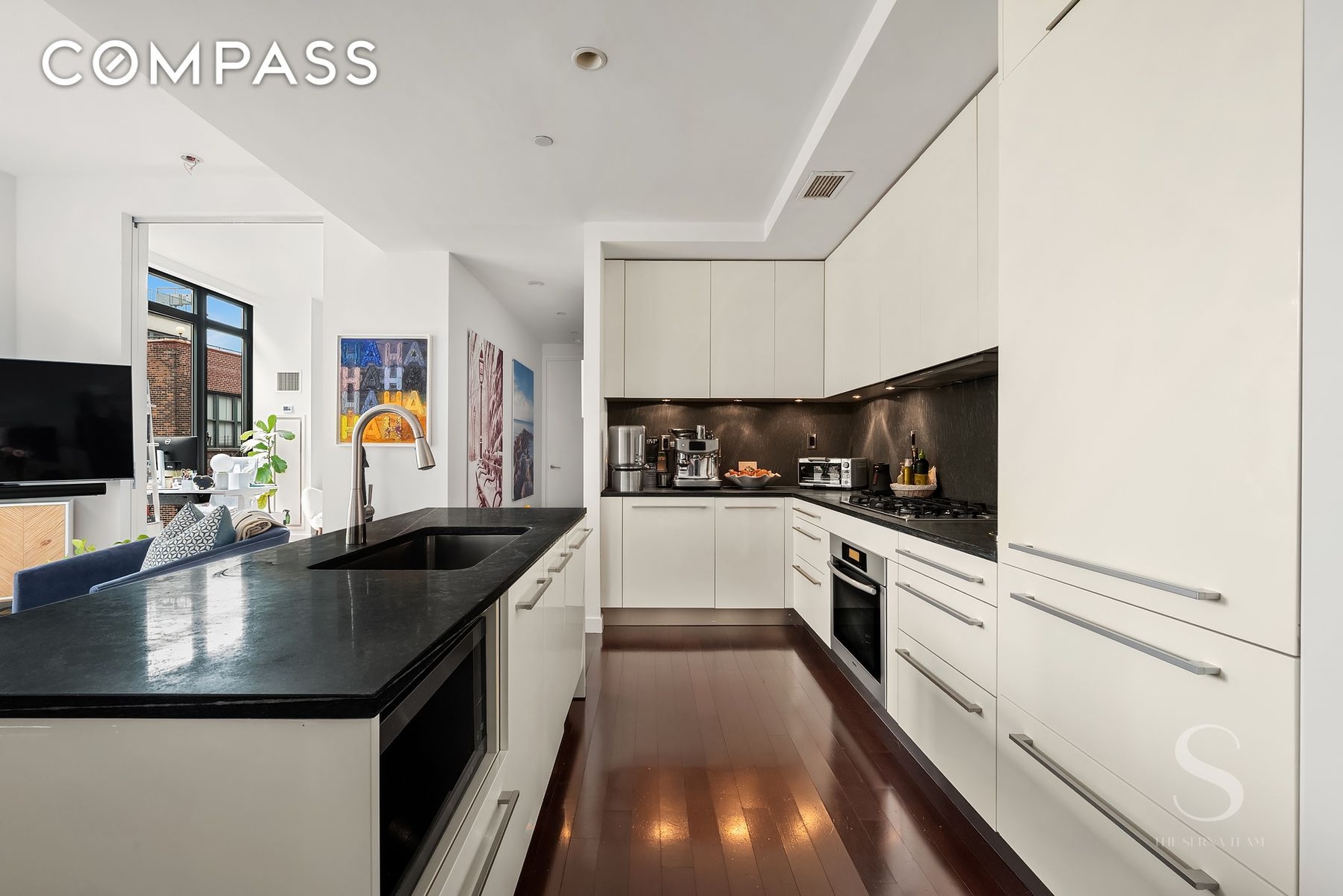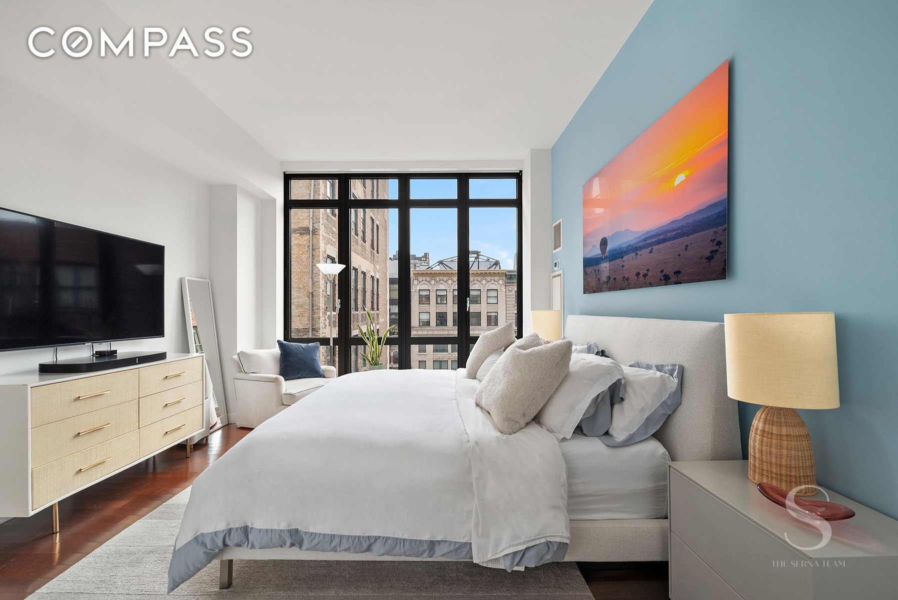 Bathed in southern light through floor-to-ceiling windows, this elegant residence offers the scale and warmth loft buyers crave, with 9.5-foot ceilings, dark oak hardwood floors, and an expansive open layout that is both stylish and functional. The spacious living and dining area is ideal for everyday living, entertaining, or displaying a curated art collection.