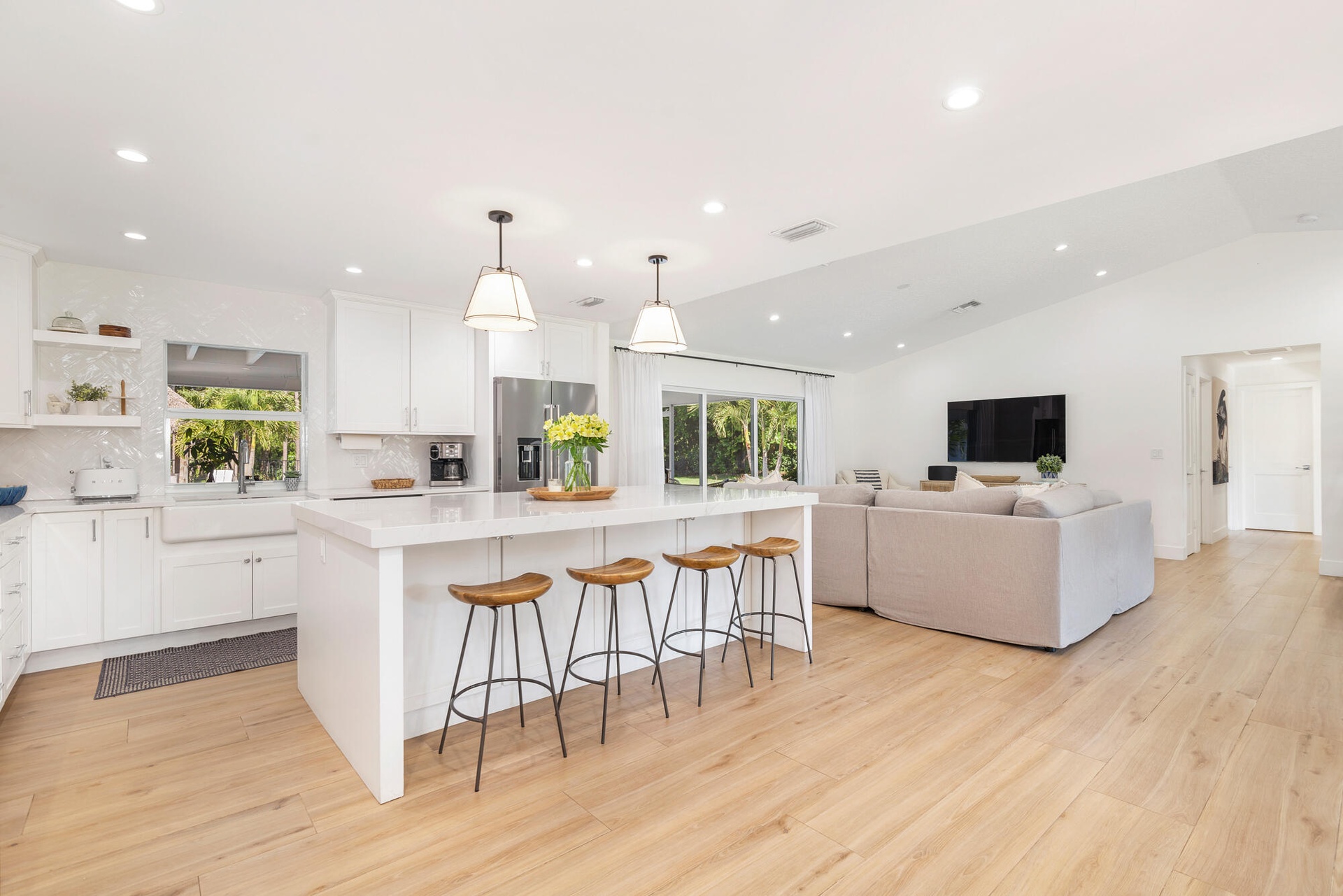 Located in the highly sought-after Horseshoe Acres Club, this beautifully updated home sits on a sprawling one-acre property within a private, 154-home gated community known for its space, privacy, and exceptionally low HOA of just $33/month. This residence underwent a complete renovation in 2020, featuring new exterior stucco, roof, impact windows, flooring, A/C system, bathrooms, and a stunning modern kitchen. The chef's kitchen is designed for both style and function, highlighted by a large center island with a built-in wine cooler—perfect for entertaining. Step outside to your private backyard oasis, completed in 2022. Enjoy a custom 36' x 15' heated pool with an attached 6' x 8' heated spa, along with a generous 9' x 15' sun shelf featuring two submersible lounge chairs. The expansive pool deck is finished in elegant white marble and includes a 21' x 15' tiki hut, creating the ultimate South Florida outdoor living experience. The screened patio also showcases matching marble flooring for a seamless indoor-outdoor flow. The fully fenced backyard offers both privacy and functionality. It features black aluminum picket fencing and a substantial 12' x 24' anchored shed complete with a roll-down garage door, rear entry, and window ideal for storage, hobbies, or a workspace. This is a rare opportunity to own a fully renovated estate property with resort-style amenities in one of Palm Beach Gardens' most unique and desirable communities.