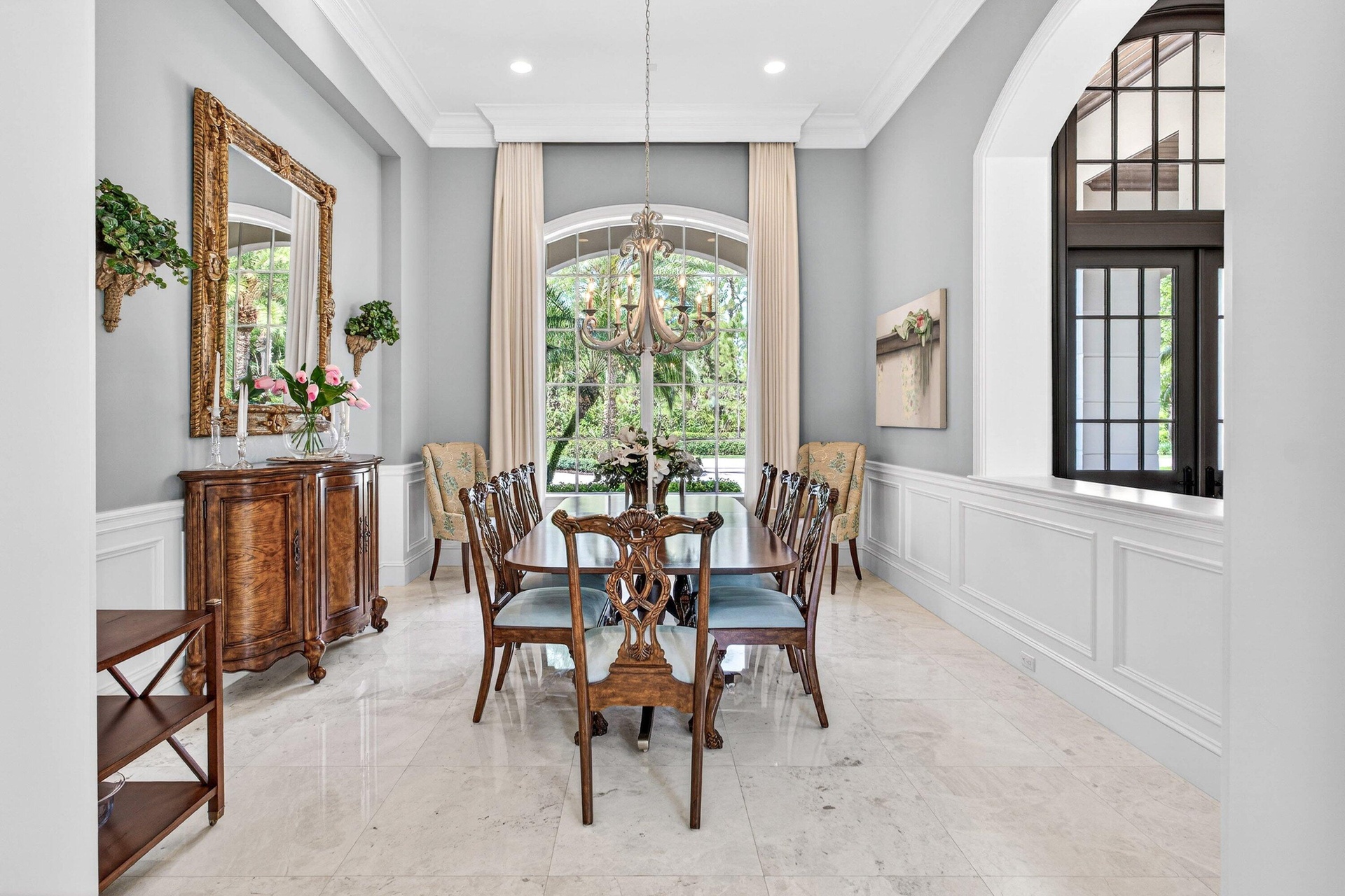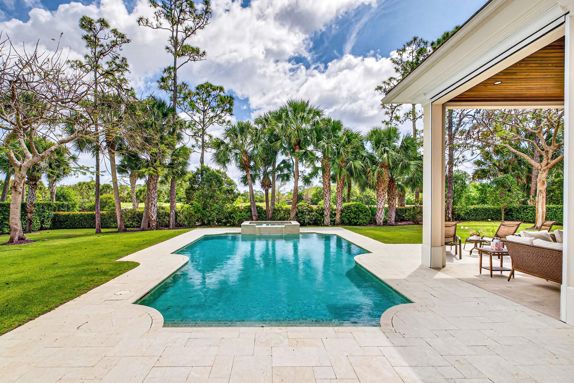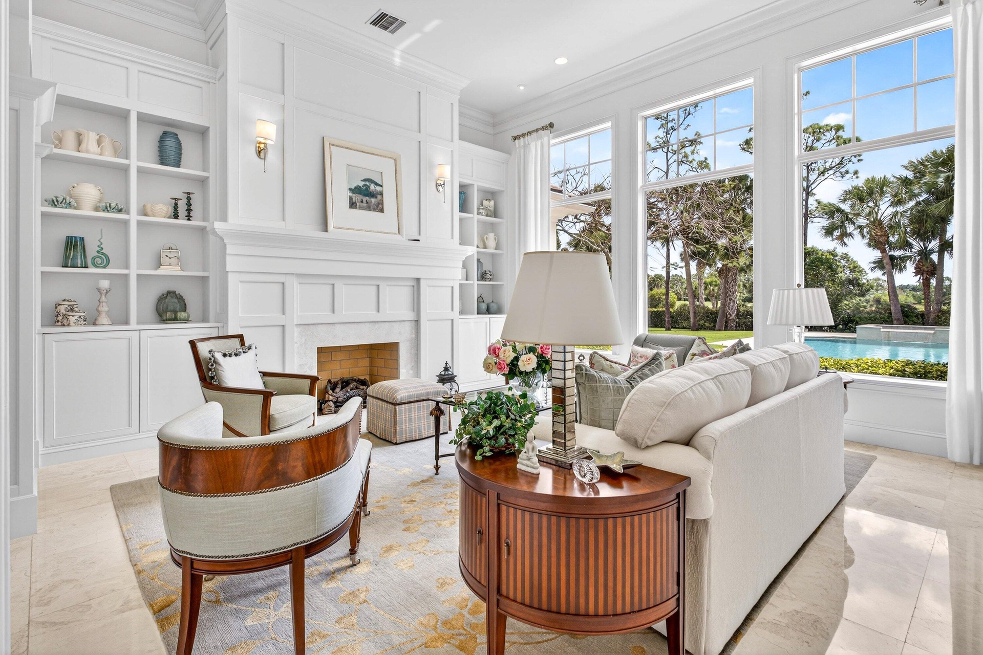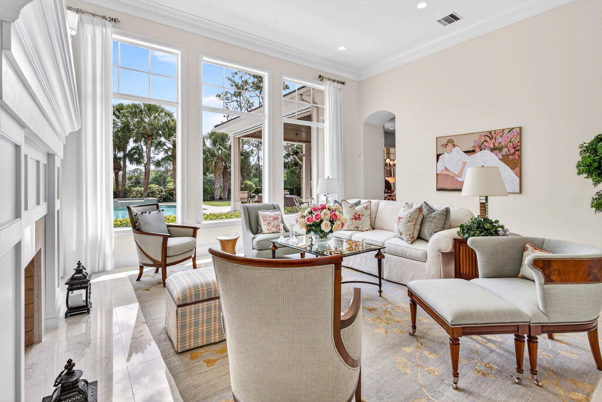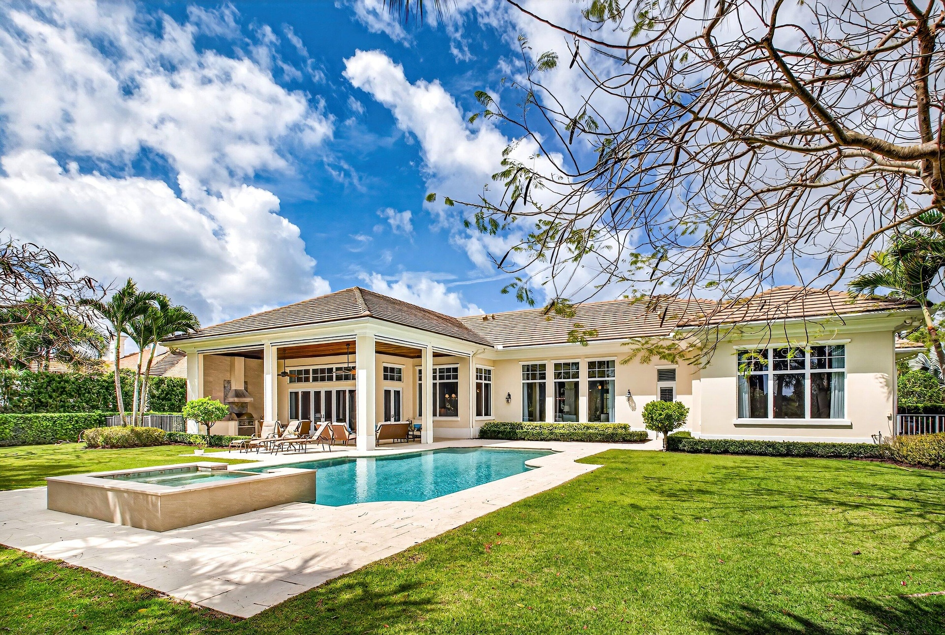 This recently built and meticulously maintained custom home sits on nearly two thirds of an acre on a quiet cul-de-sac in prestigious Old Marsh Golf Club. Water, golf course and marsh views abound in this light and airy home filled with window walls of glass. As you walk through each room, the attention to detail becomes obvious - wainscoting, crown molding, marble and wood floors, custom ceilings, window treatments, built ins & light fixtures. The gourmet island kitchen features white contemporary cabinetry, quartz countertops and Wolf and other top of the line appliances. The owners suite has two complete baths and two walk in closets with built in drawers and shelving. Each guest room has its own ensuite bath. Outside, the covered lanai houses a full summer kitchen and tranquil views. And then, of course there is Old Marsh itself, an exclusive, gated enclave of custom estate homes on half-acre or larger homesites, surrounded by protected nature preserves. The acclaimed Pete Dye-designed championship golf course offers no tee times, a nationally recognized caddie program, and ranks among the best in the country. Just minutes from beaches, the airport, excellent public and private schools and fine dining, shopping, and cultural attractions, this impeccably decorated and maintained home presents a rare move in ready opportunity in one of the Palm Beach's most sought-after private communities.