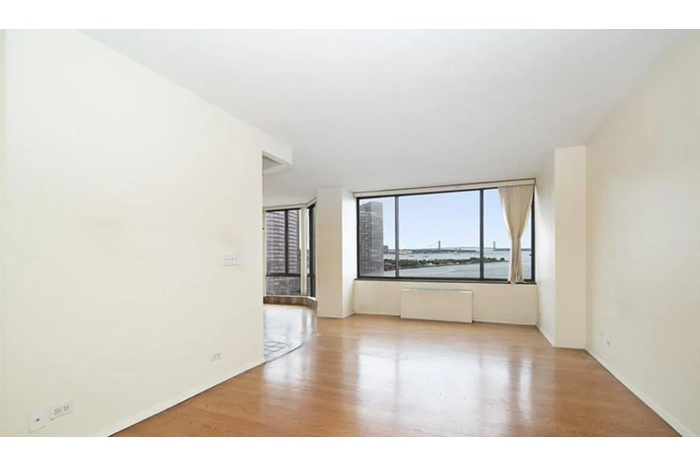 The spacious primary suite includes a walk-in closet and a luxurious marble bathroom. Both bedrooms enjoy bright eastern exposures with open city views and partial water vistas.